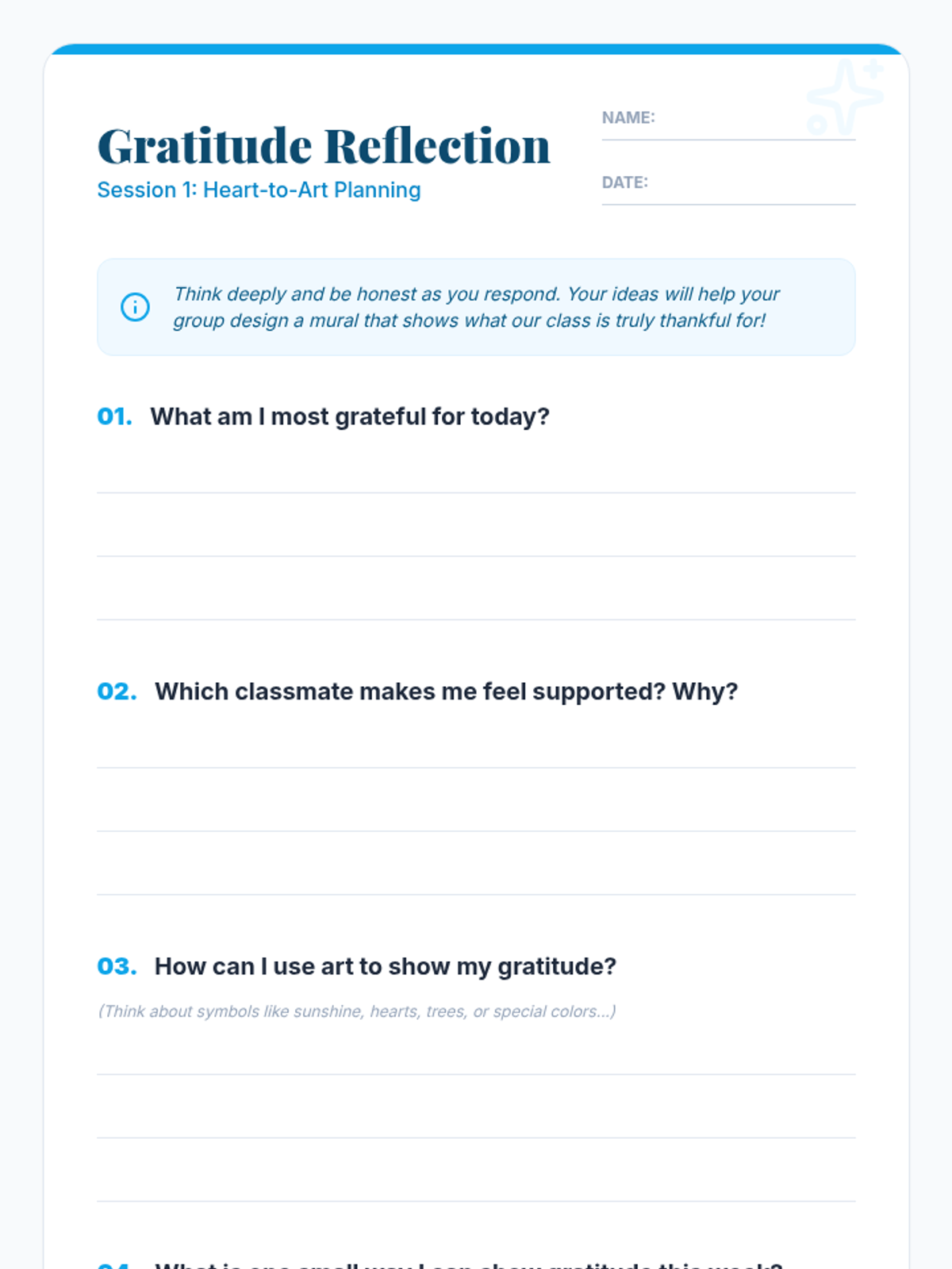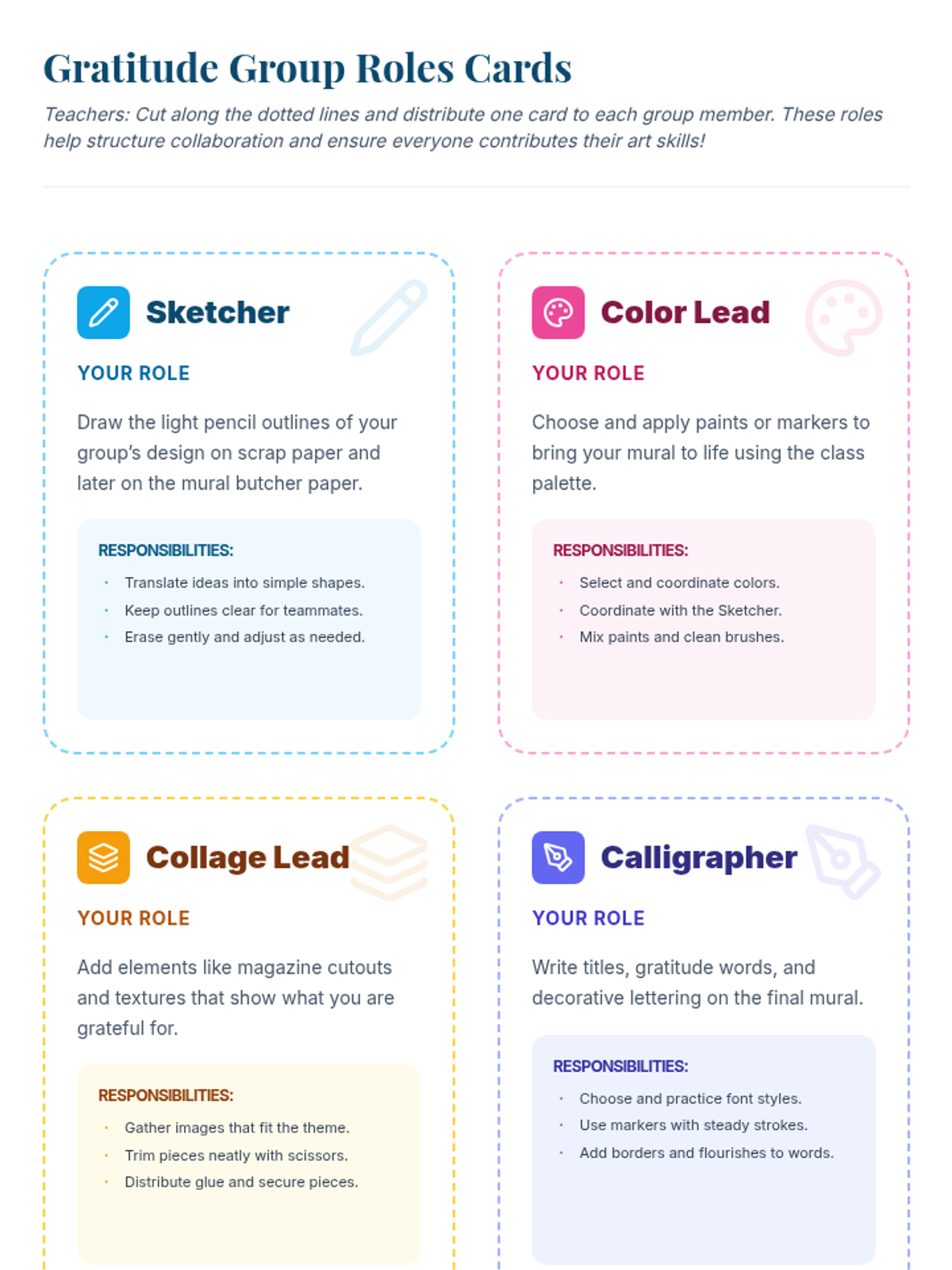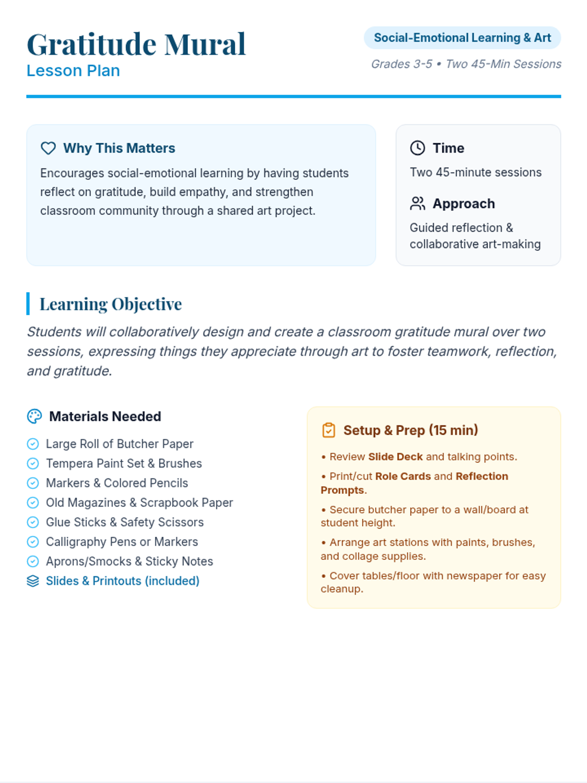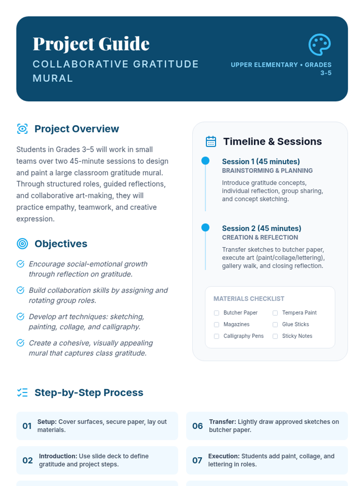 A two-session art and social-emotional learning project where students collaborate to create a large-scale gratitude mural. Focuses on reflection, teamwork, and various art techniques including painting, collage, and calligraphy.