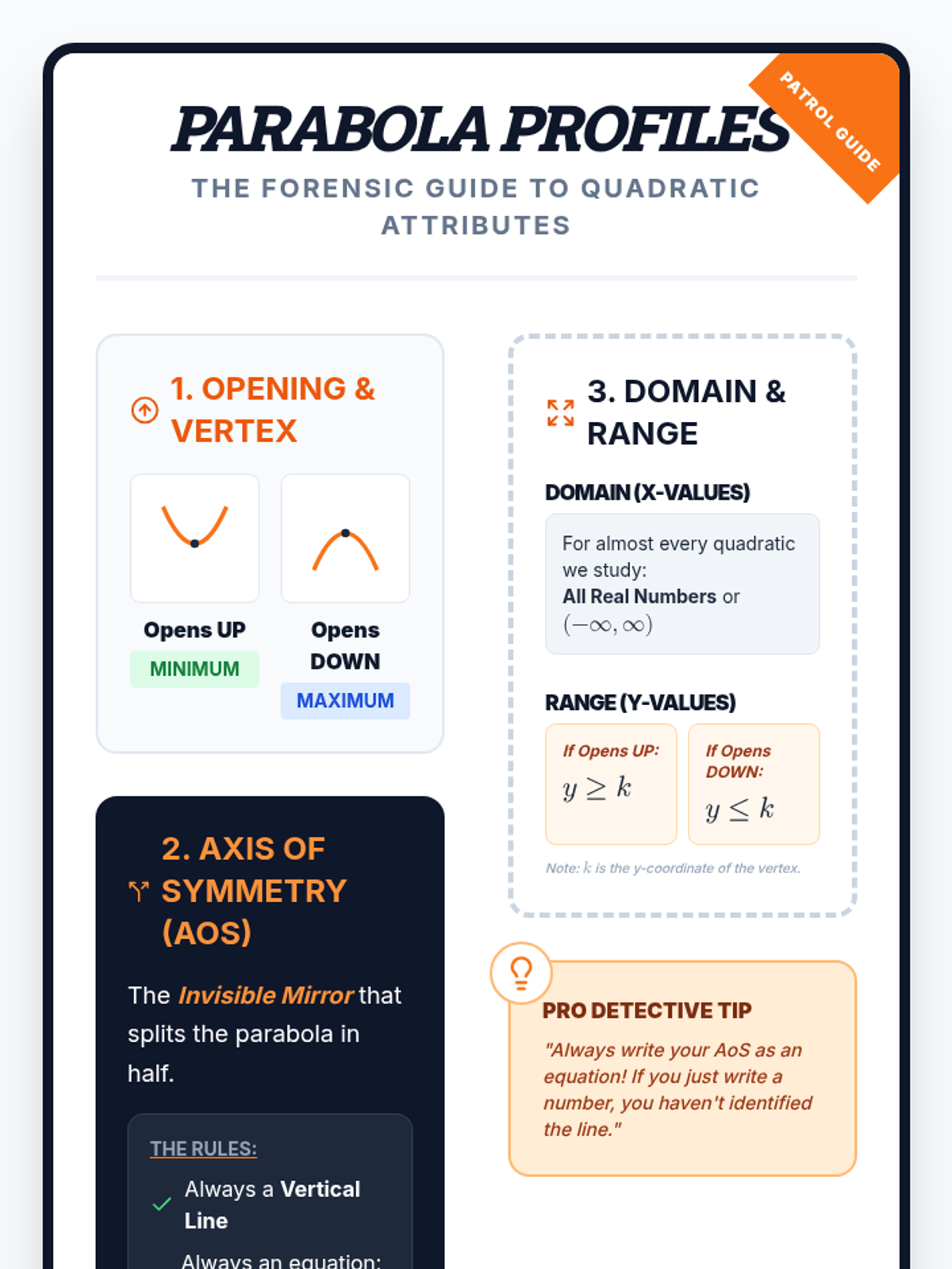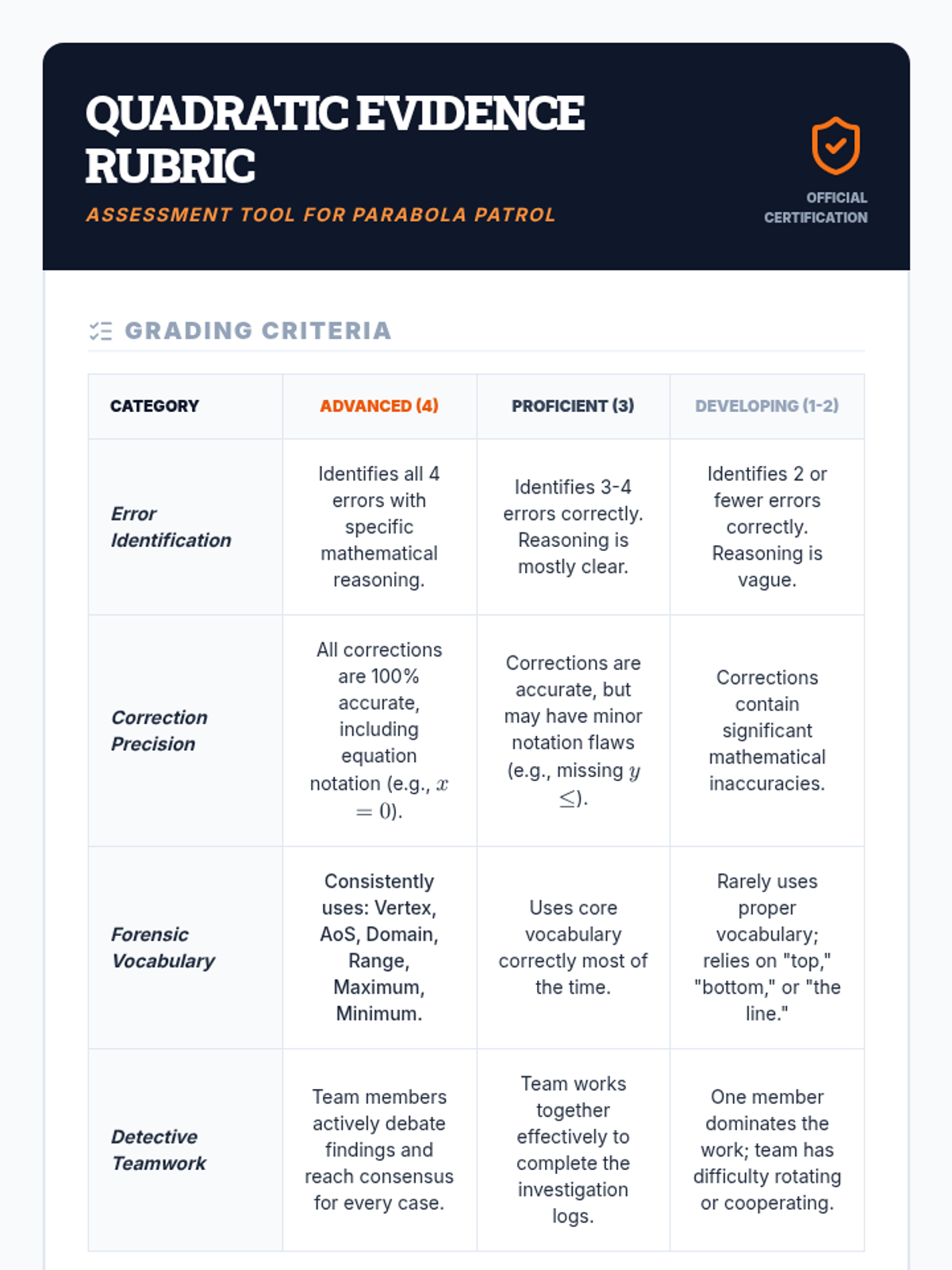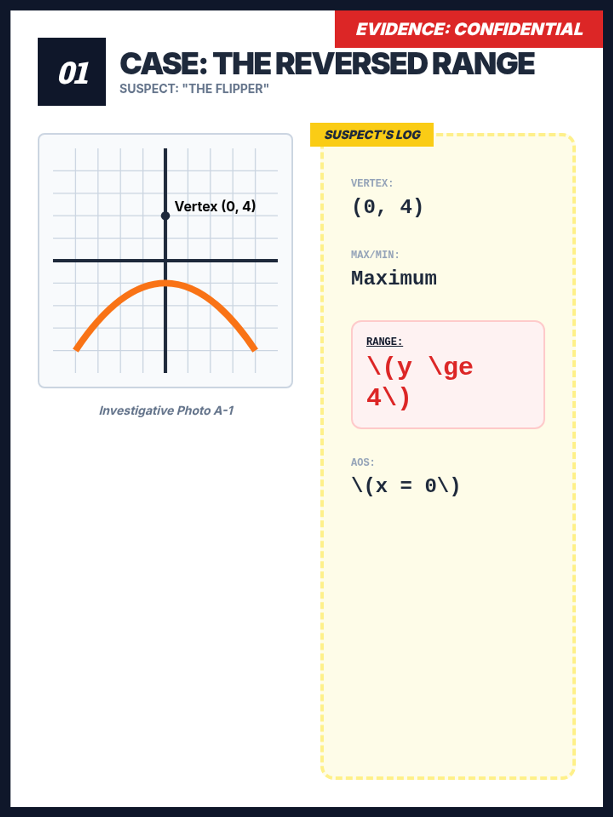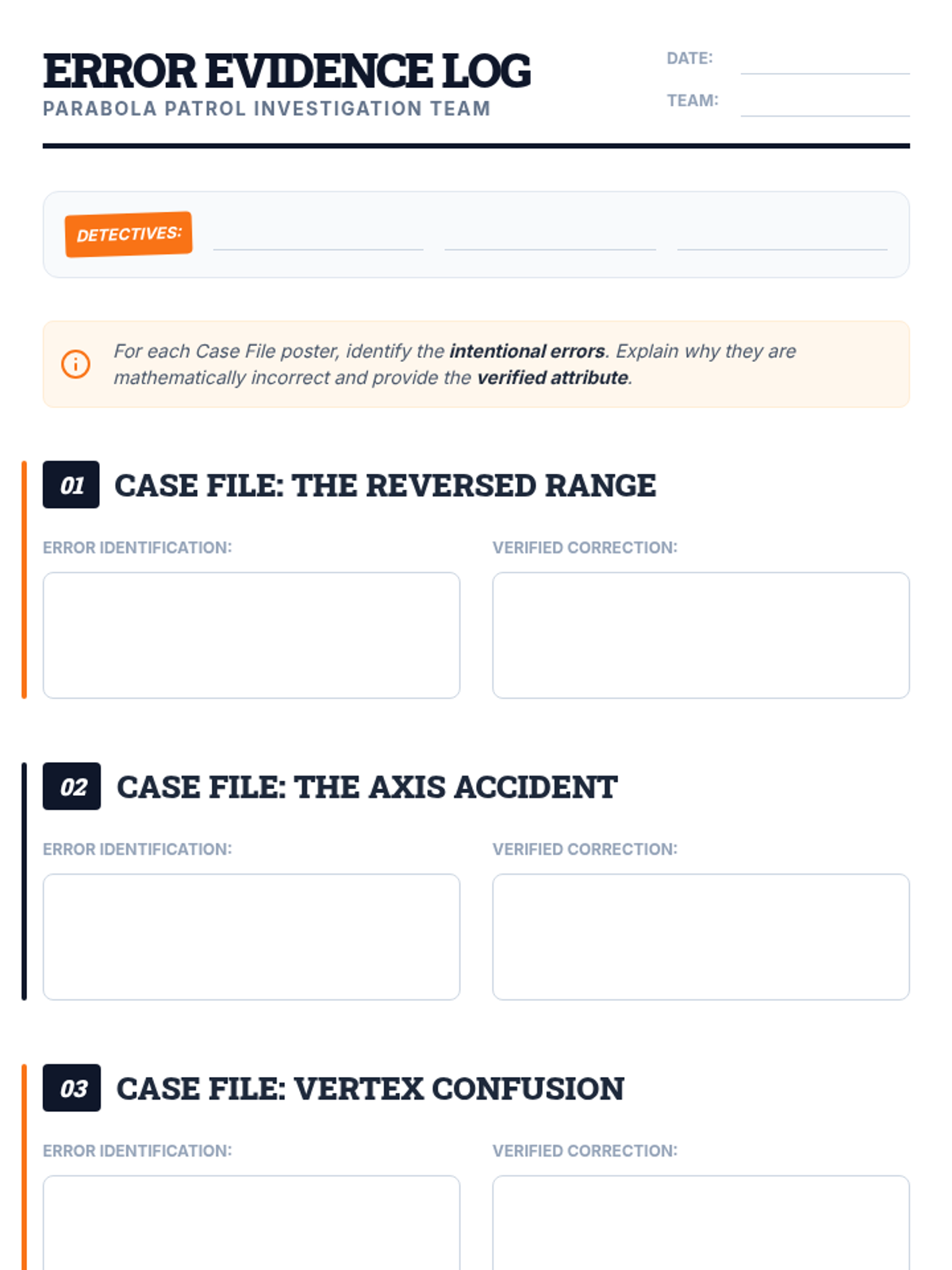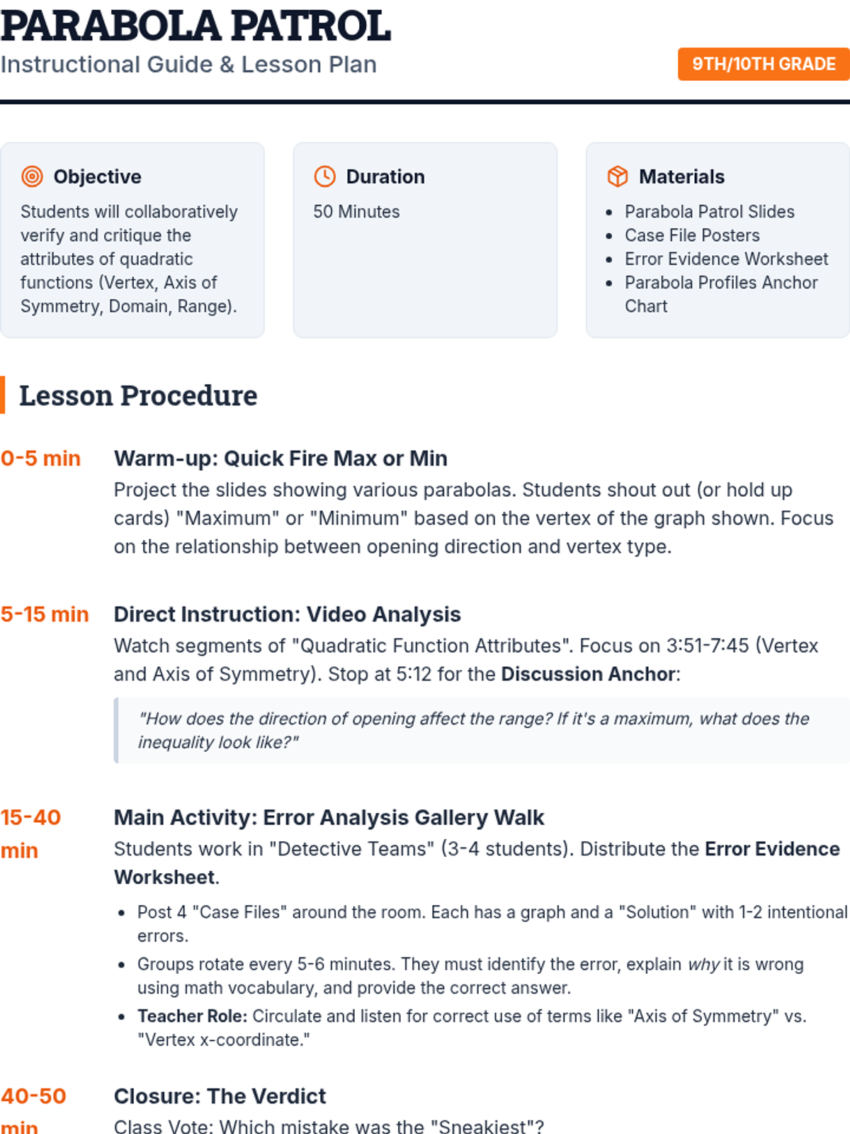 Students will collaboratively analyze and critique the attributes of quadratic functions through a detective-themed 'Error Analysis Gallery Walk'. This lesson utilizes video instruction to reinforce concepts of vertex and range before students move to hands-on investigation.
