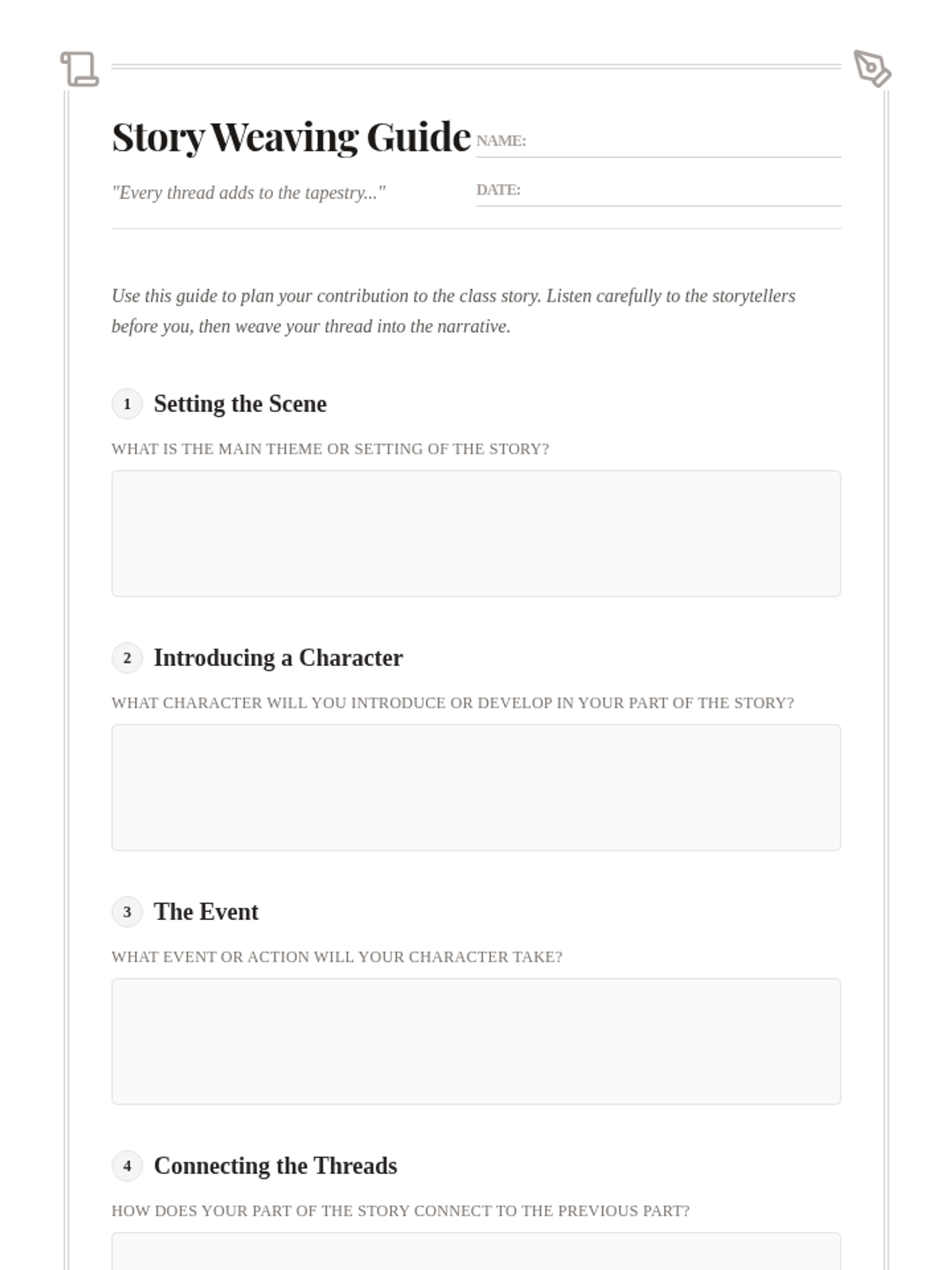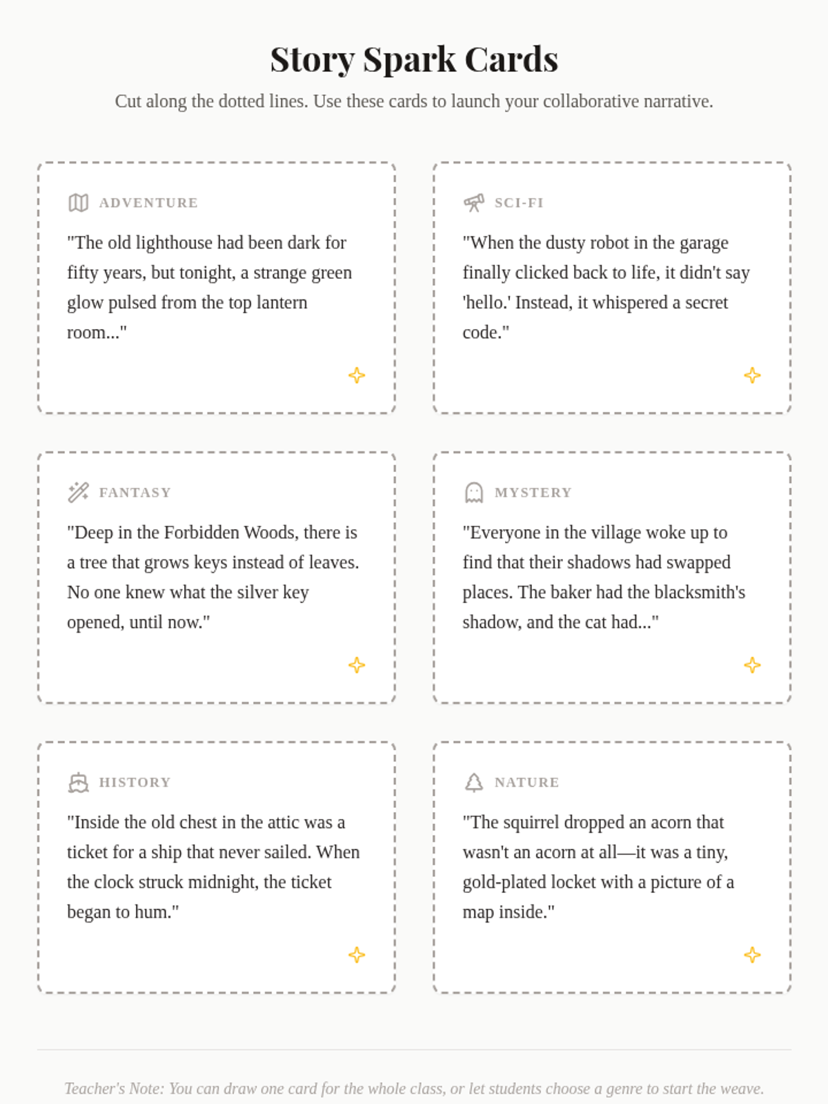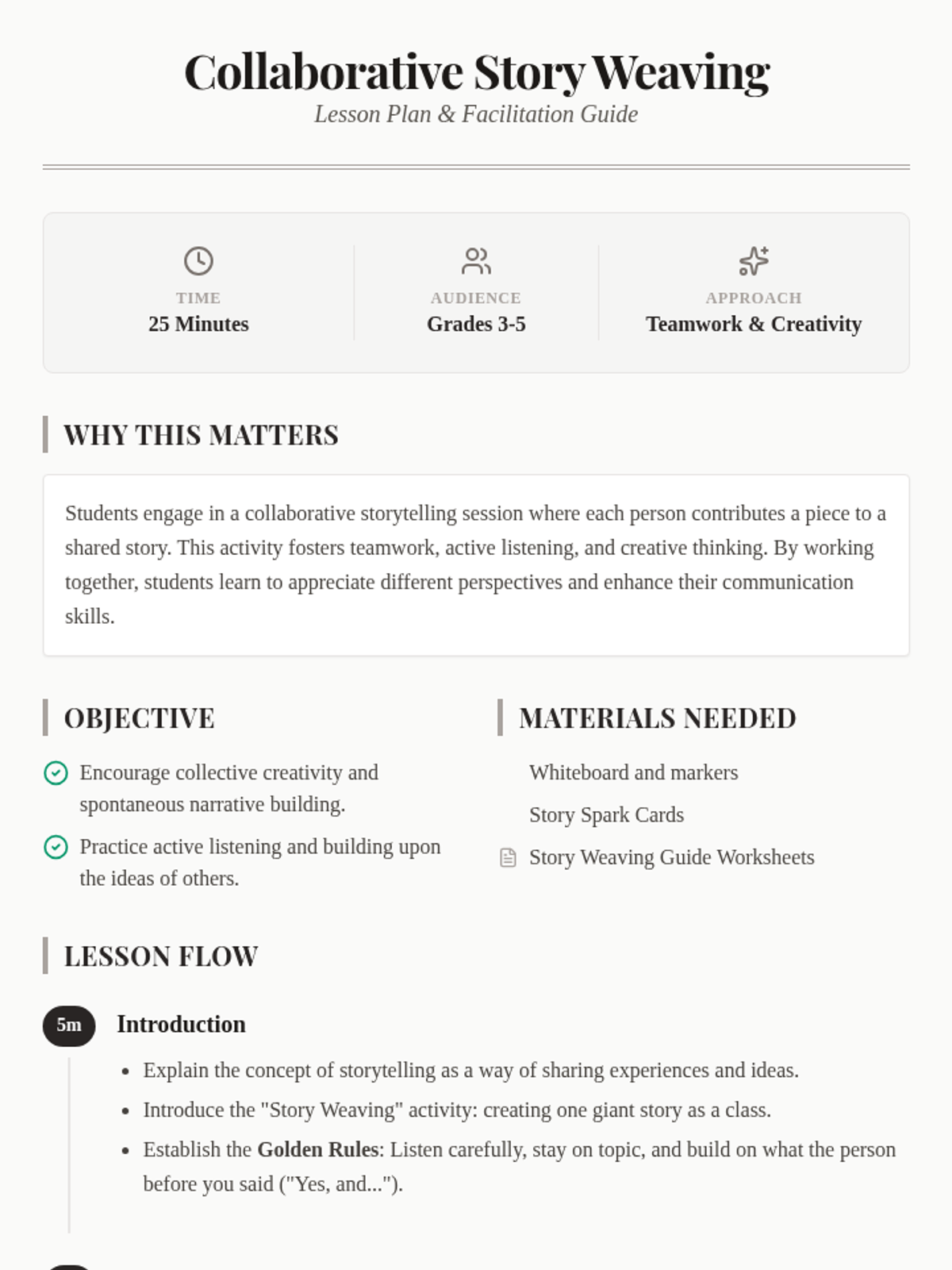 A collaborative storytelling lesson where students work together to build a shared narrative, focusing on teamwork, active listening, and creative contribution.
