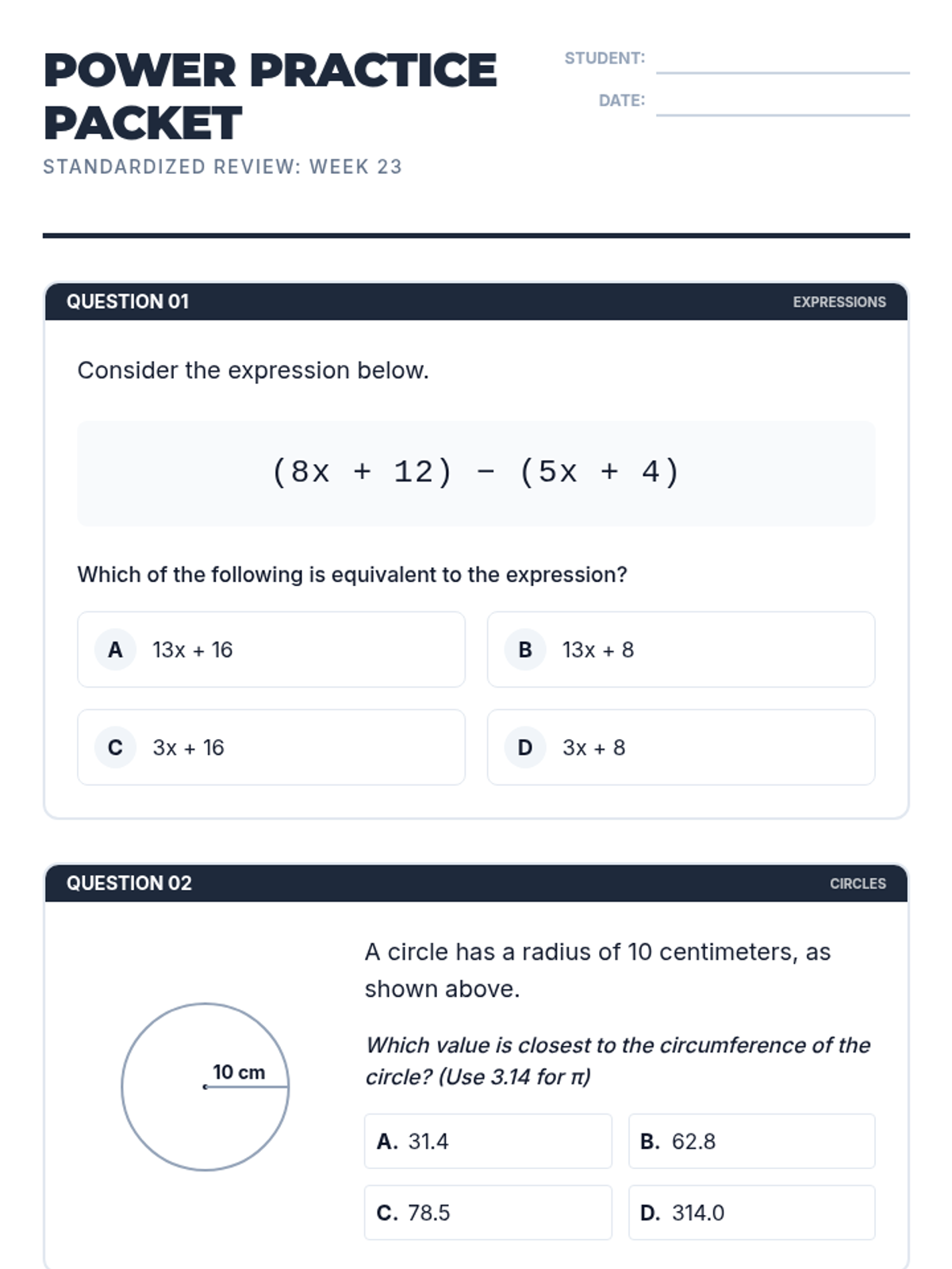 A comprehensive 20-question review packet and answer key covering 7th-grade math topics including linear expressions, circle circumference, percentage word problems, and unit rates.
