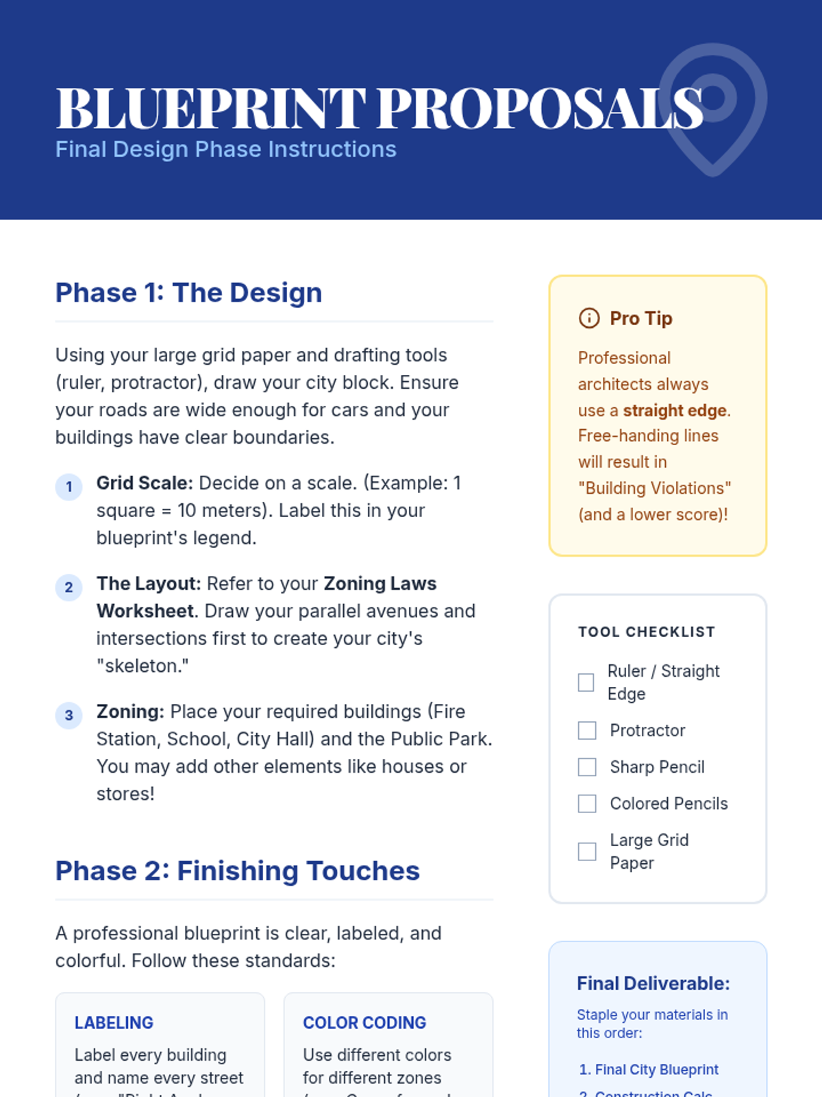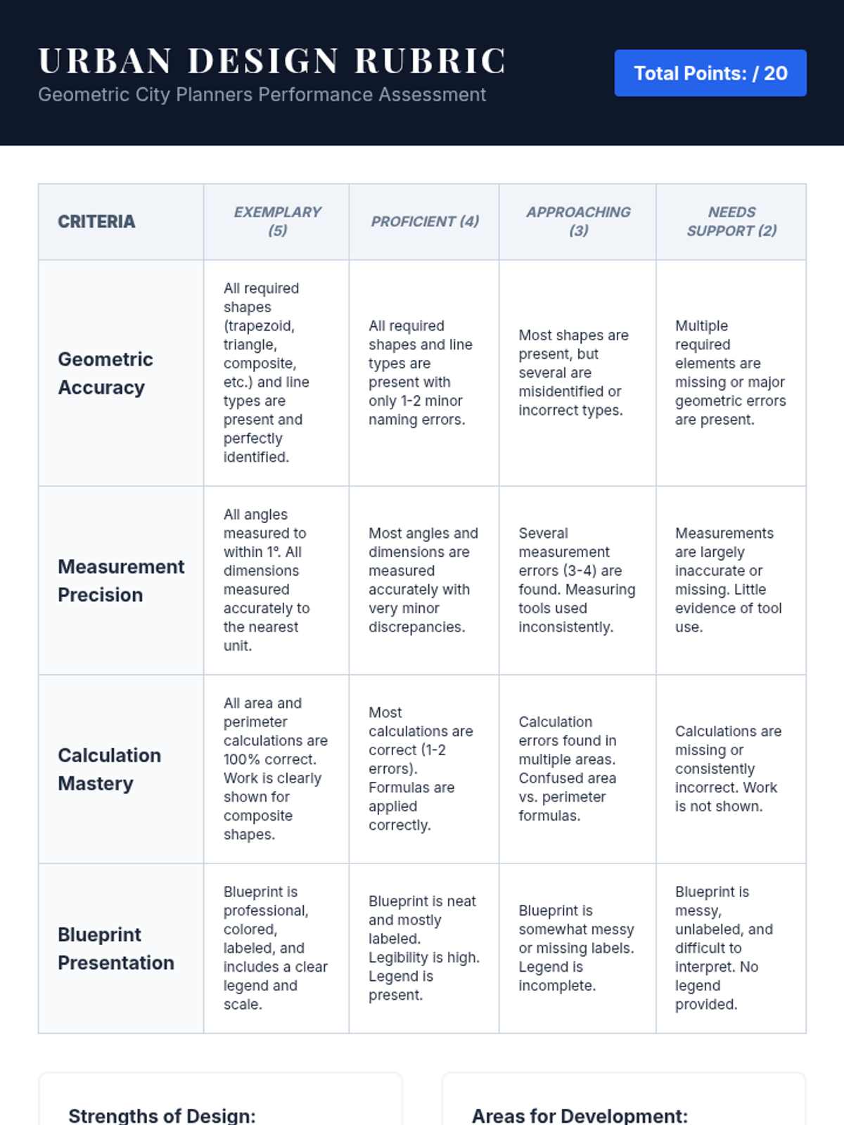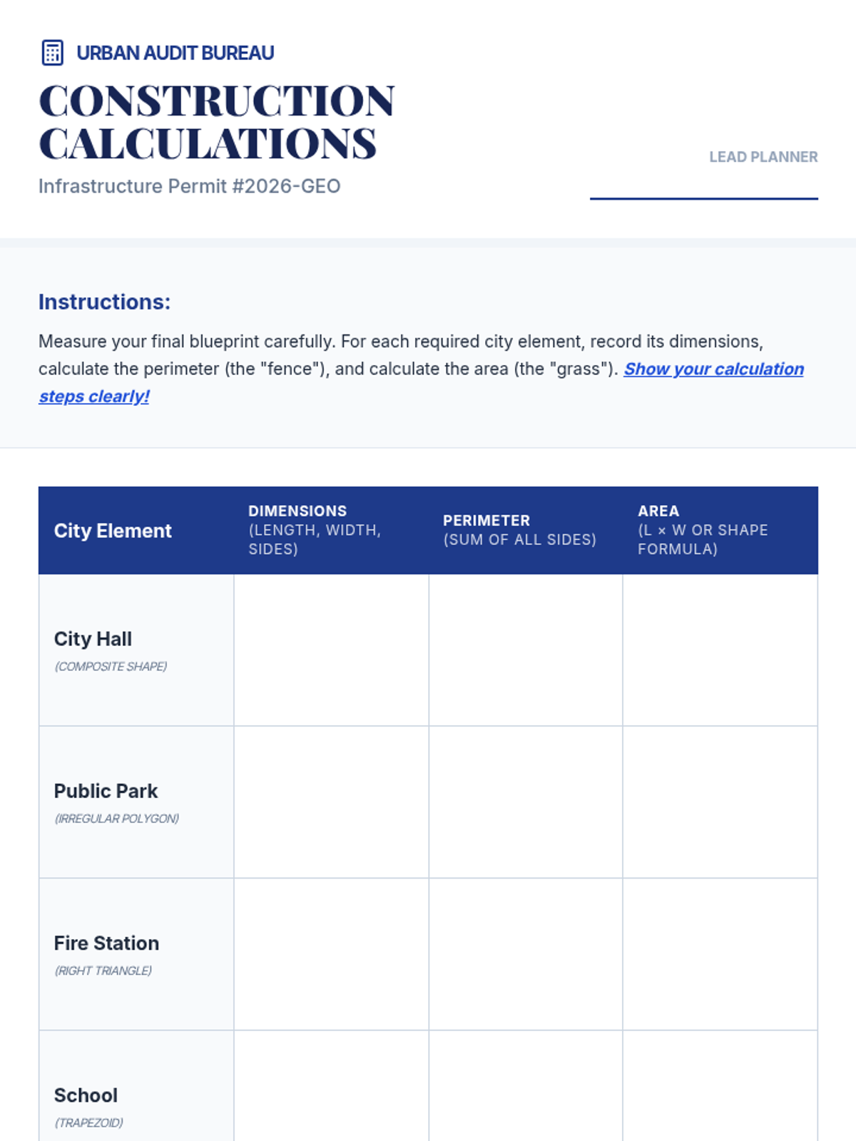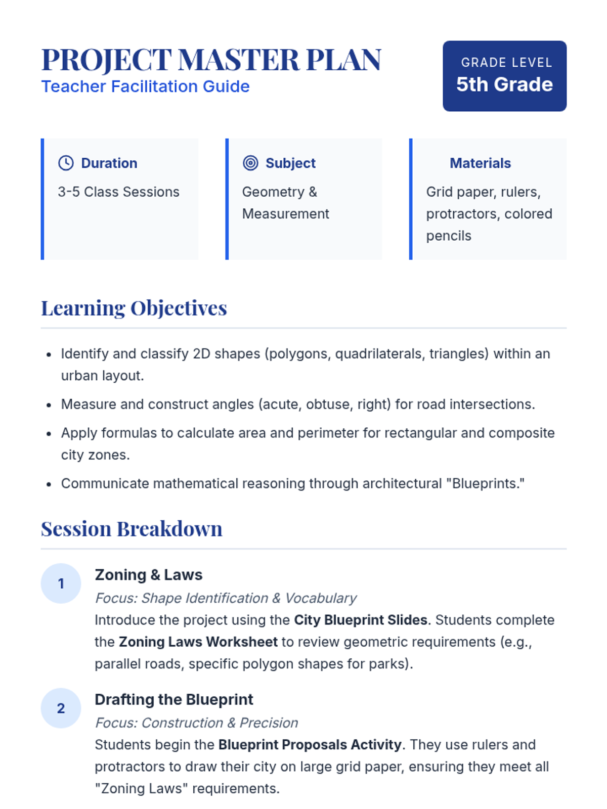 A hands-on geometry project where students act as urban planners to design a city using specific geometric shapes, angles, and area/perimeter calculations. Students will bridge the gap between abstract geometry and real-world architecture.