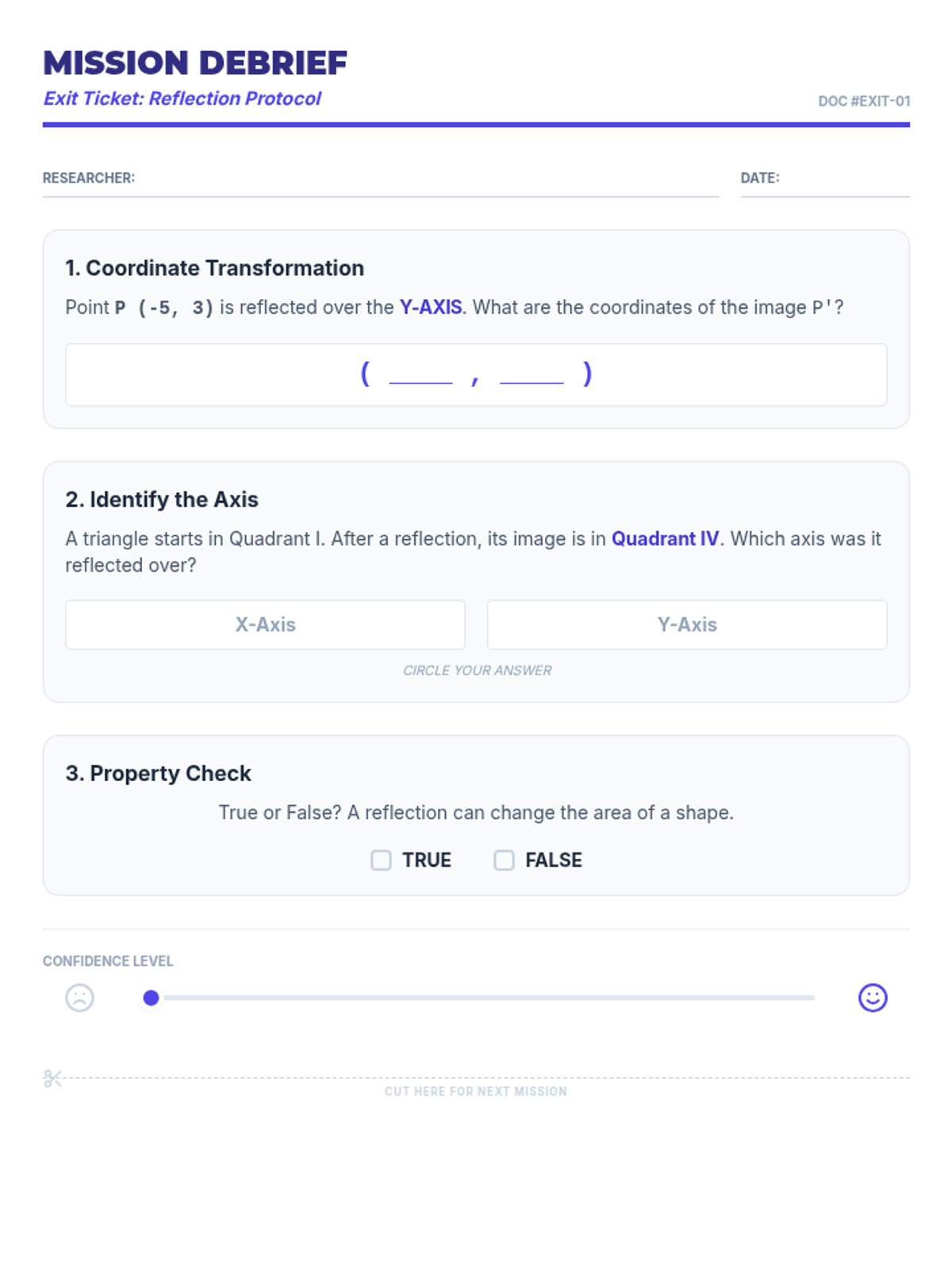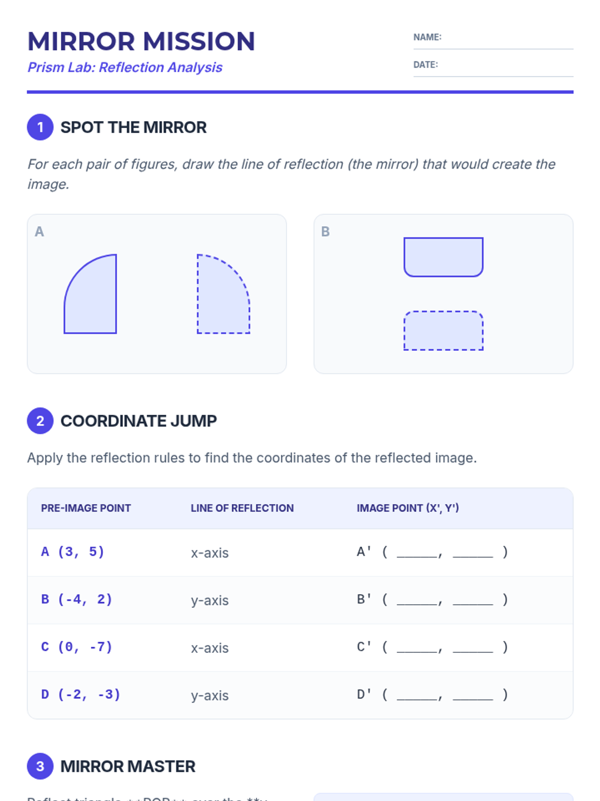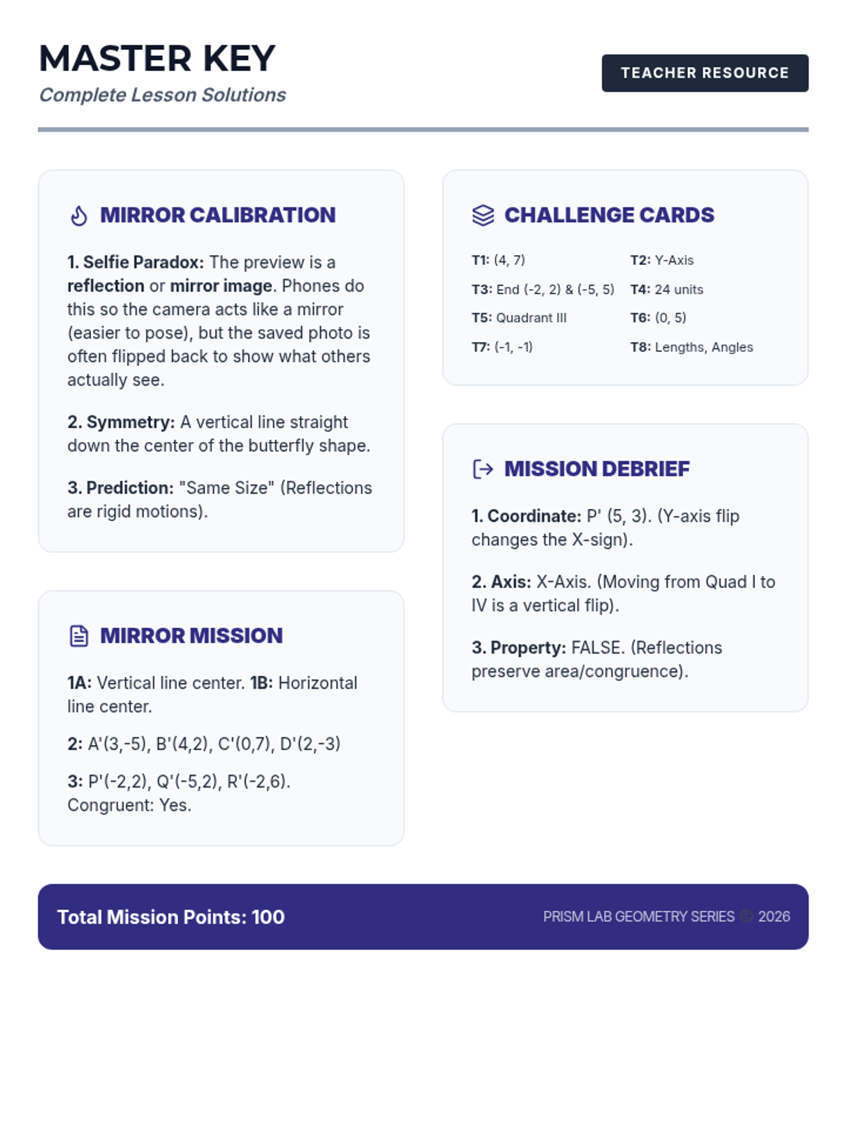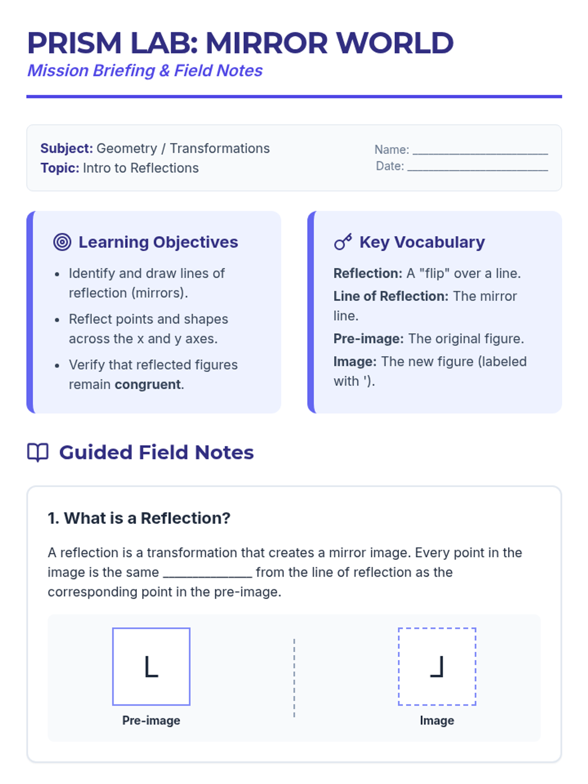 An introductory lesson on geometric reflections, covering lines of reflection, x and y-axis reflections, and the concept of congruence.