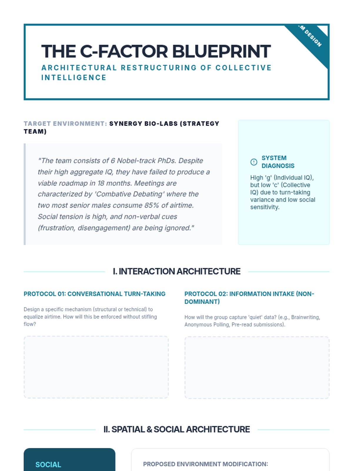 Students explore the 'c-factor' of collective intelligence and the social sensitivity required for high-performing teams. The lesson involves a design workshop to restructure team workflows for maximum problem-solving capacity.