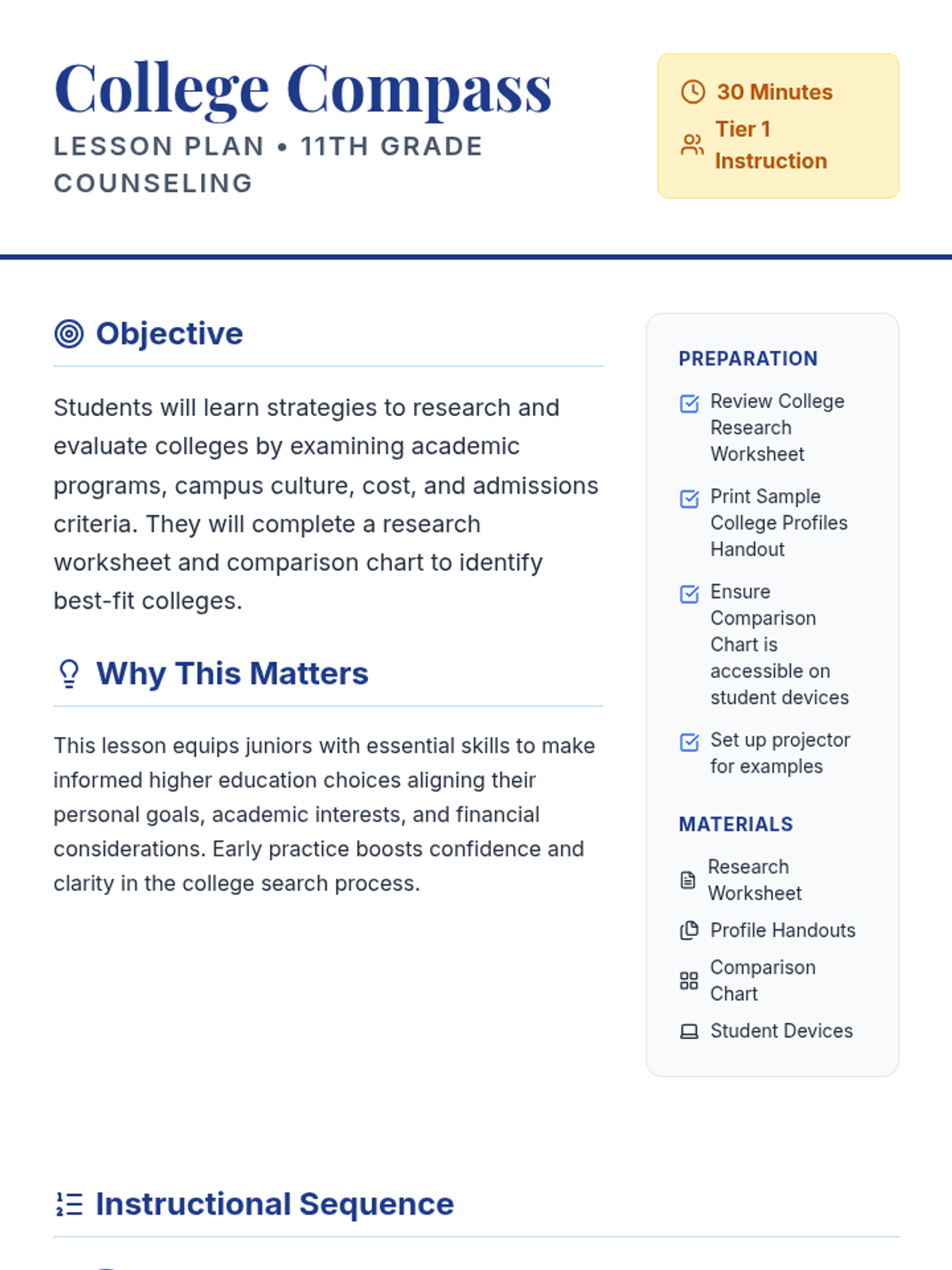 In this 30-minute lesson, 11th graders will learn strategies for researching and selecting colleges that fit their goals and preferences. This essential skill empowers students to make informed decisions about their future by exploring academic programs, campus culture, and admission requirements.
