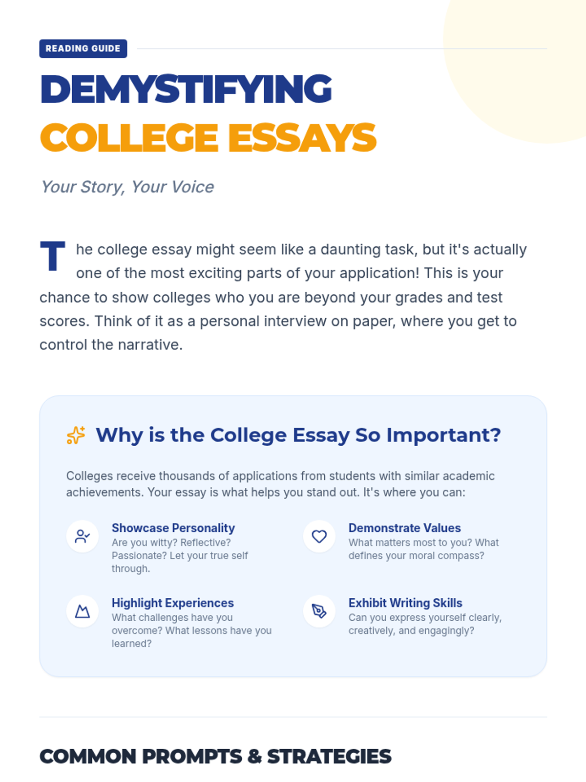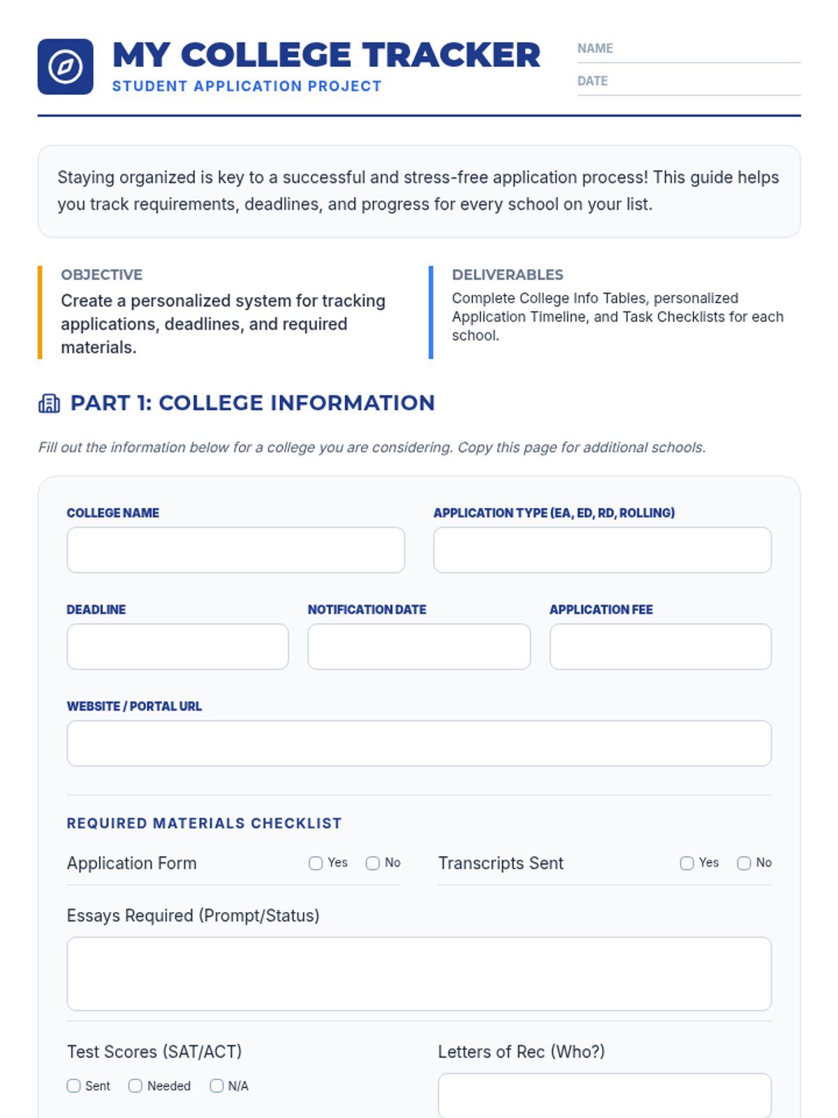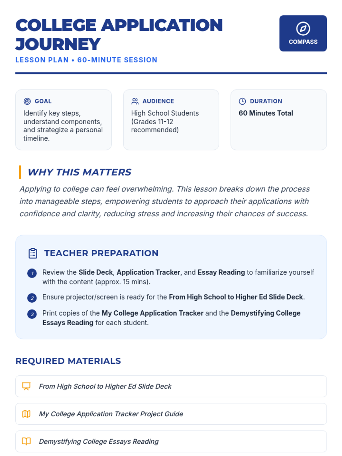 A comprehensive 60-minute session designed to help high school students navigate the college application process, covering research, deadlines, components, and essays.