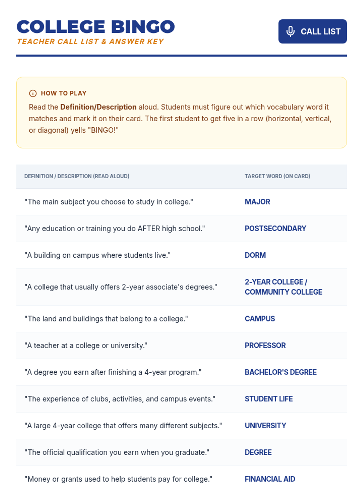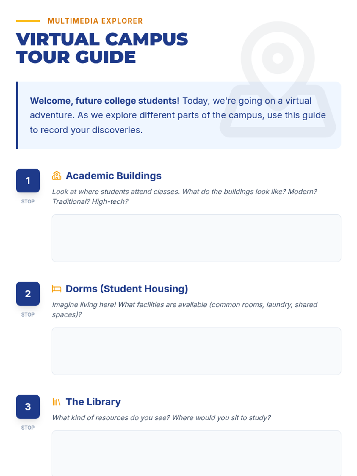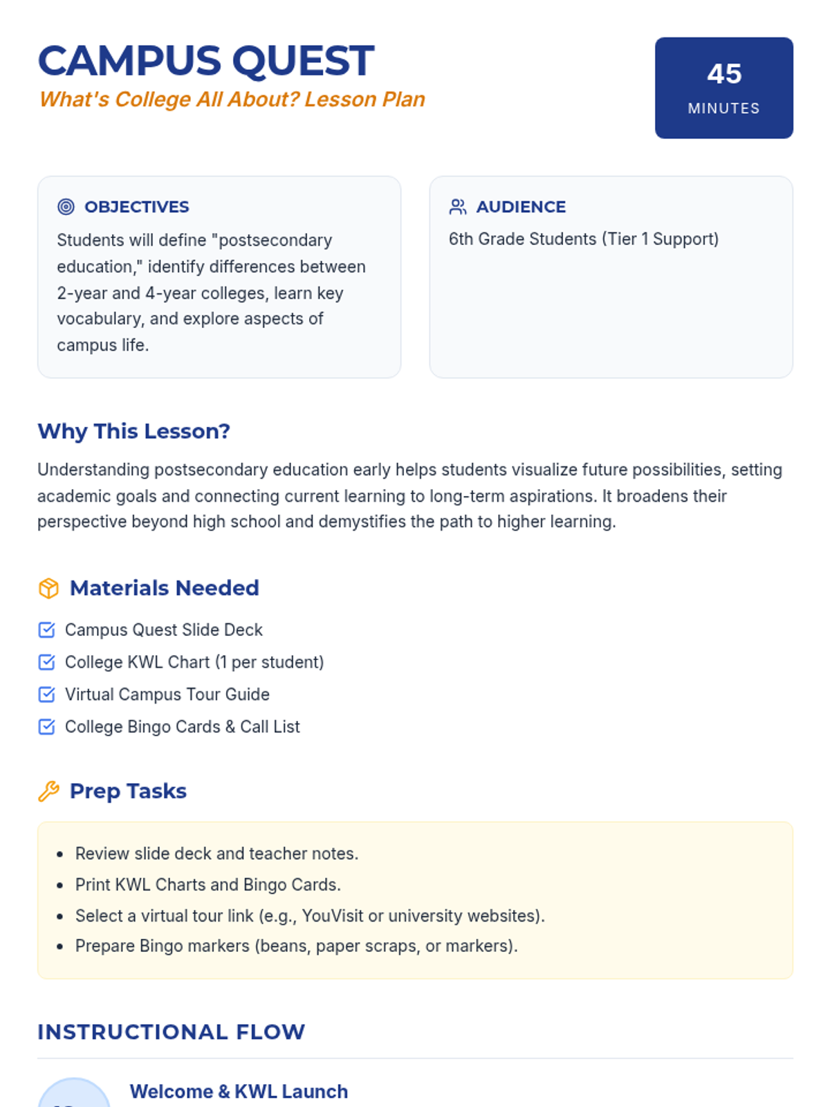 This lesson introduces 6th-grade students to the world of postsecondary education. Students will explore different types of colleges, learn essential vocabulary, and visualize their future through a virtual campus tour and interactive games.