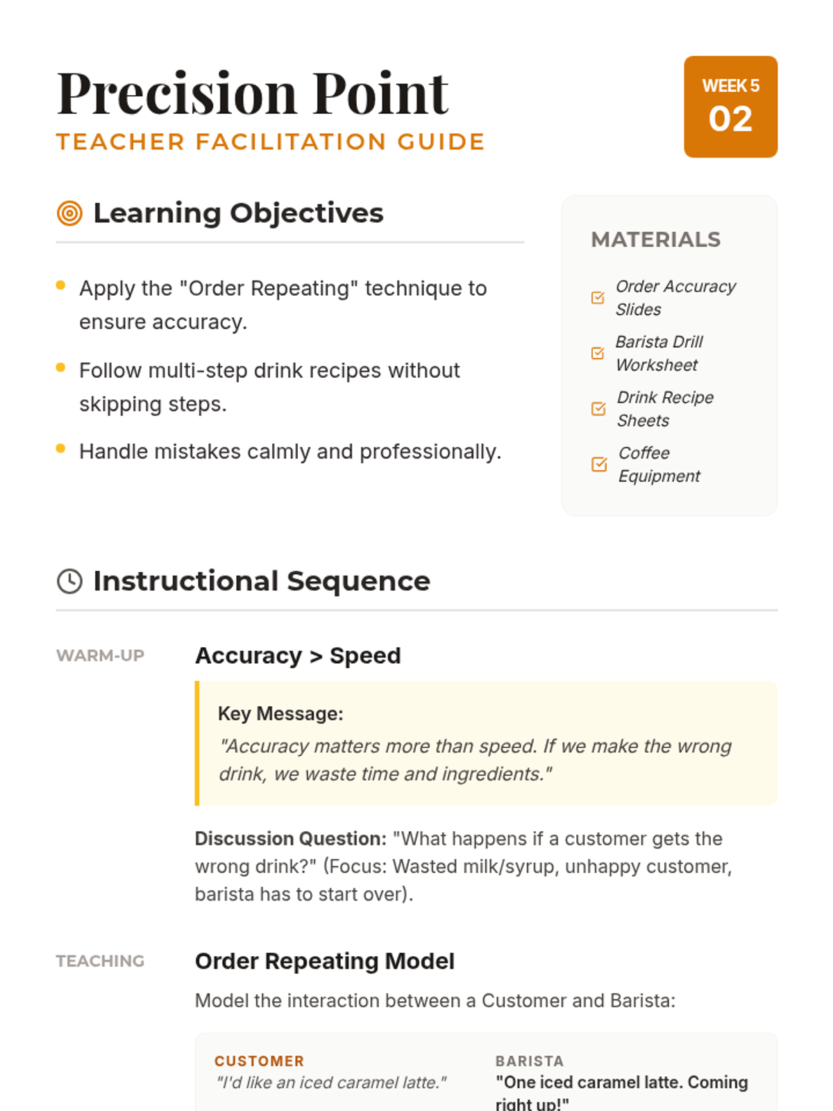 Focuses on order accuracy, repeating orders to customers, and professionally handling mistakes without panic.