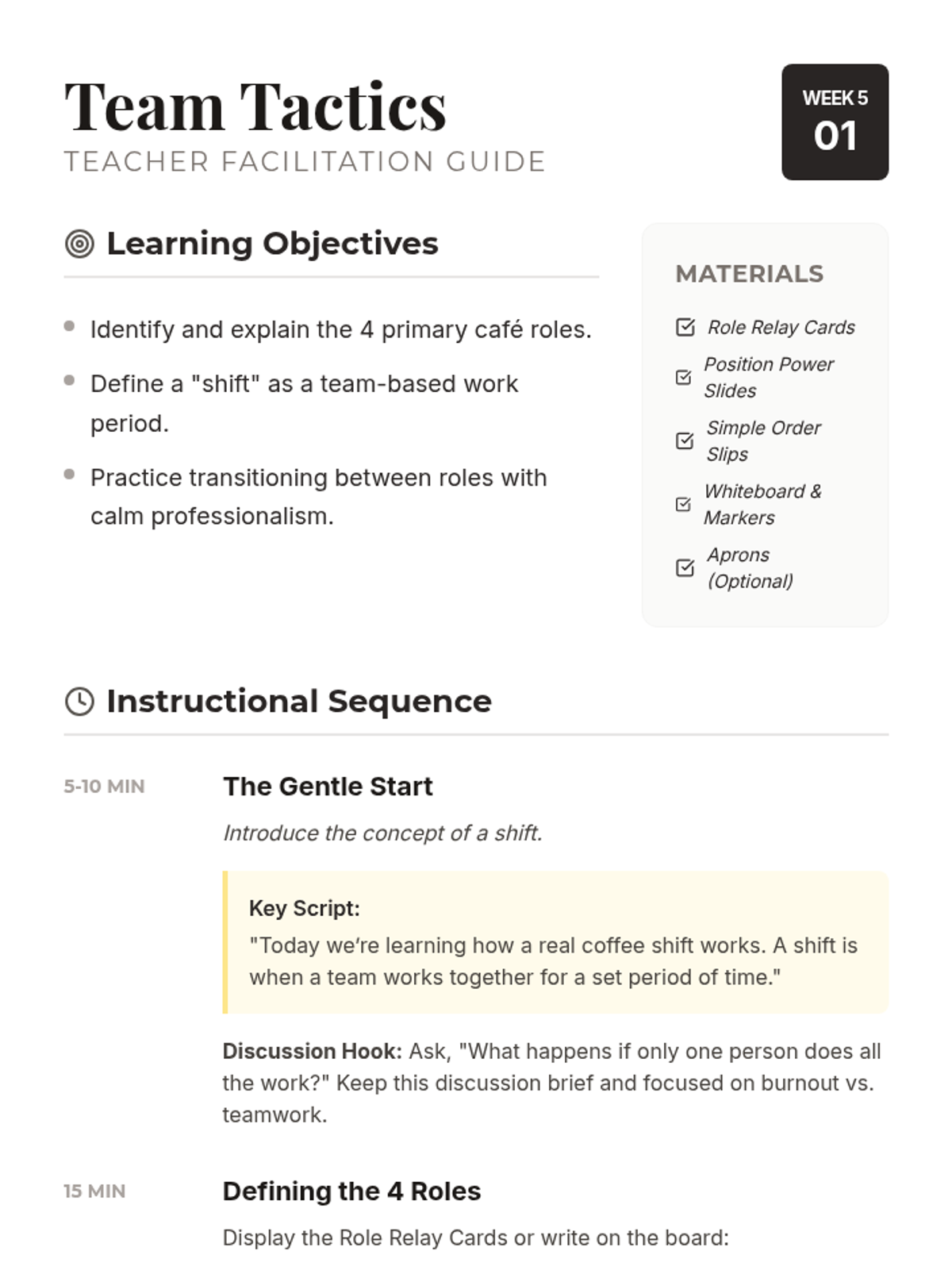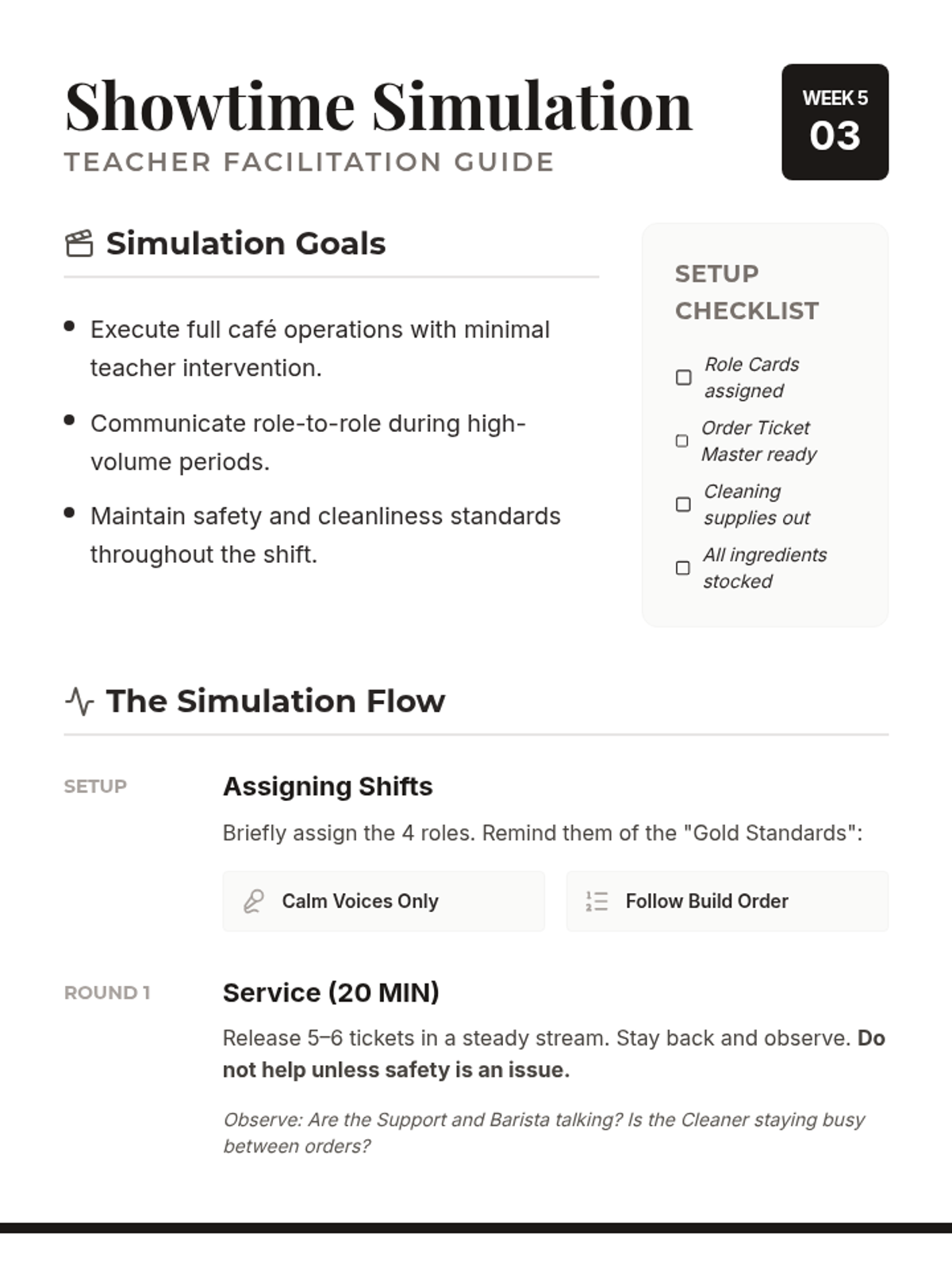 A full mock cafe simulation where students apply their knowledge of roles and communication to run a successful shift.