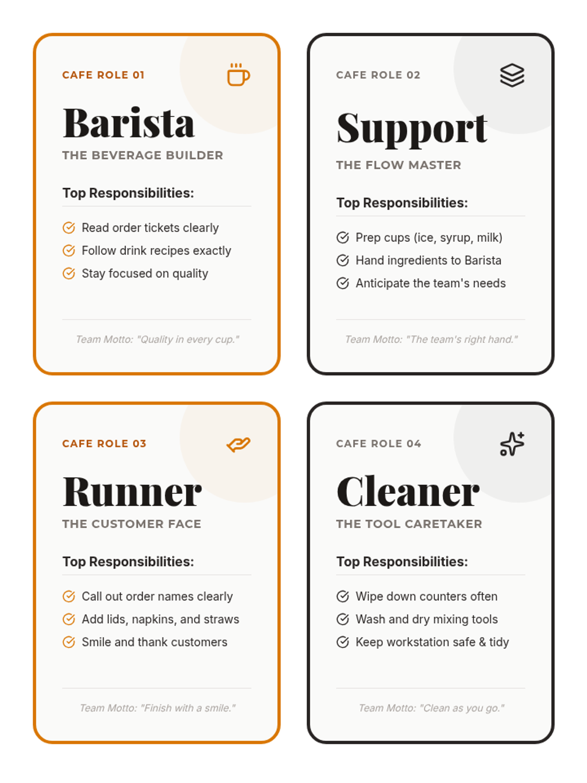Introduces the four core cafe roles and the concept of a "shift," emphasizing teamwork and individual responsibilities.