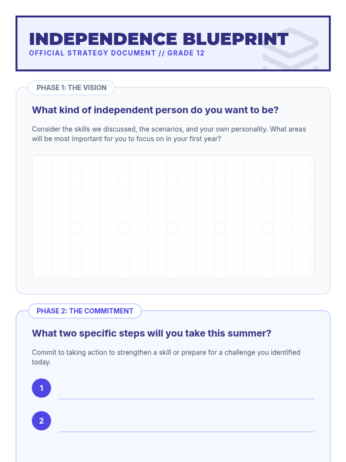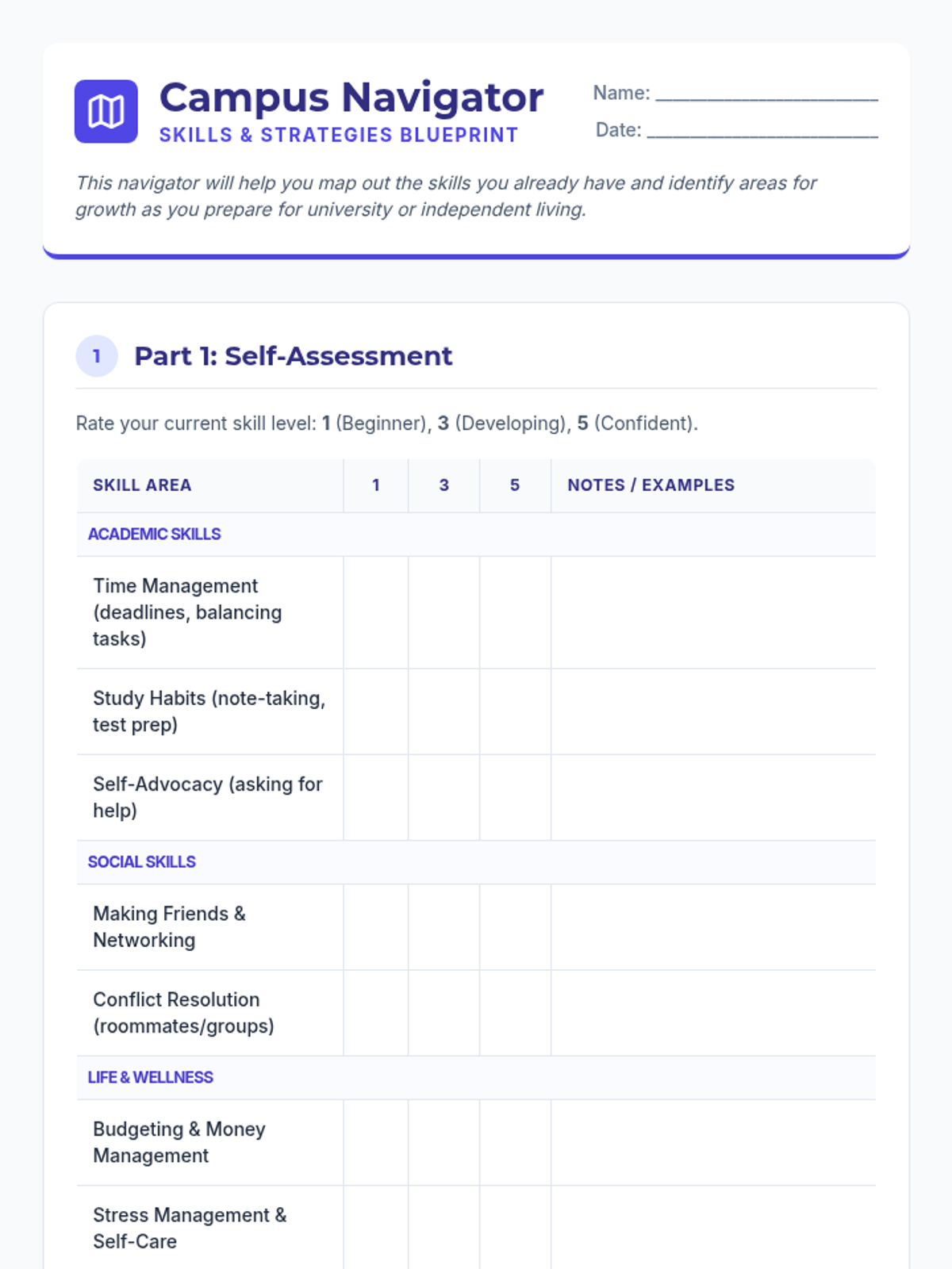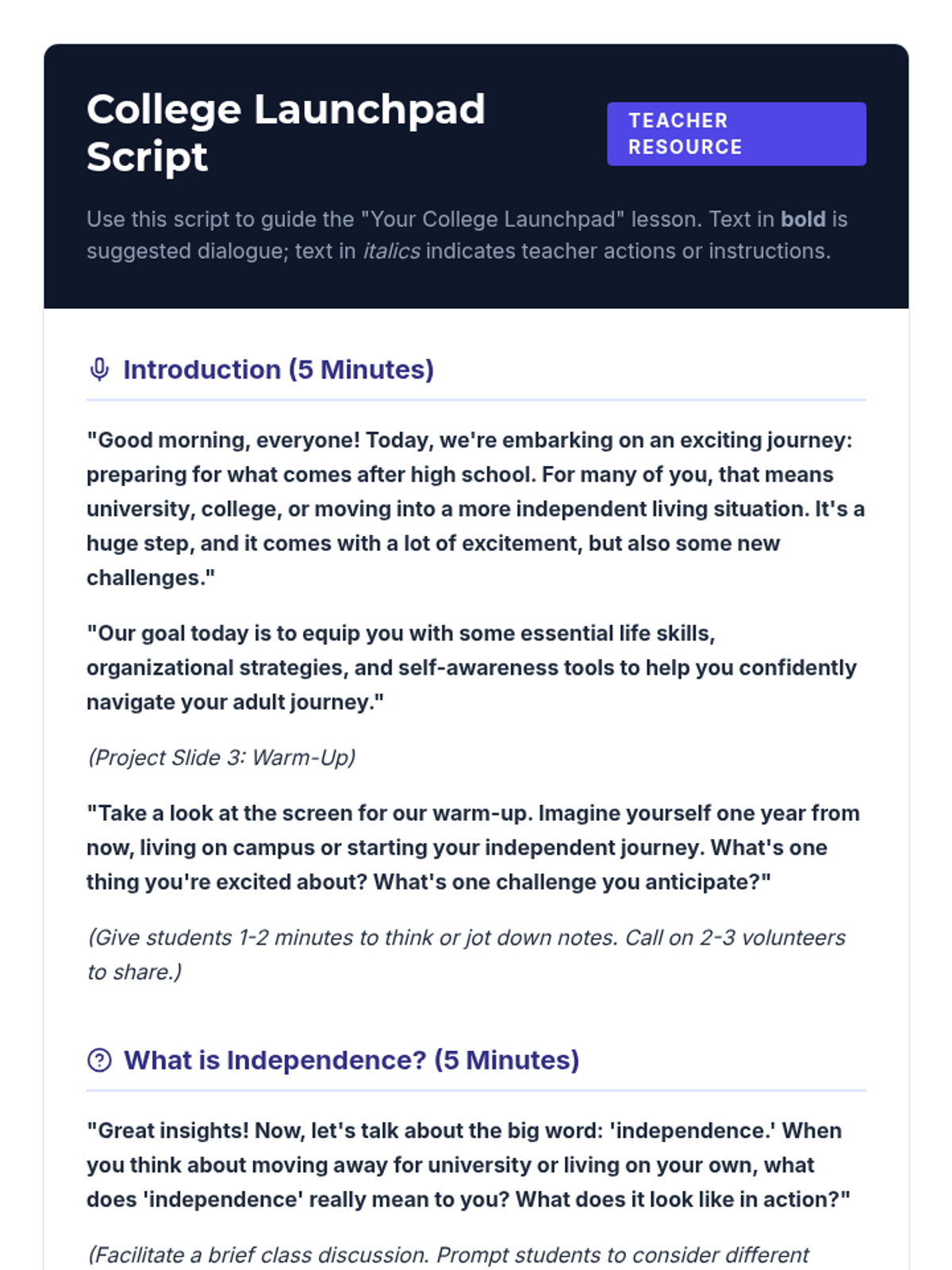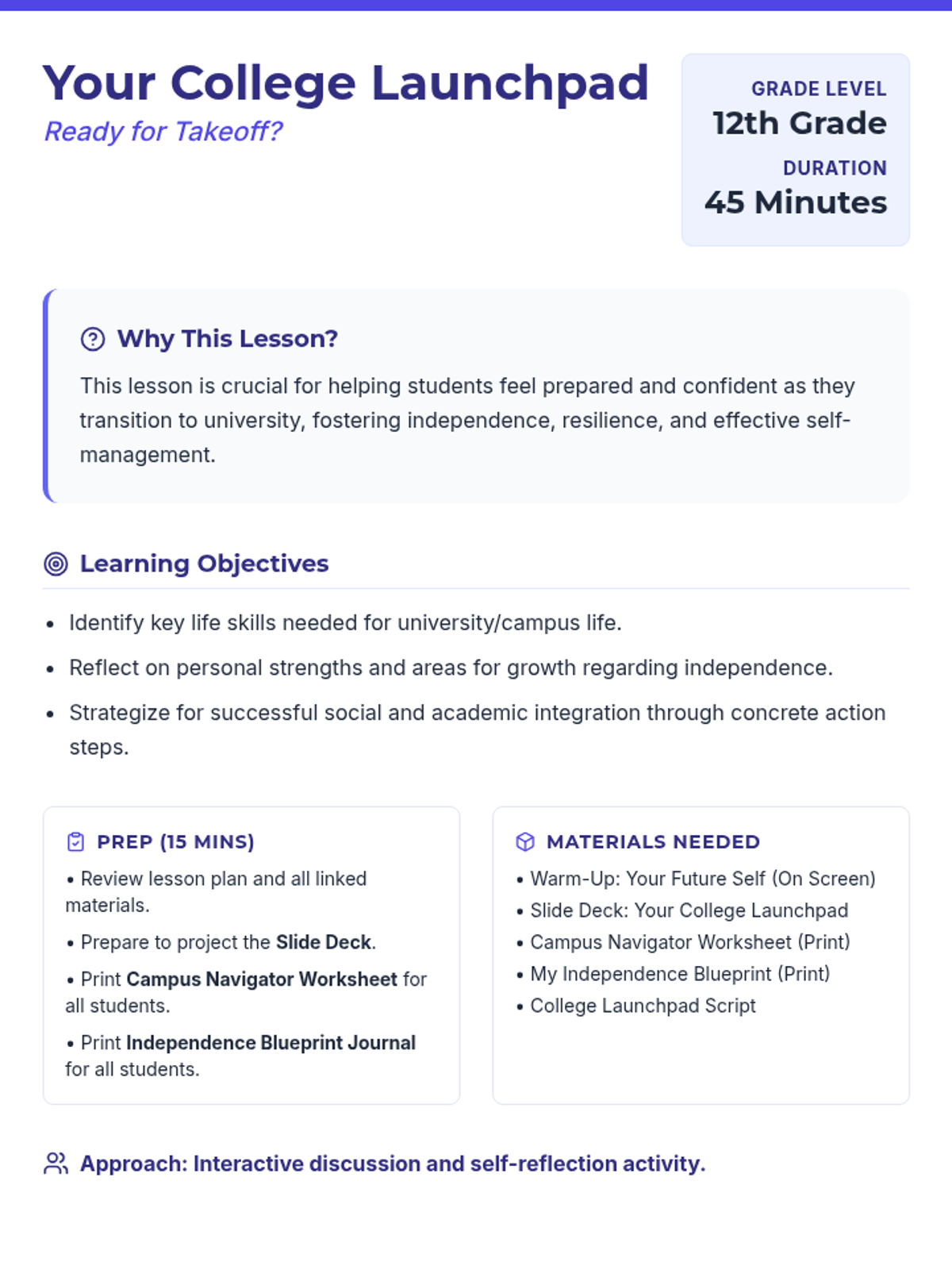This lesson prepares 12th-grade students for the transition to university life by equipping them with essential life skills, organizational strategies, and self-awareness tools. Students will explore independence, social relationships, and autonomy to confidently navigate their adult journey.