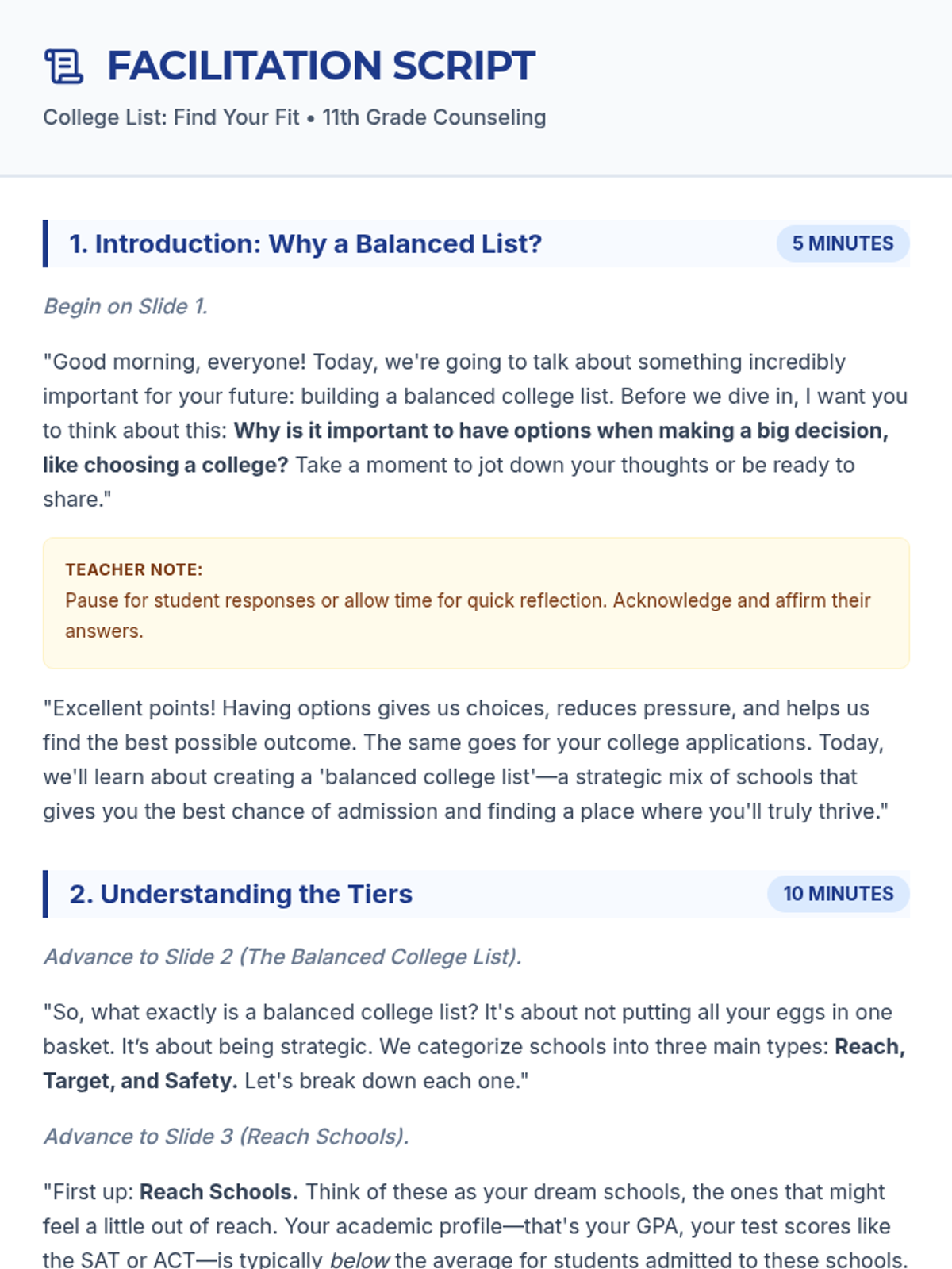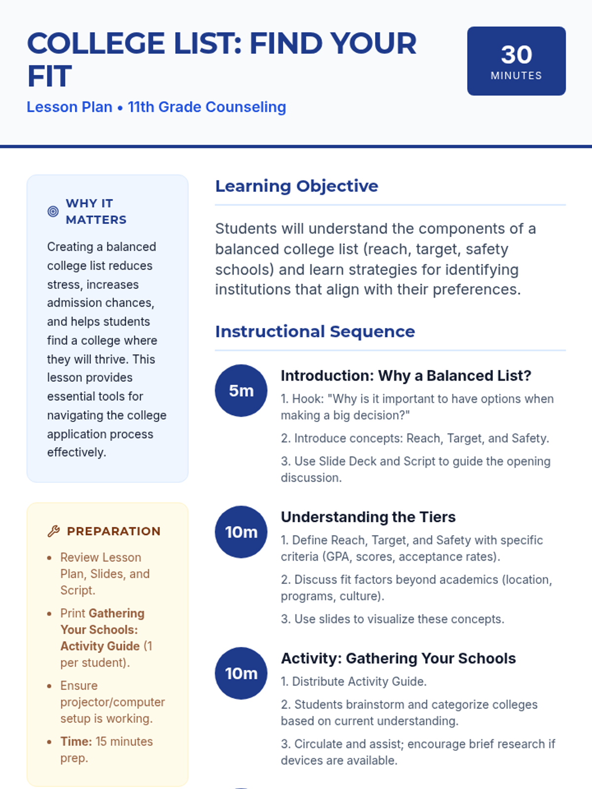 This lesson helps 11th graders understand the importance of creating a balanced college list, empowering them to explore a range of options and find schools that are a great fit academically, socially, and financially.