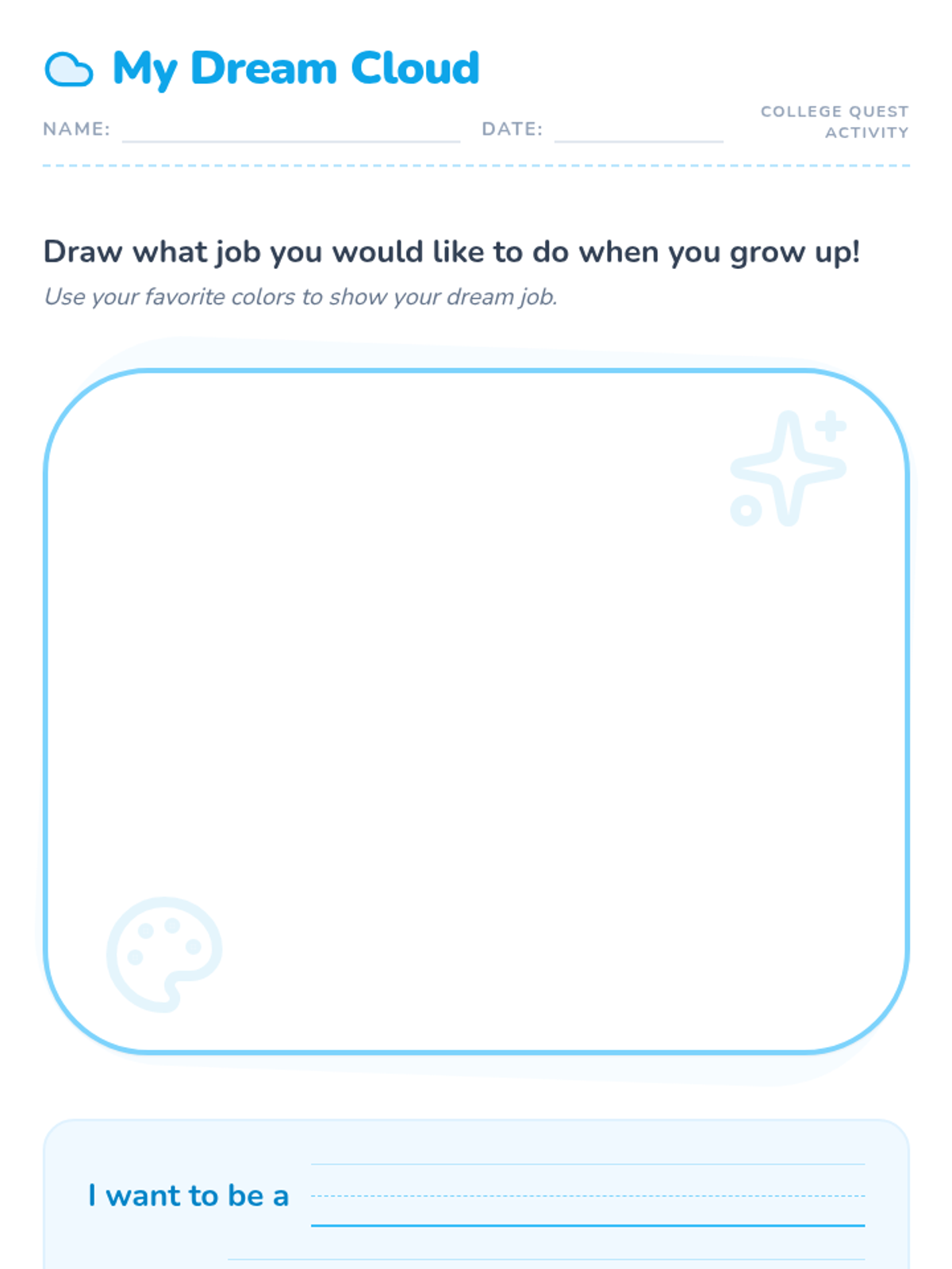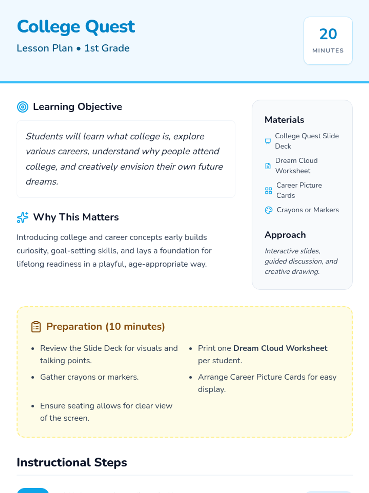 A vibrant, 20-minute session where 1st graders explore college and careers through interactive discussion and creative drawing. Students learn what college is and begin to envision their own future dreams.