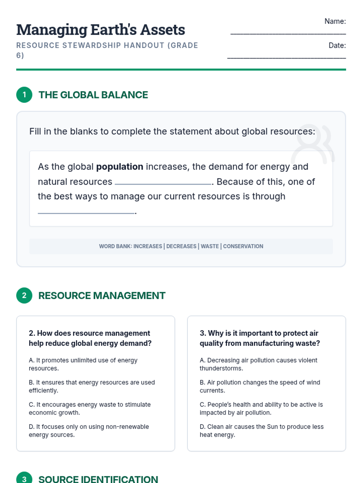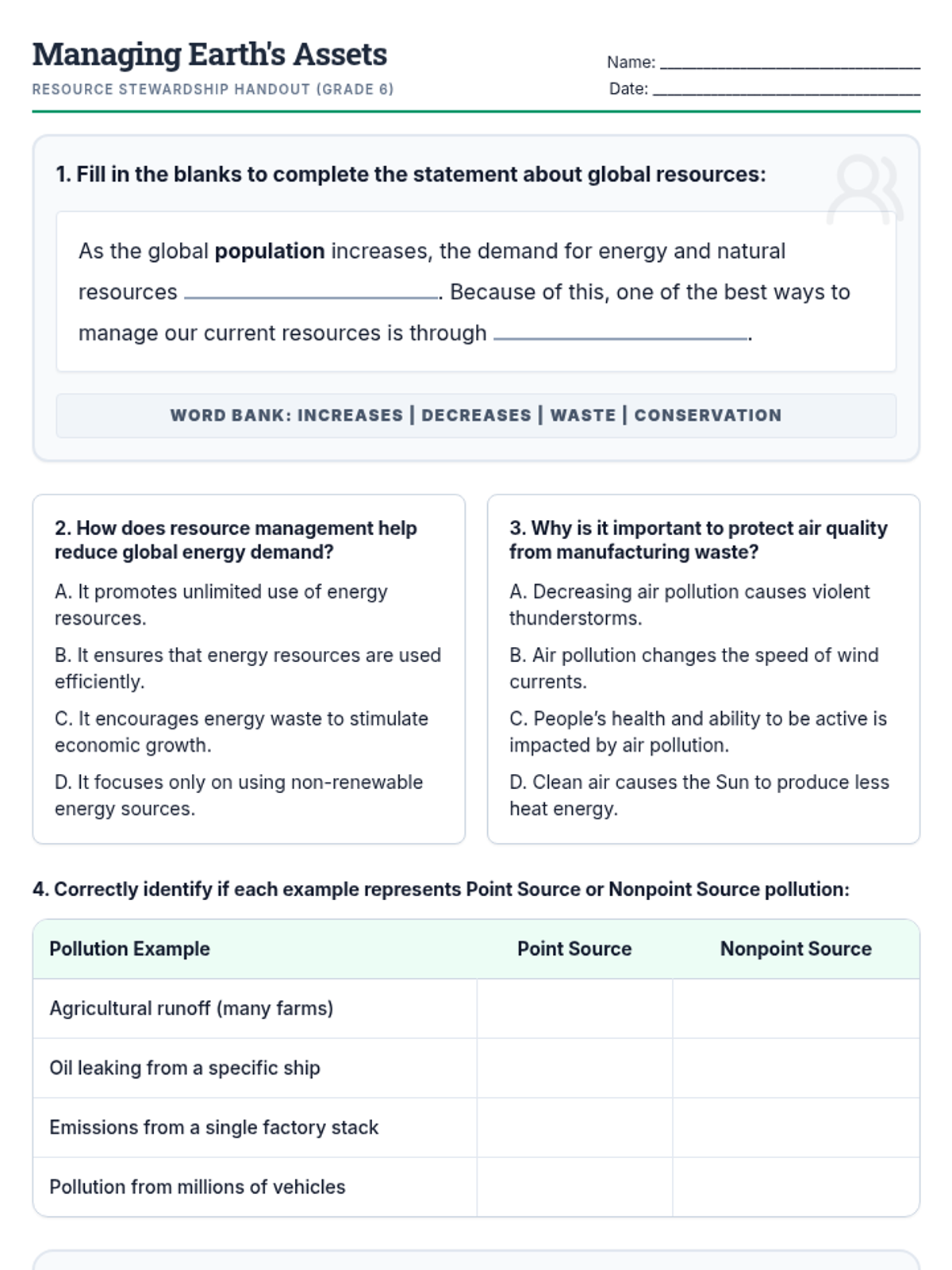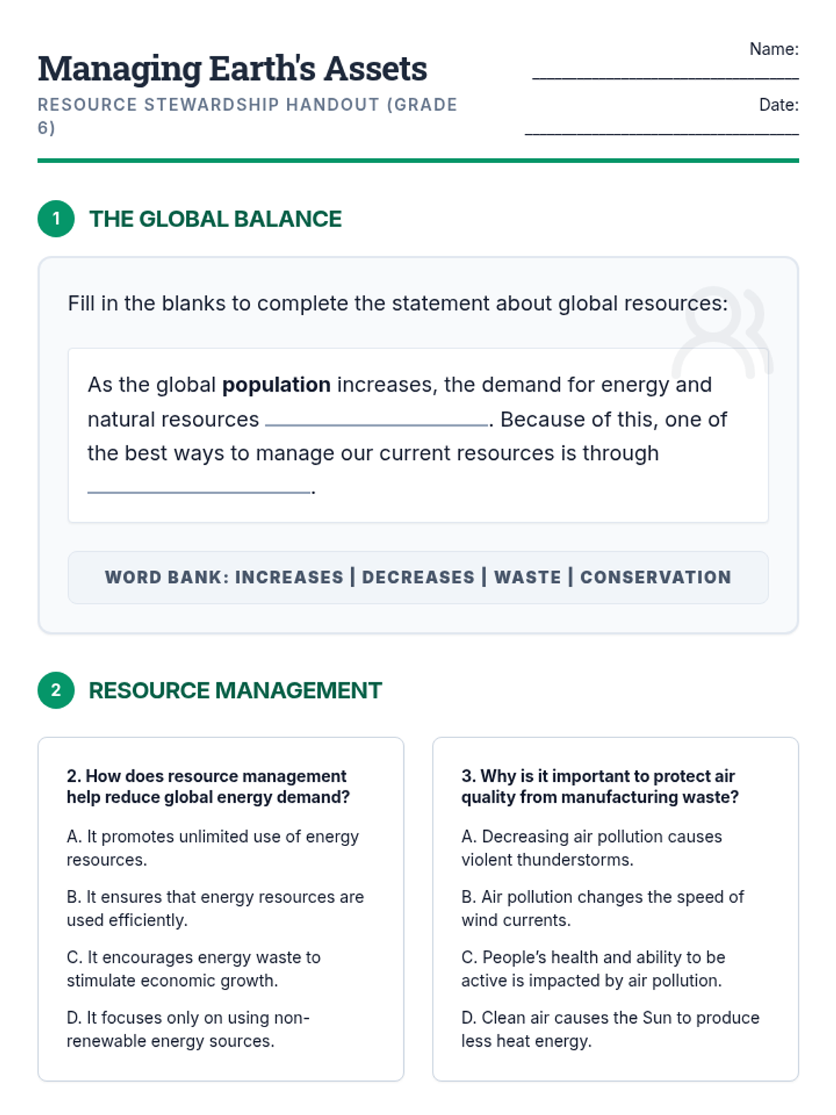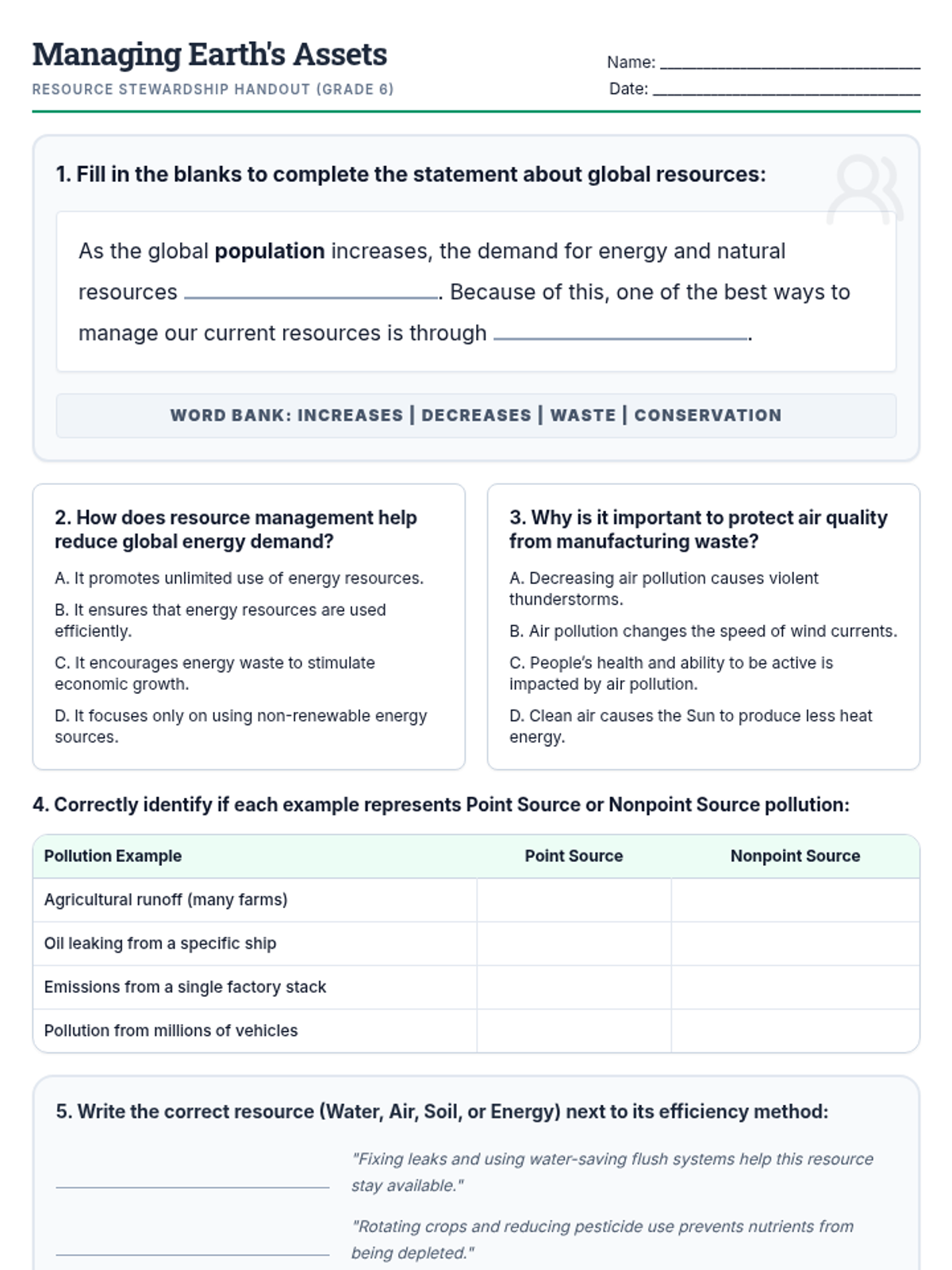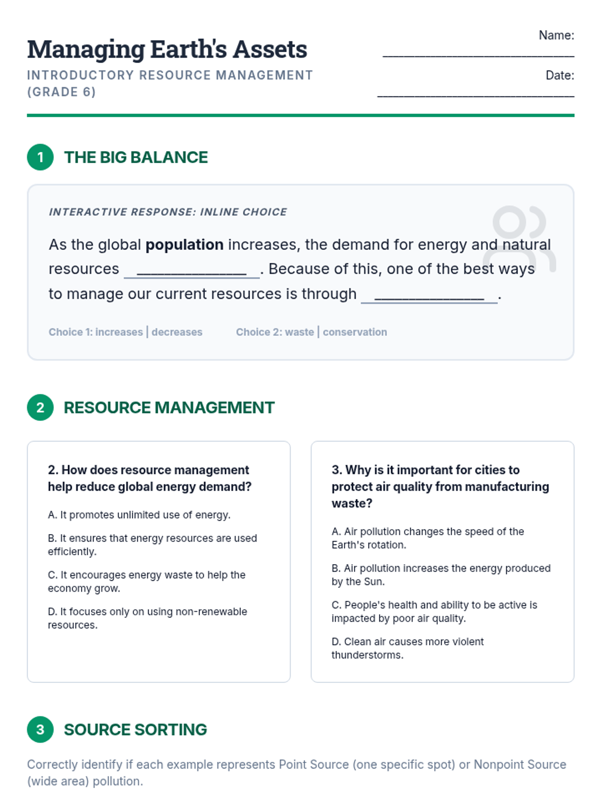 A lesson exploring Earth's primary resources (air, water, soil, energy), the impact of population growth on demand, and strategies for conservation and efficient management.