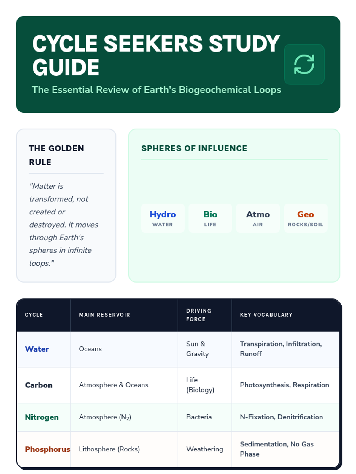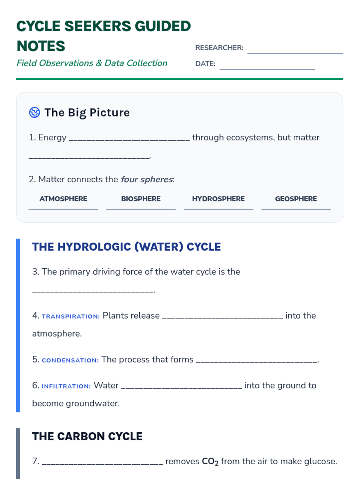 A comprehensive review of the major biogeochemical cycles: water, carbon, nitrogen, and phosphorus. Students will explore how matter moves through Earth's spheres and synthesize their knowledge in a field journal synopsis.