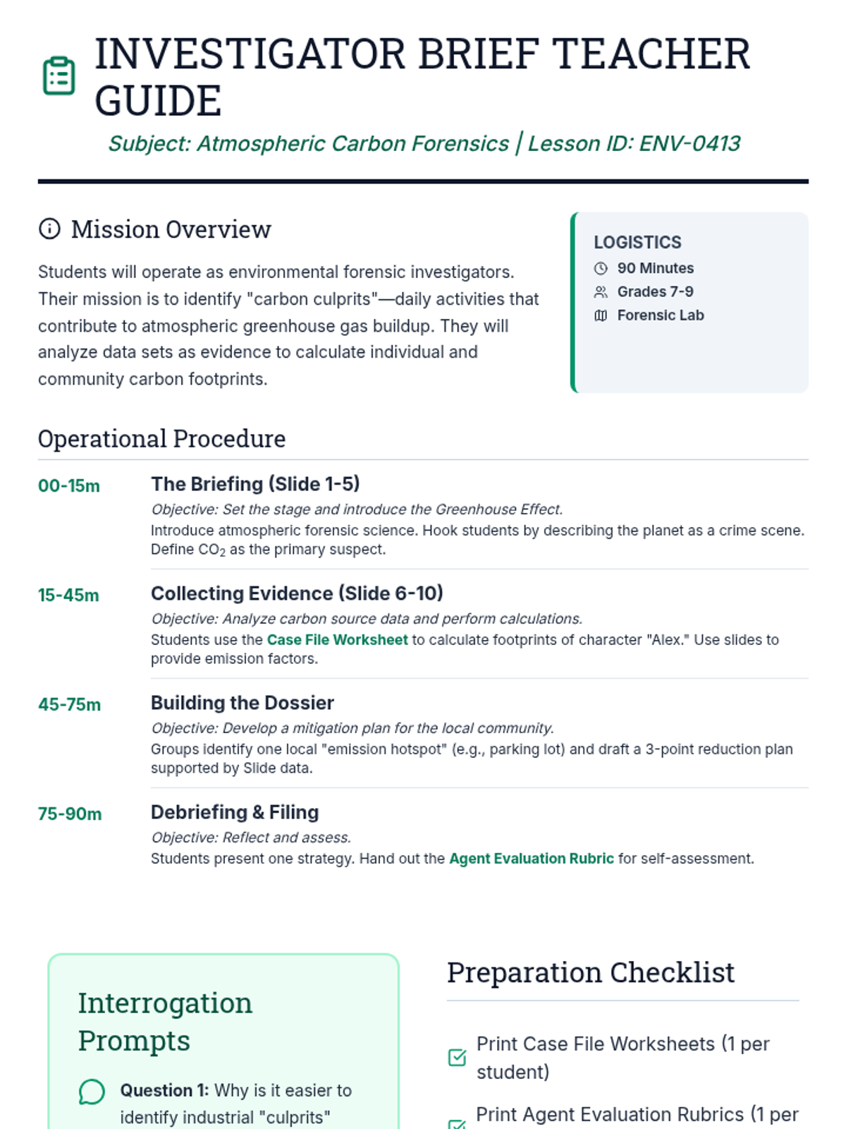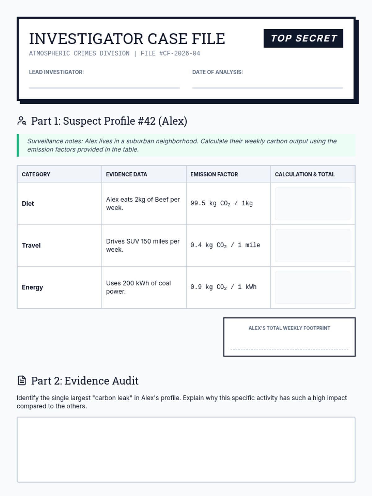 In this forensic-themed environmental science lesson, students take on the role of 'Carbon Detectives' to investigate the atmospheric impact of daily human activities. They will calculate footprints, analyze evidence from data sets, and draft 'mitigation dossiers' to reduce emissions in their local community.