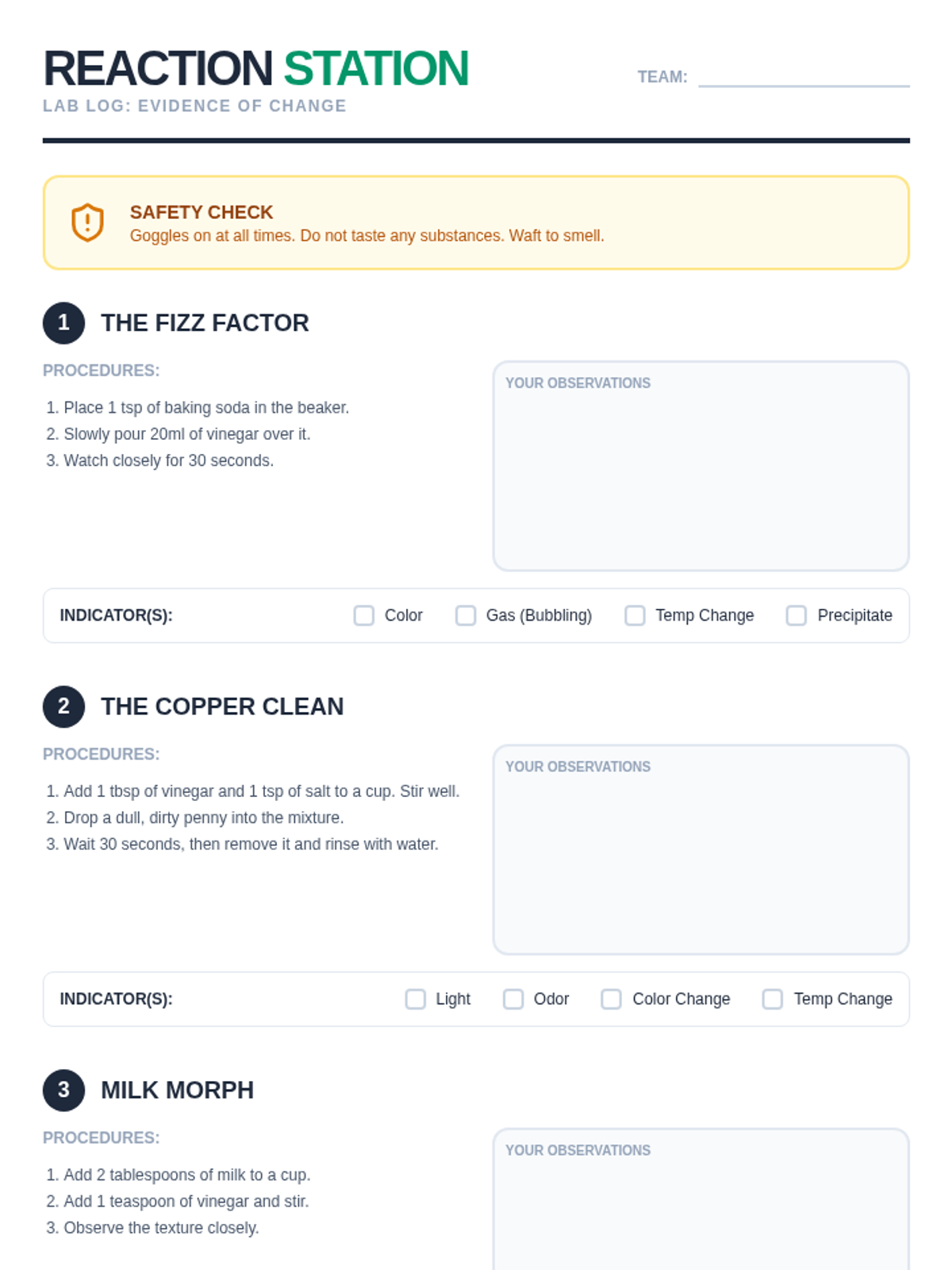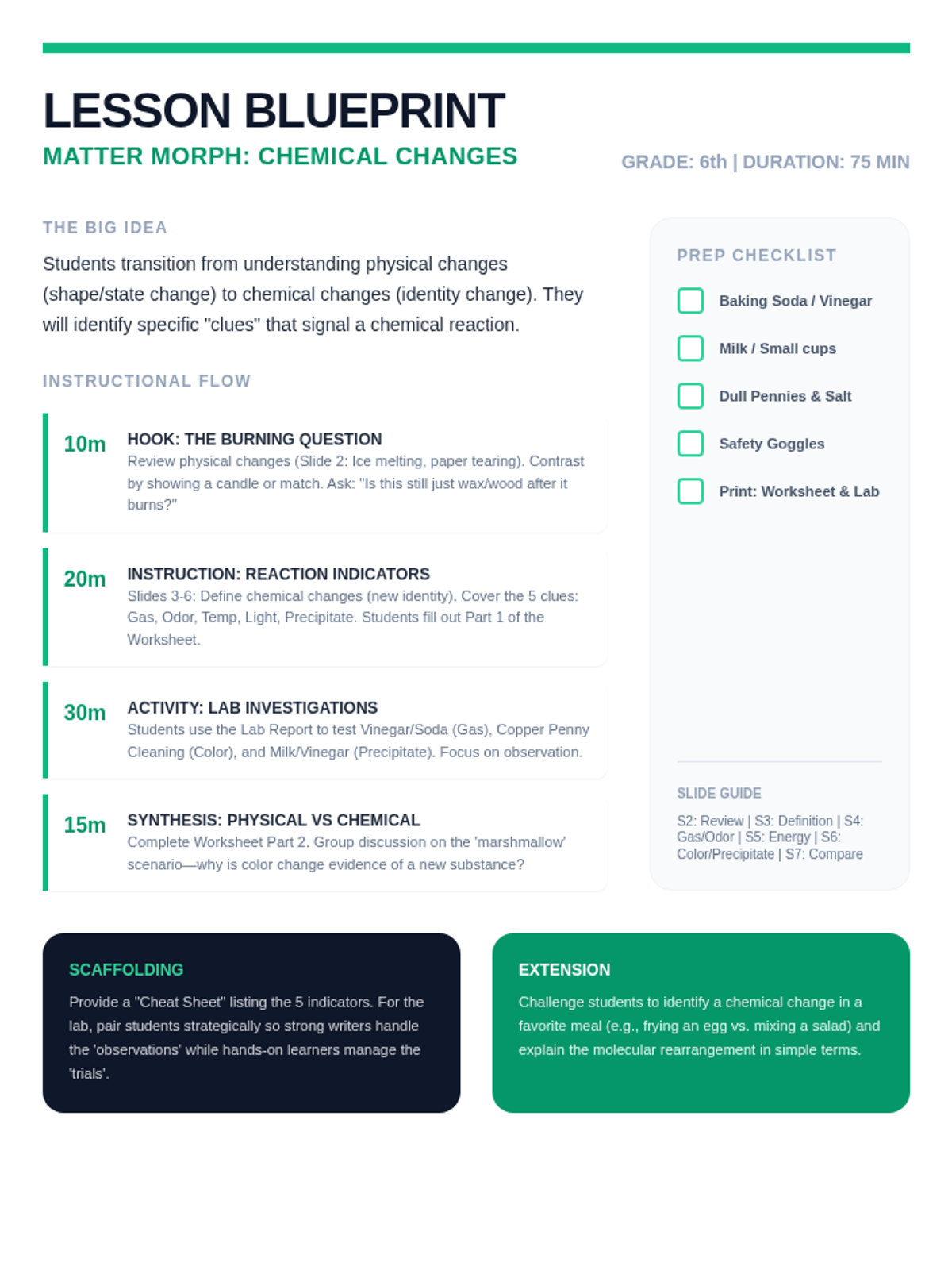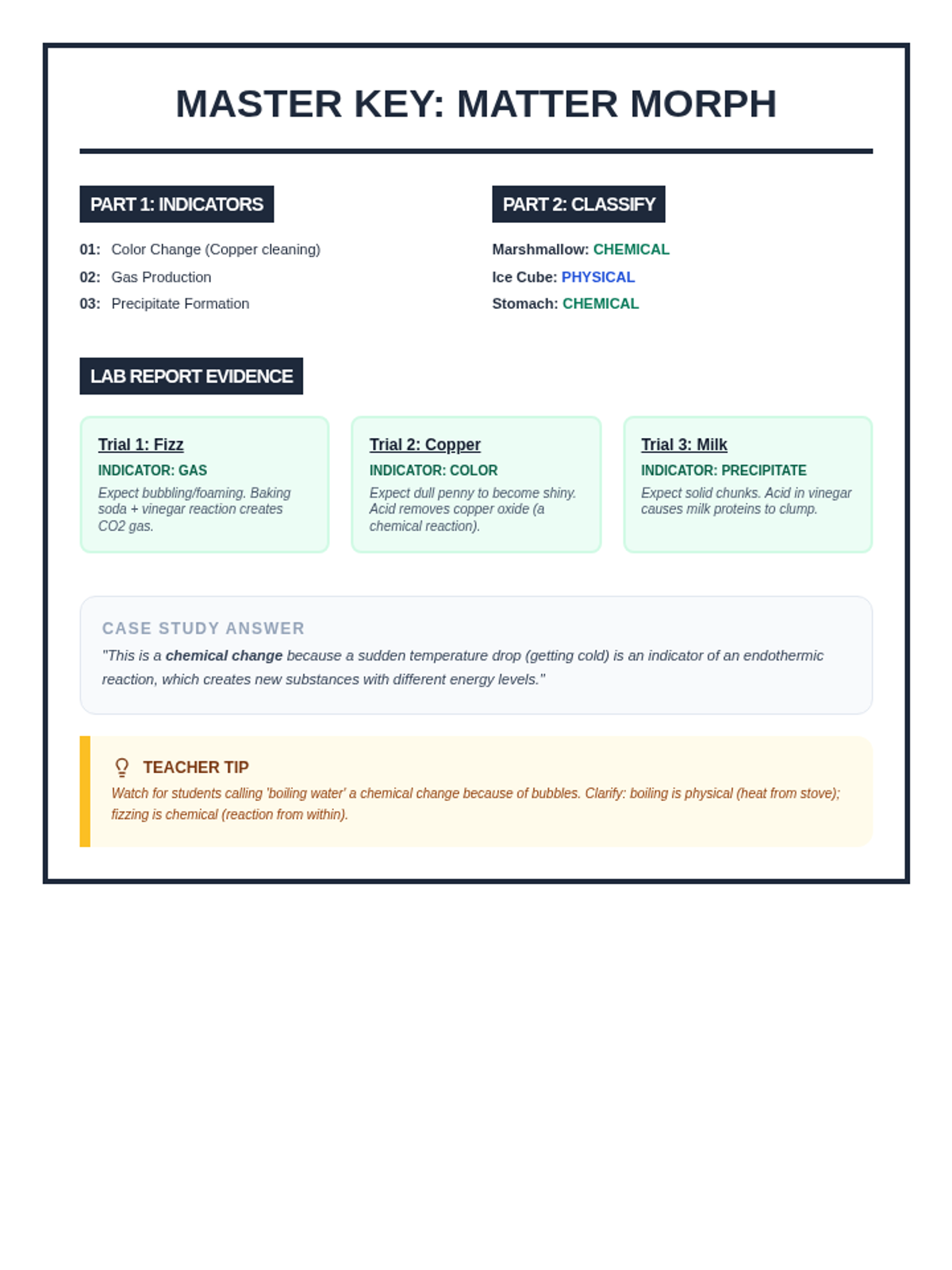 A comprehensive introduction to chemical changes for 6th graders, focusing on the five main indicators of a chemical reaction and how they differ from physical changes. Students will explore evidence like gas production, temperature shifts, and precipitate formation through visual aids and hands-on investigation.
