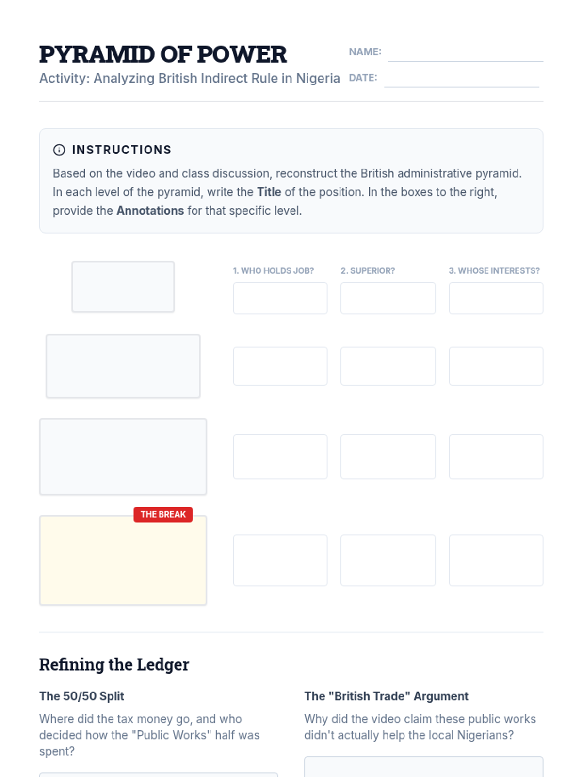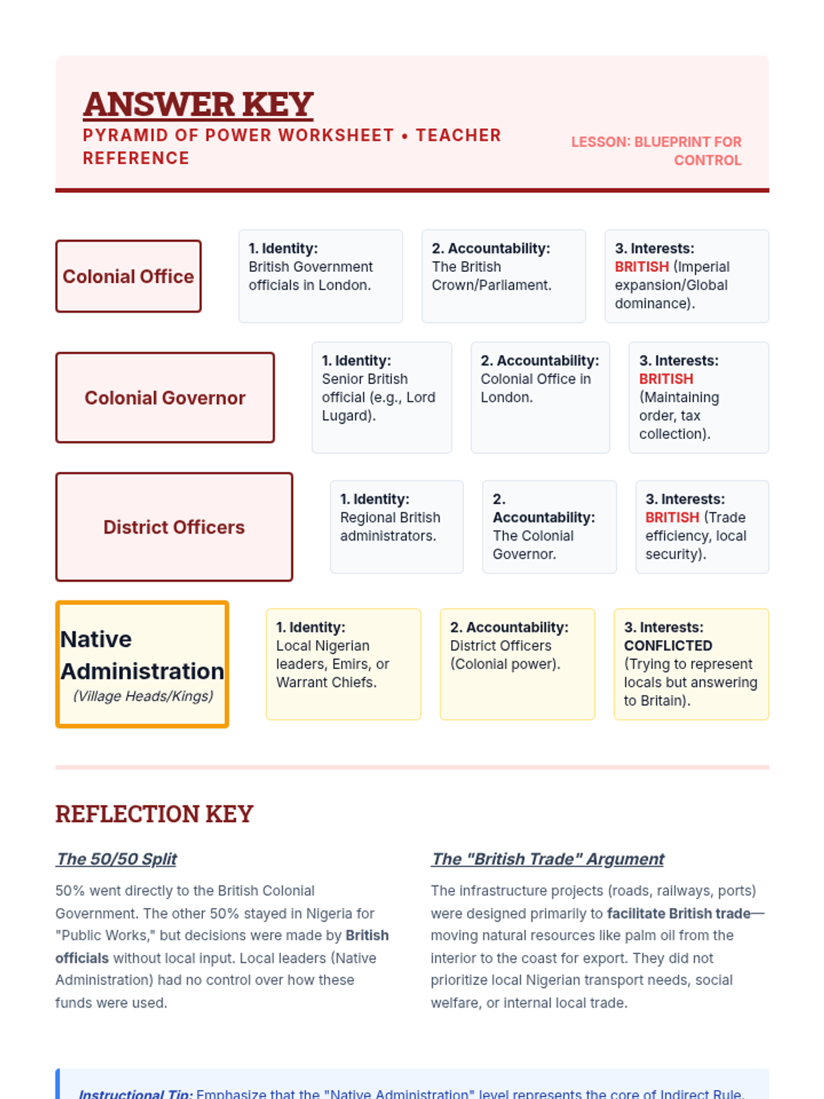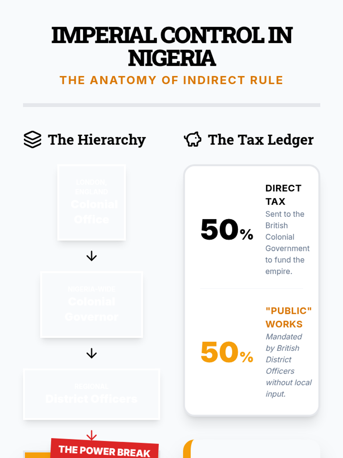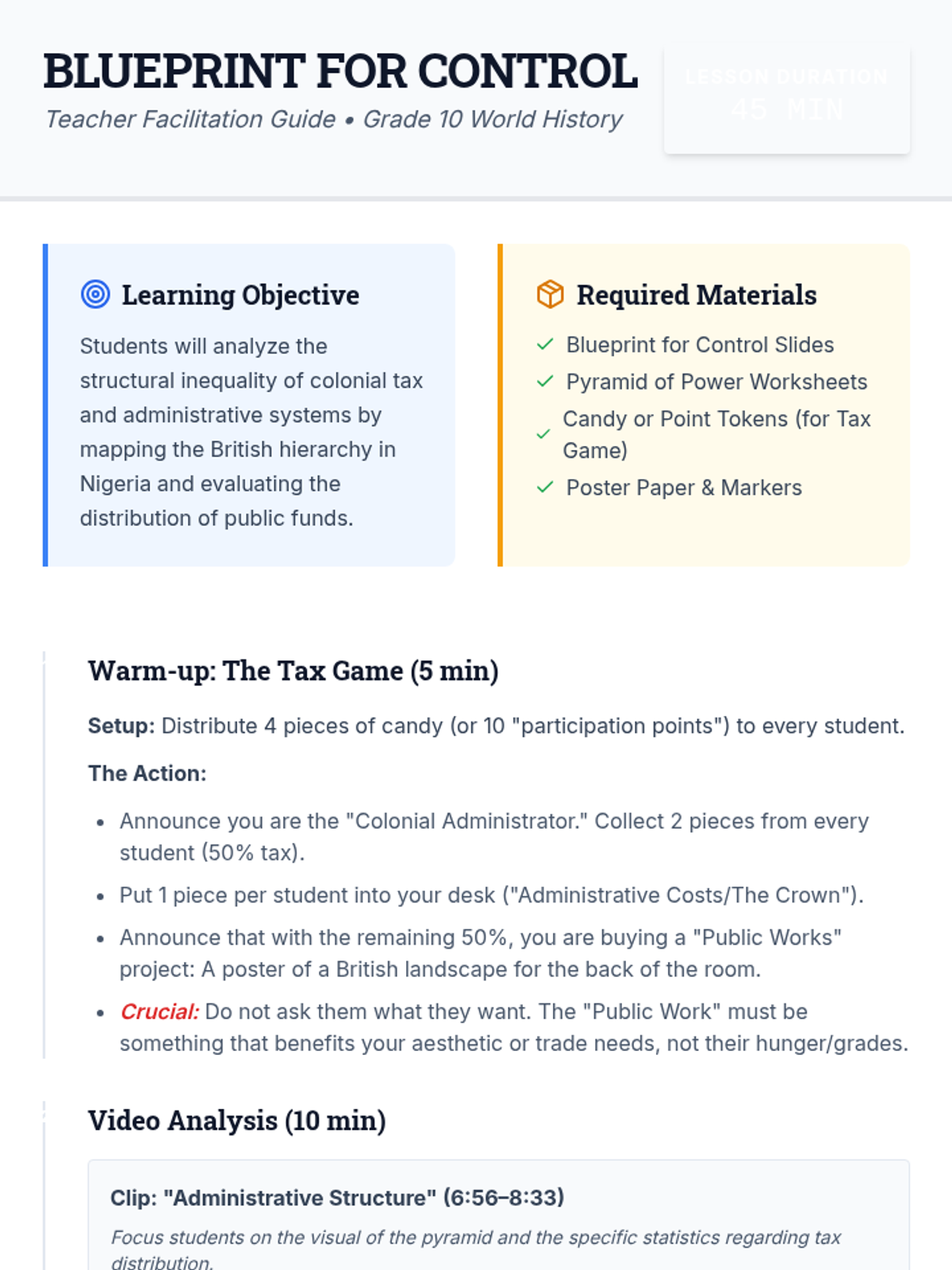 This lesson explores the structural inequality of British indirect rule in Nigeria, focusing on the administrative hierarchy and the colonial tax system that prioritized British trade over local needs.