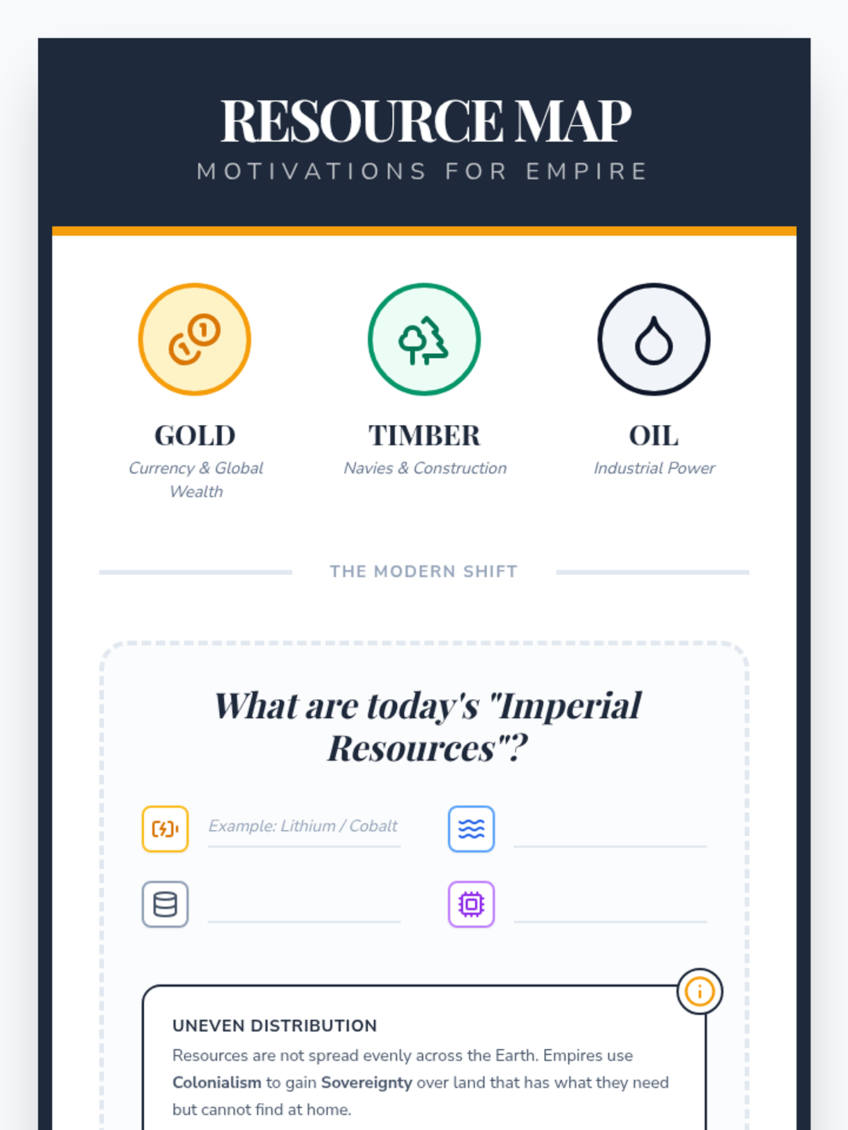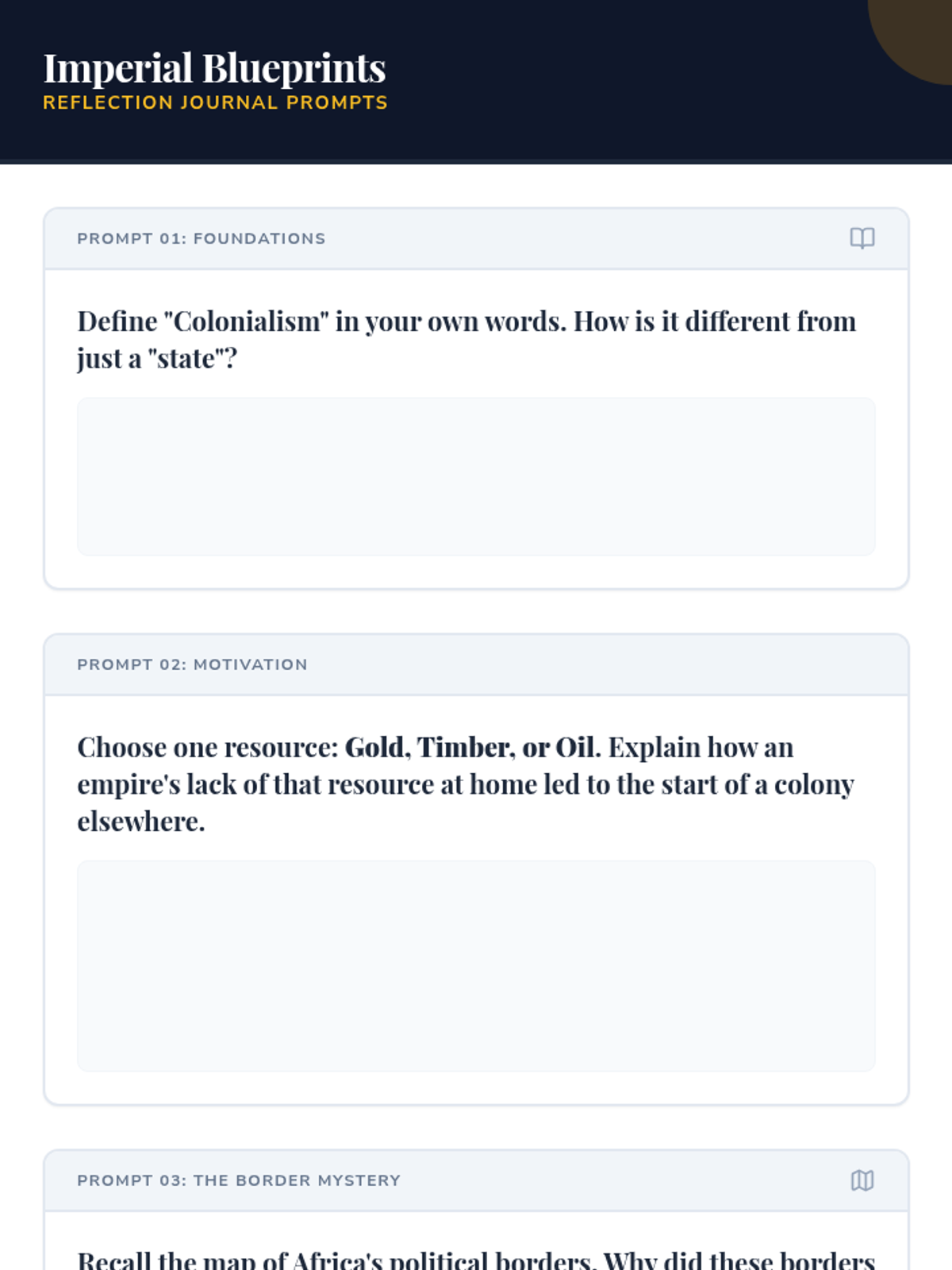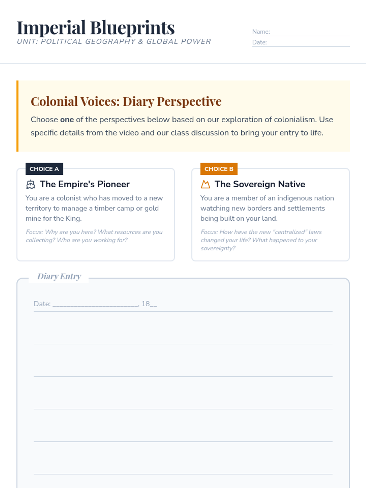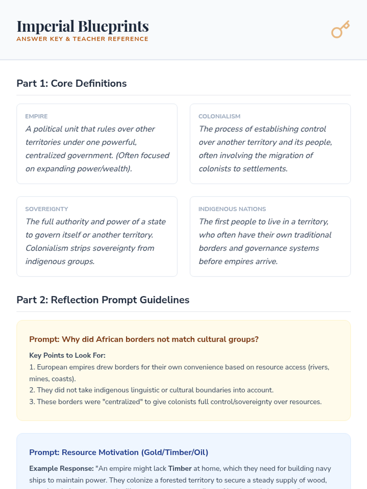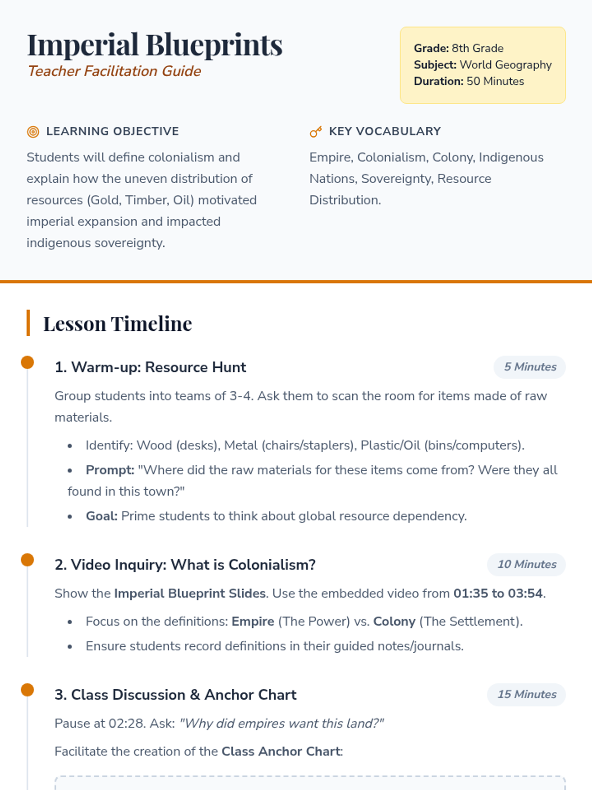 This lesson introduces 8th-grade students to colonialism and its resource-driven motivations. Students analyze a geography mystery involving African borders, explore the definitions of Empire and Colony, and reflect on the human impact through creative writing and discussion.