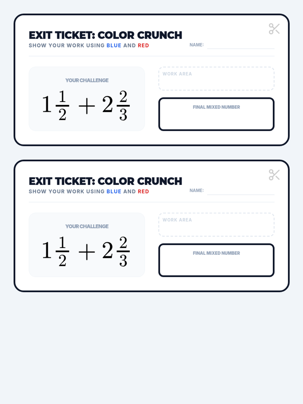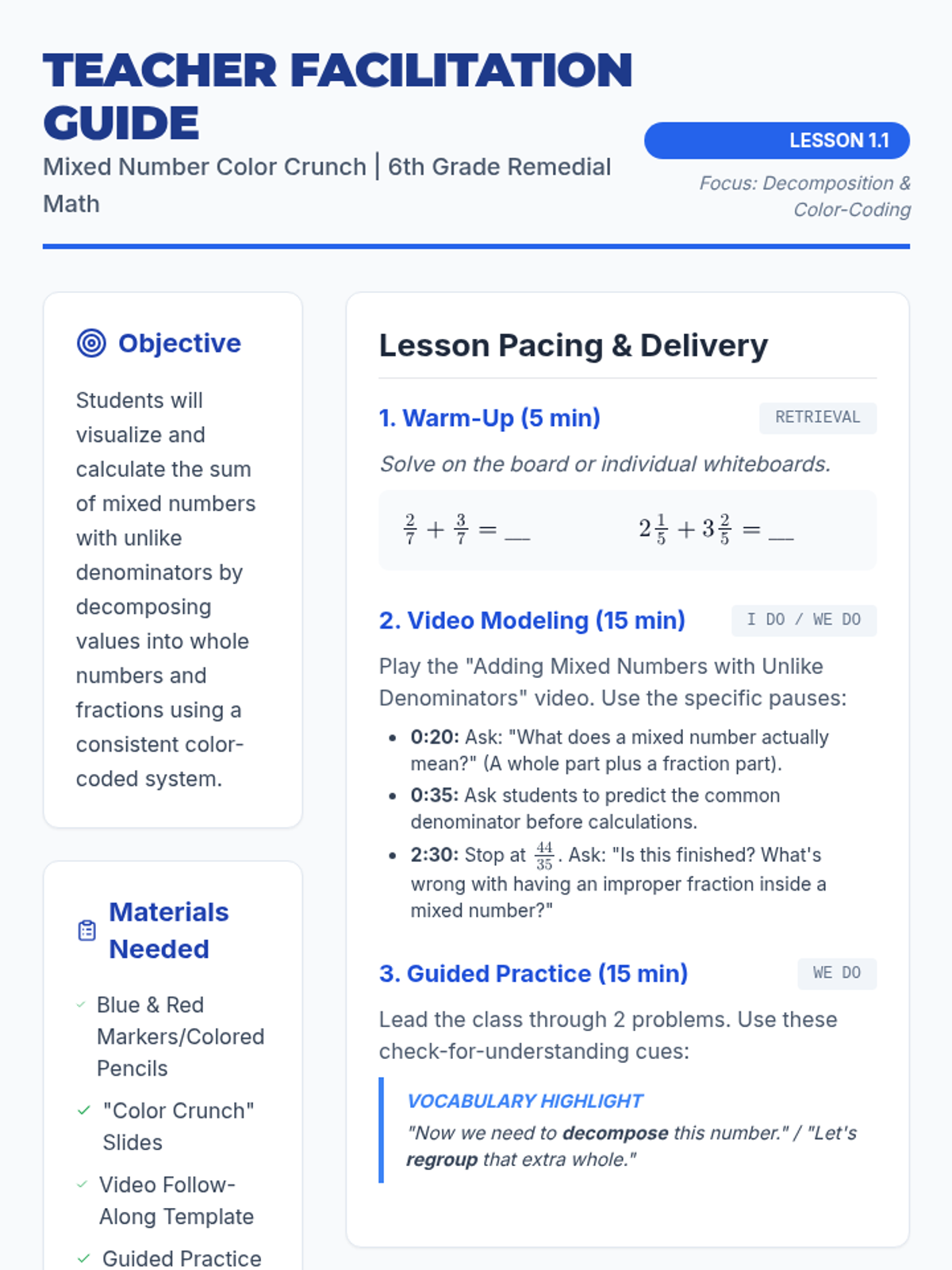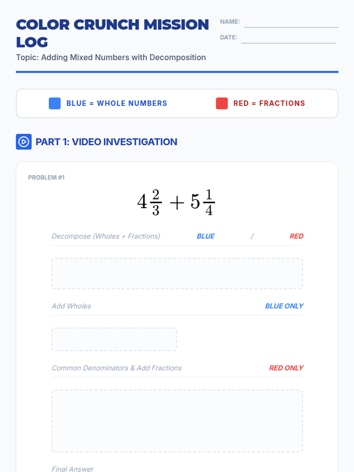 A remedial math lesson for 6th graders focused on visualizing the addition of mixed numbers through decomposition and color-coding. Students follow a specific blue-for-wholes and red-for-fractions system to master regrouping and common denominators.