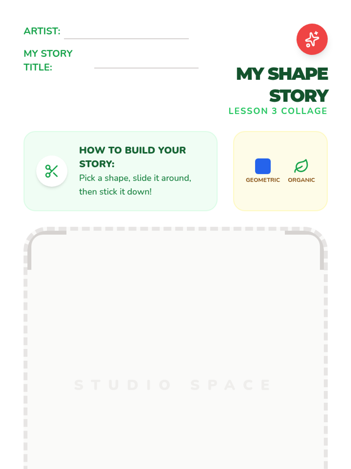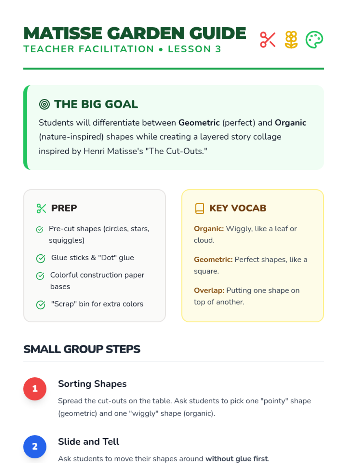 Students create vibrant collages using geometric and organic shapes, taking inspiration from Henri Matisse's famous 'cut-outs' to tell visual stories.