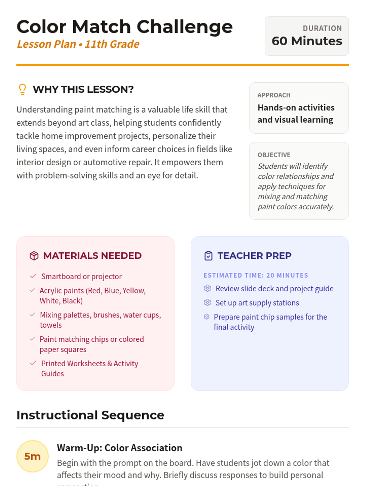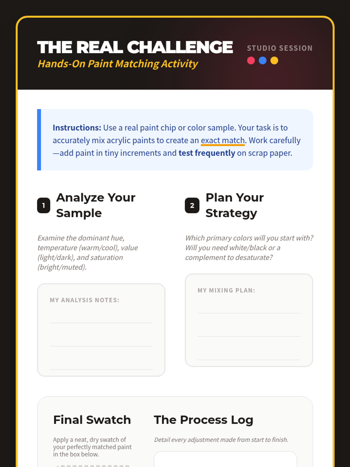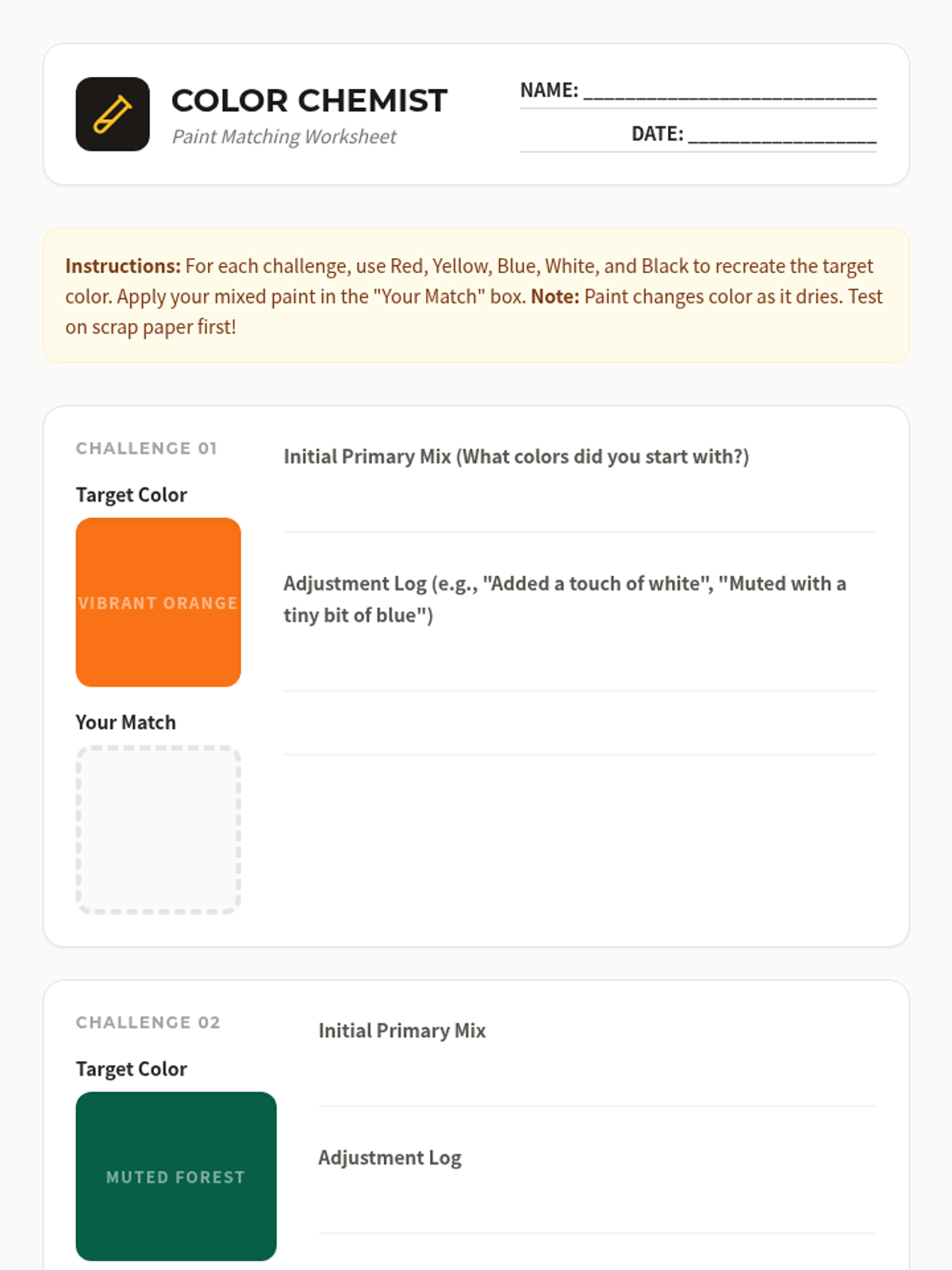A hands-on introduction to color theory and the practical skill of paint matching, designed for 11th-grade students to develop an eye for detail and problem-solving skills through artistic application.