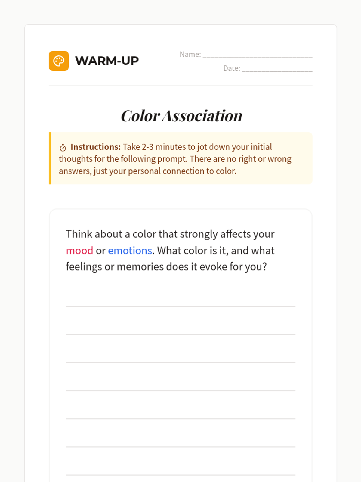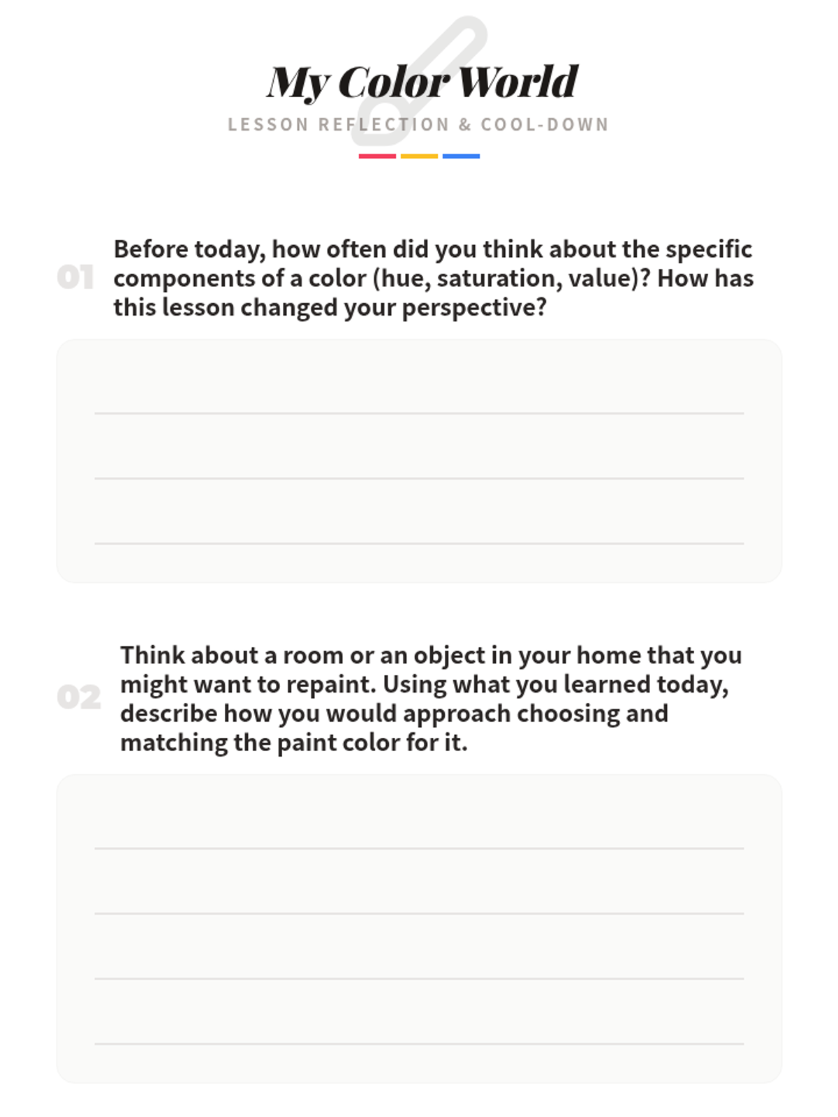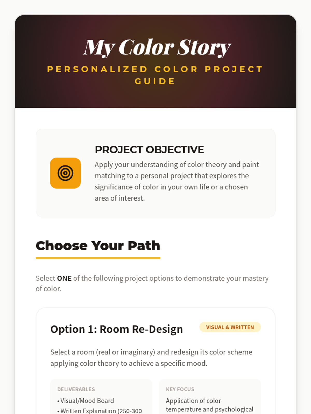 A hands-on introduction to color theory and the practical skill of paint matching, designed for 11th-grade students to develop an eye for detail and problem-solving skills through artistic application.