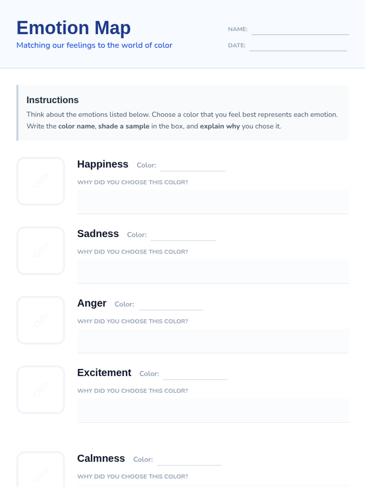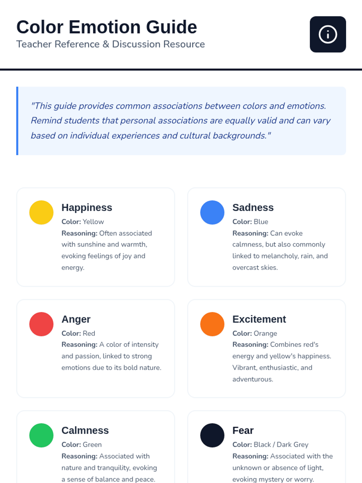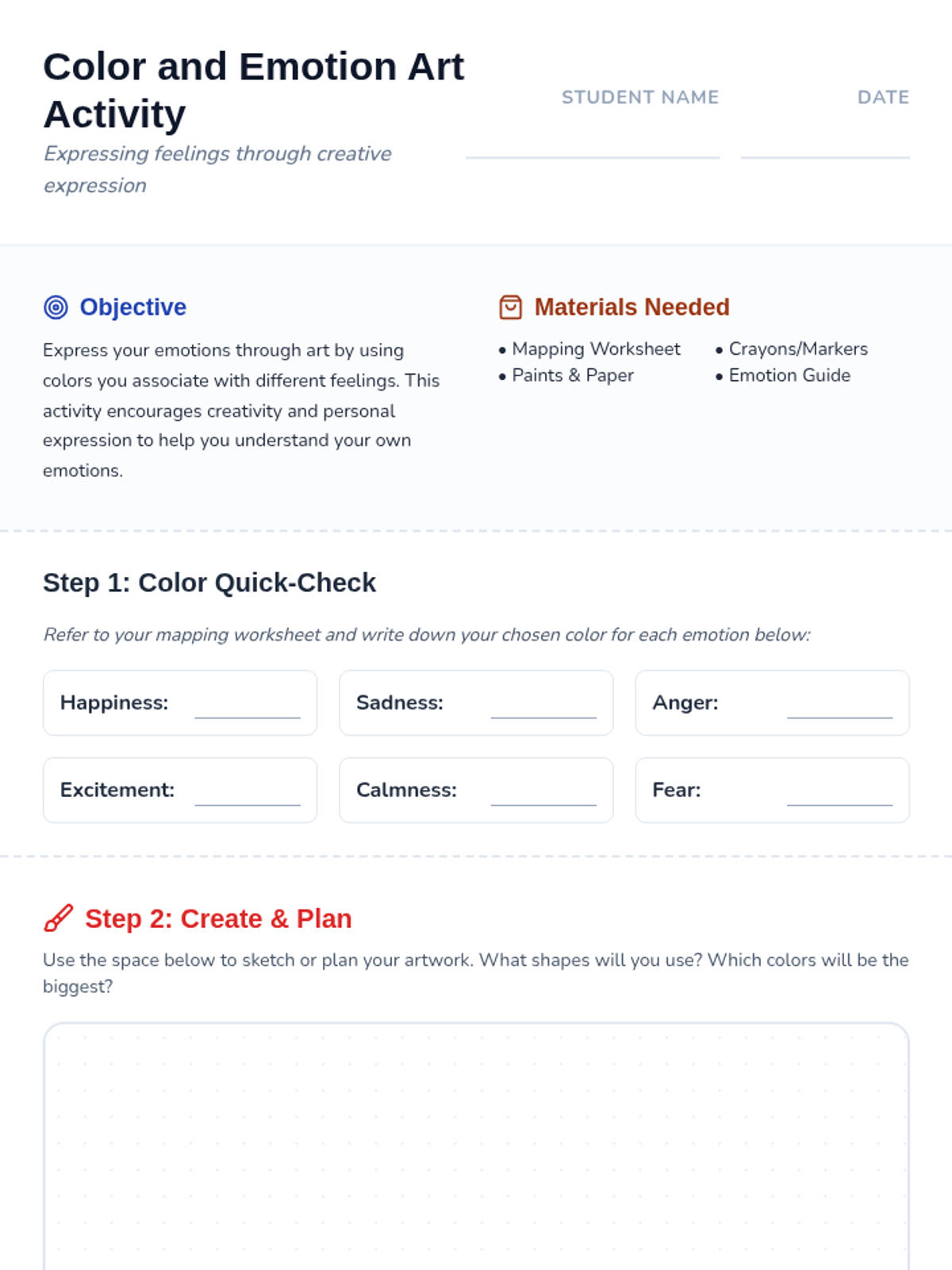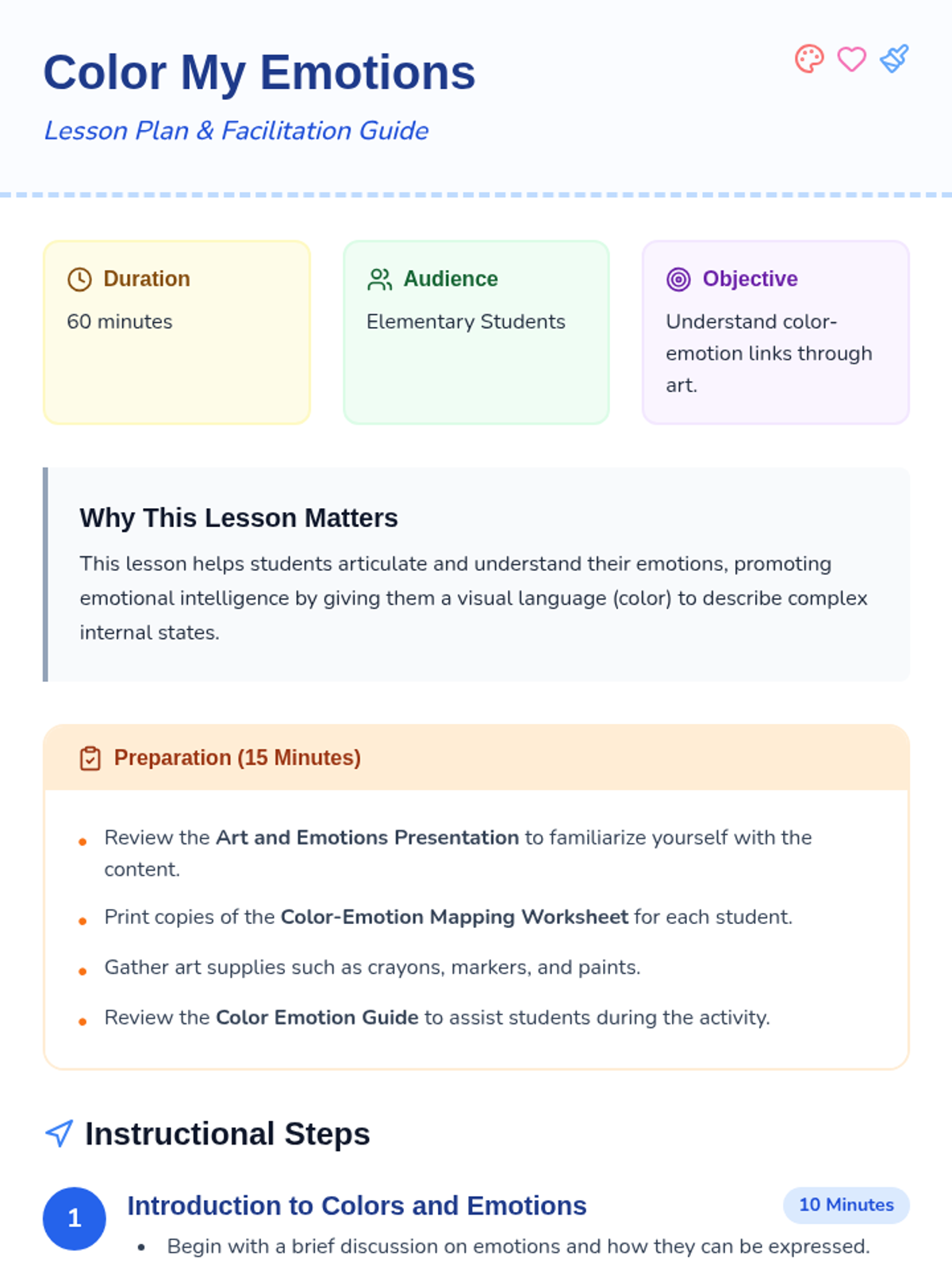 A creative art-based lesson where students link emotions to colors and create a personal masterpiece reflecting their feelings.