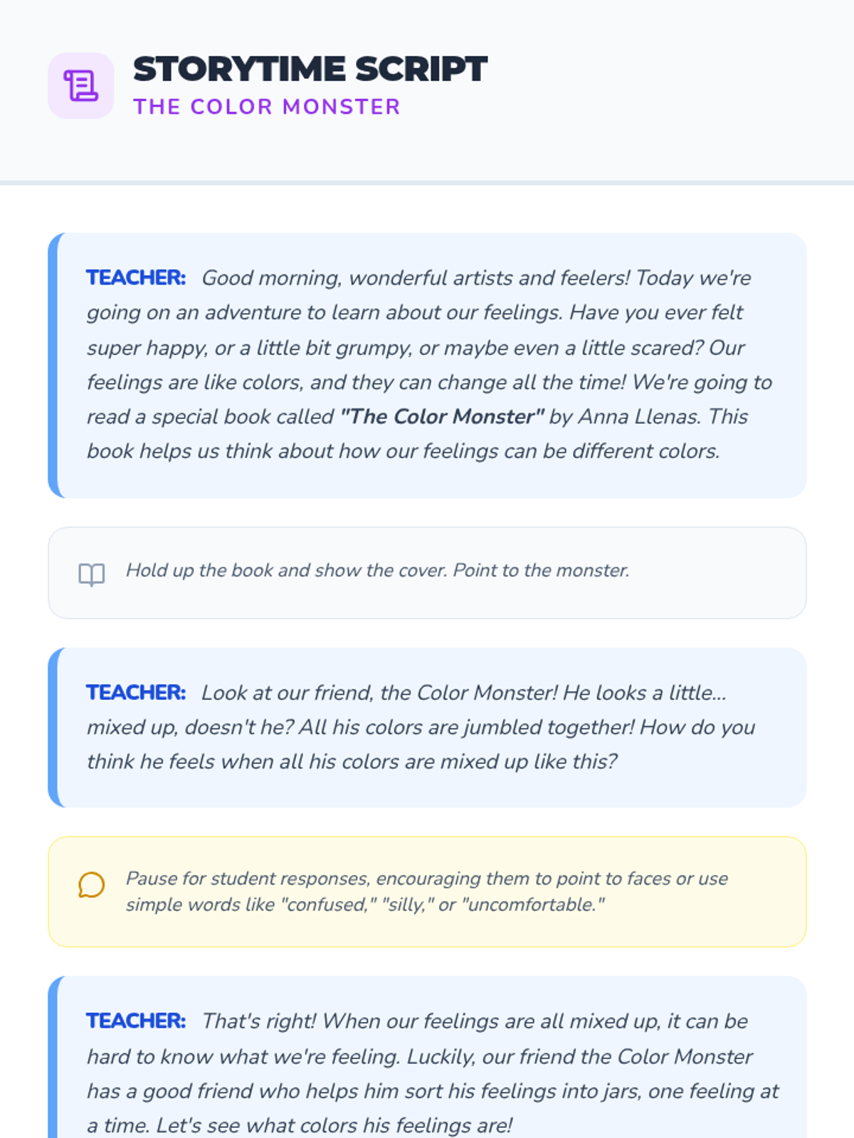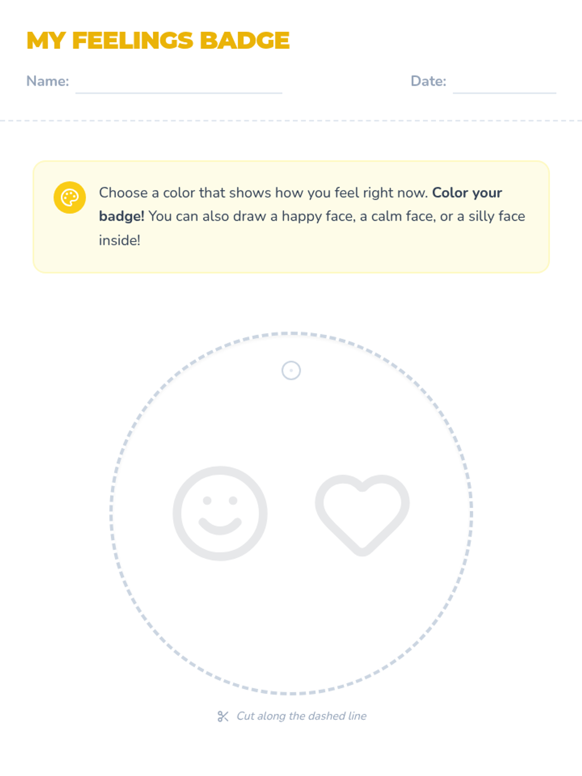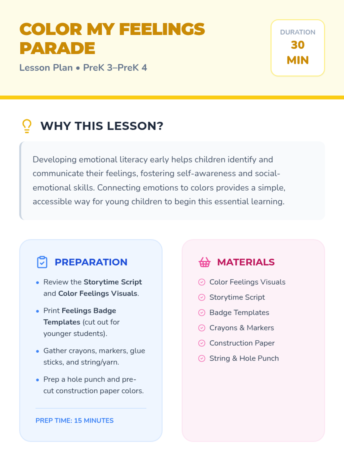 A delightful 30-minute lesson for PreK 3–PreK 4 students that helps them connect emotions to colors and express their feelings by creating a personal feelings badge.