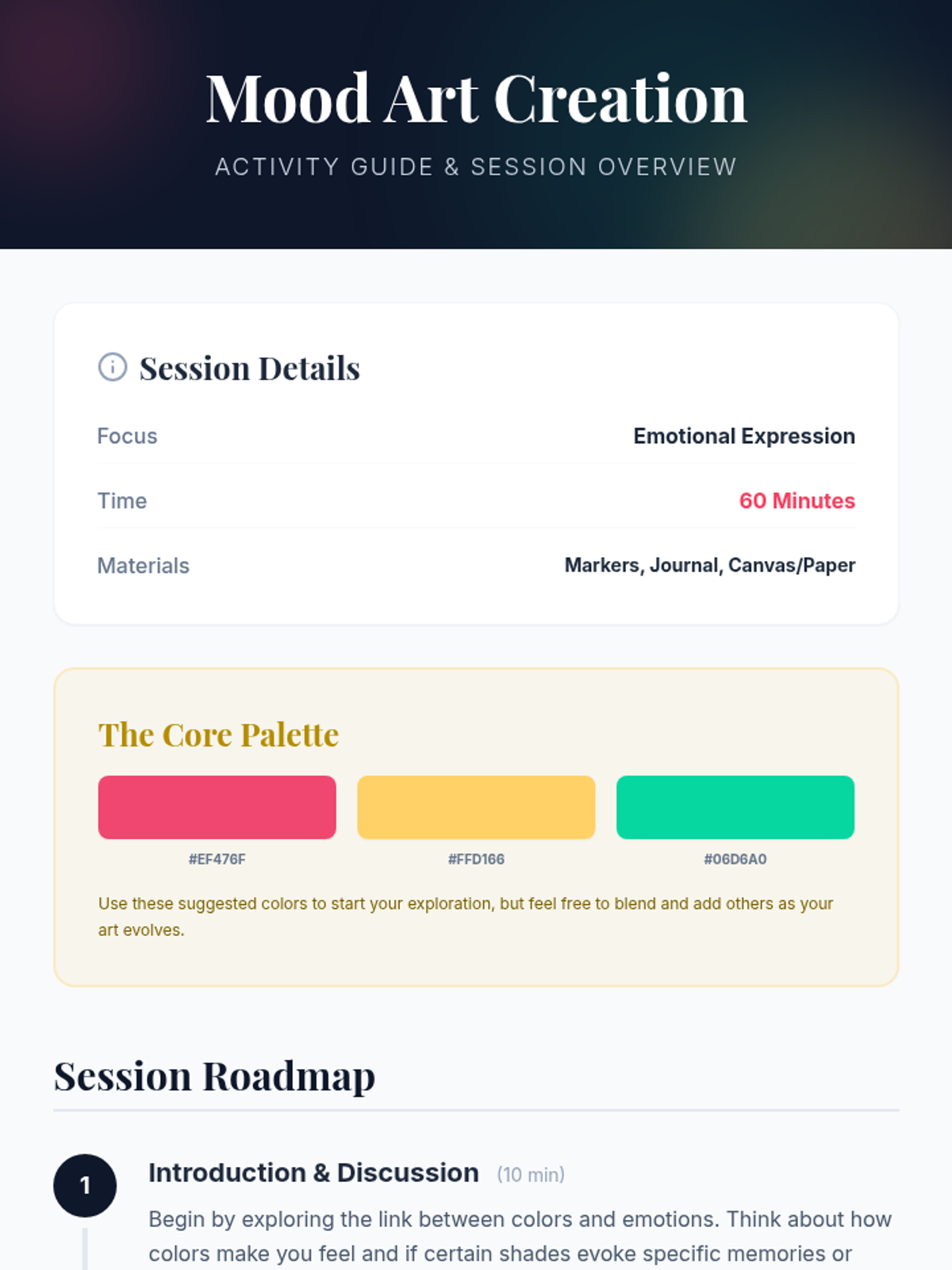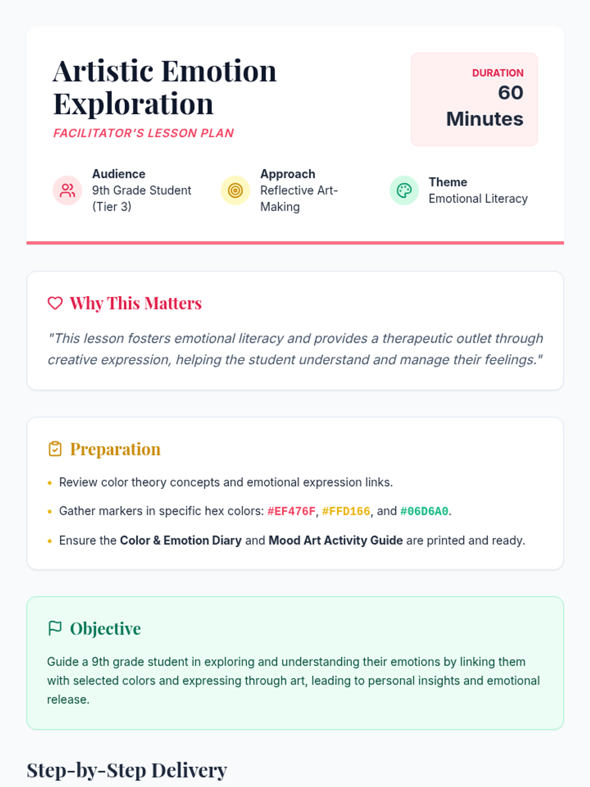 An individual Tier 3 session where a student explores their emotions through color associations and art creation to foster self-expression and emotional literacy.