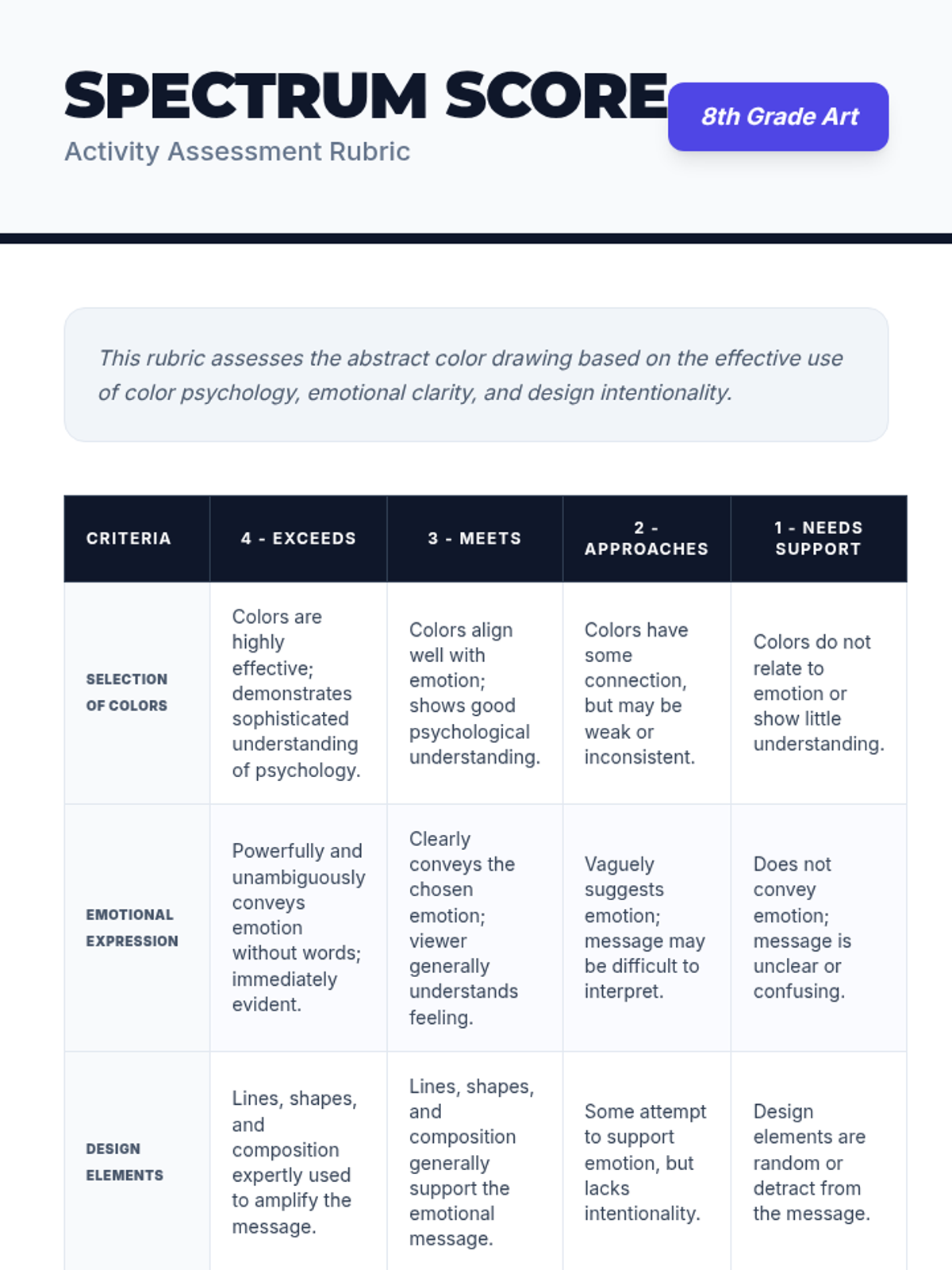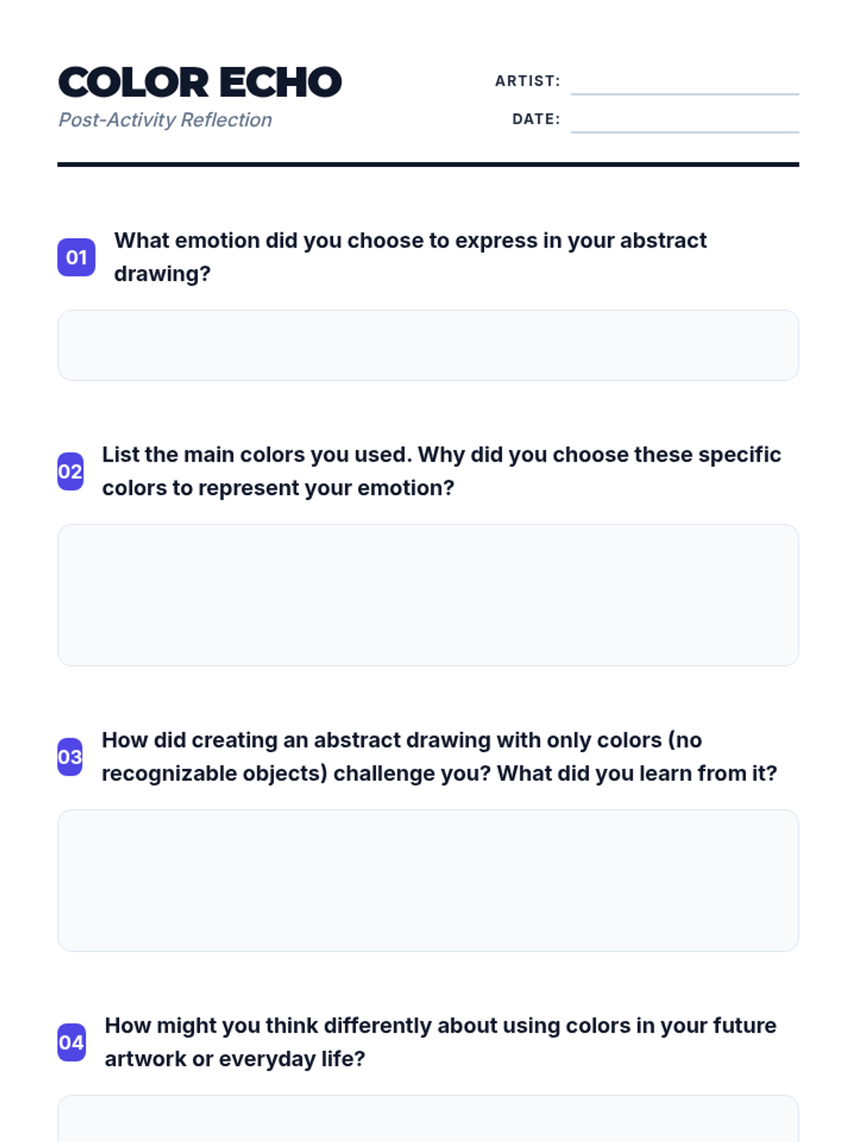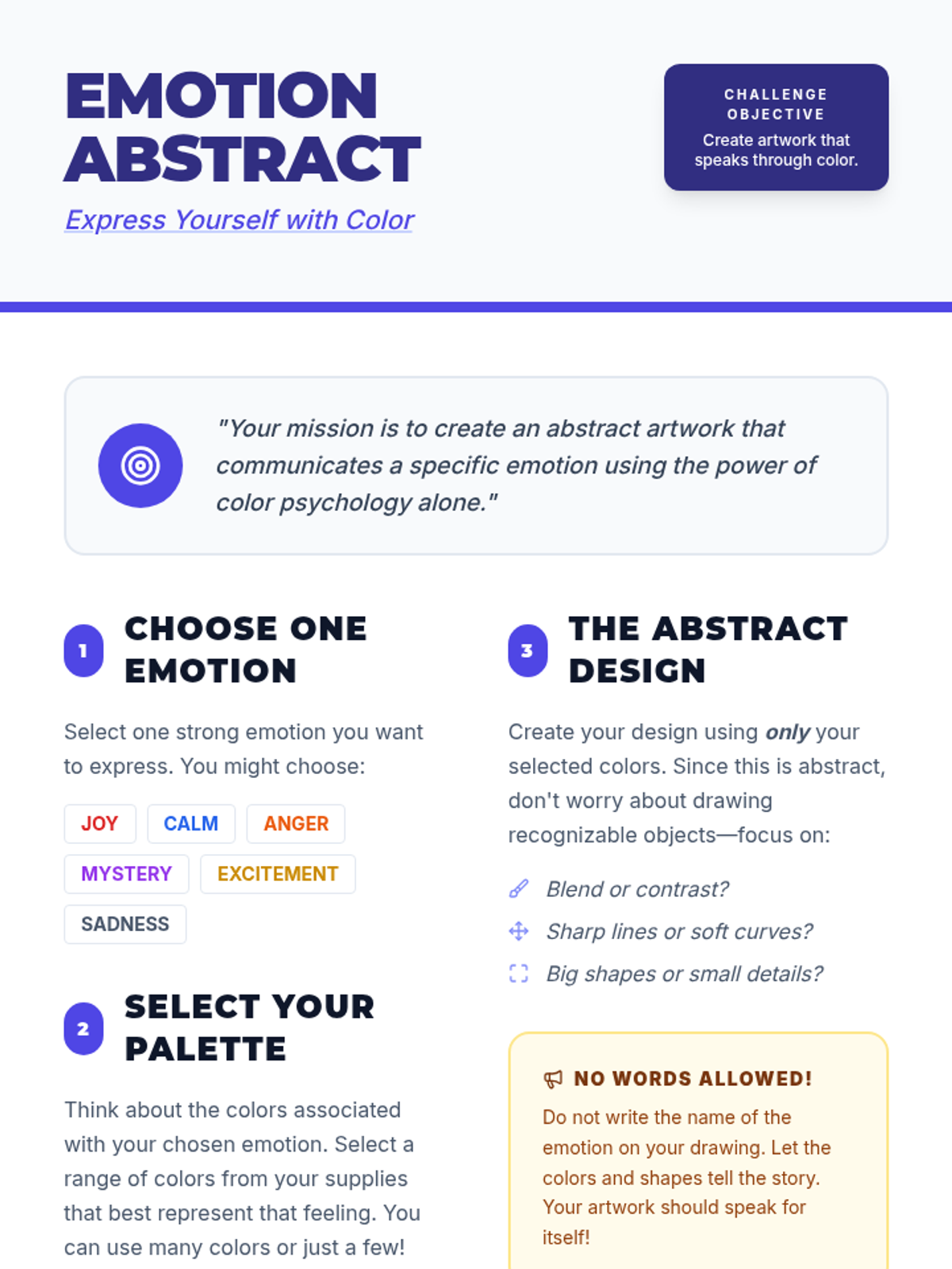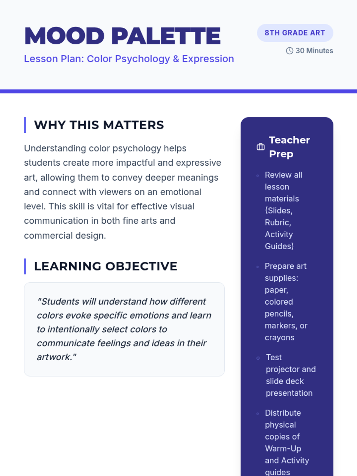 A 30-minute lesson for 8th-grade students exploring how colors influence emotions and how to use color intentionally in abstract art.