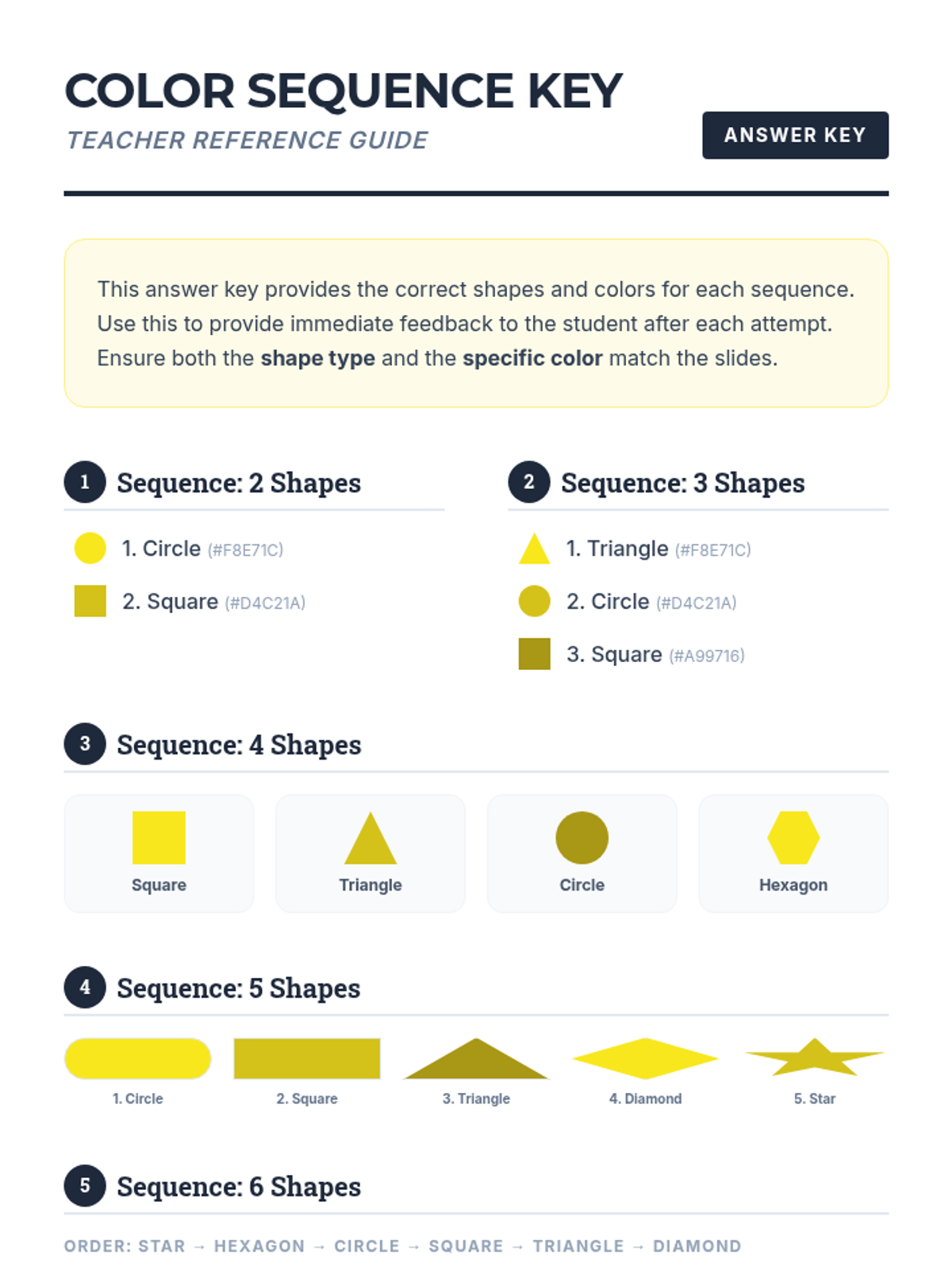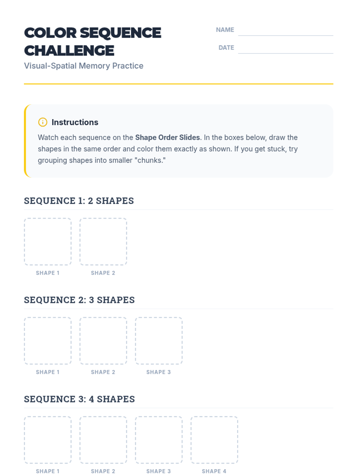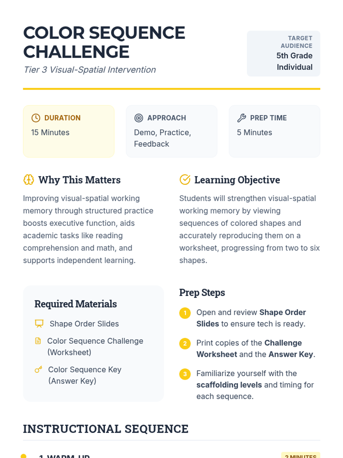 A targeted Tier 3 intervention for 5th-grade students to strengthen visual-spatial working memory. Students observe, recall, and reproduce sequences of colored shapes, moving from simple two-shape patterns to complex six-shape sequences.