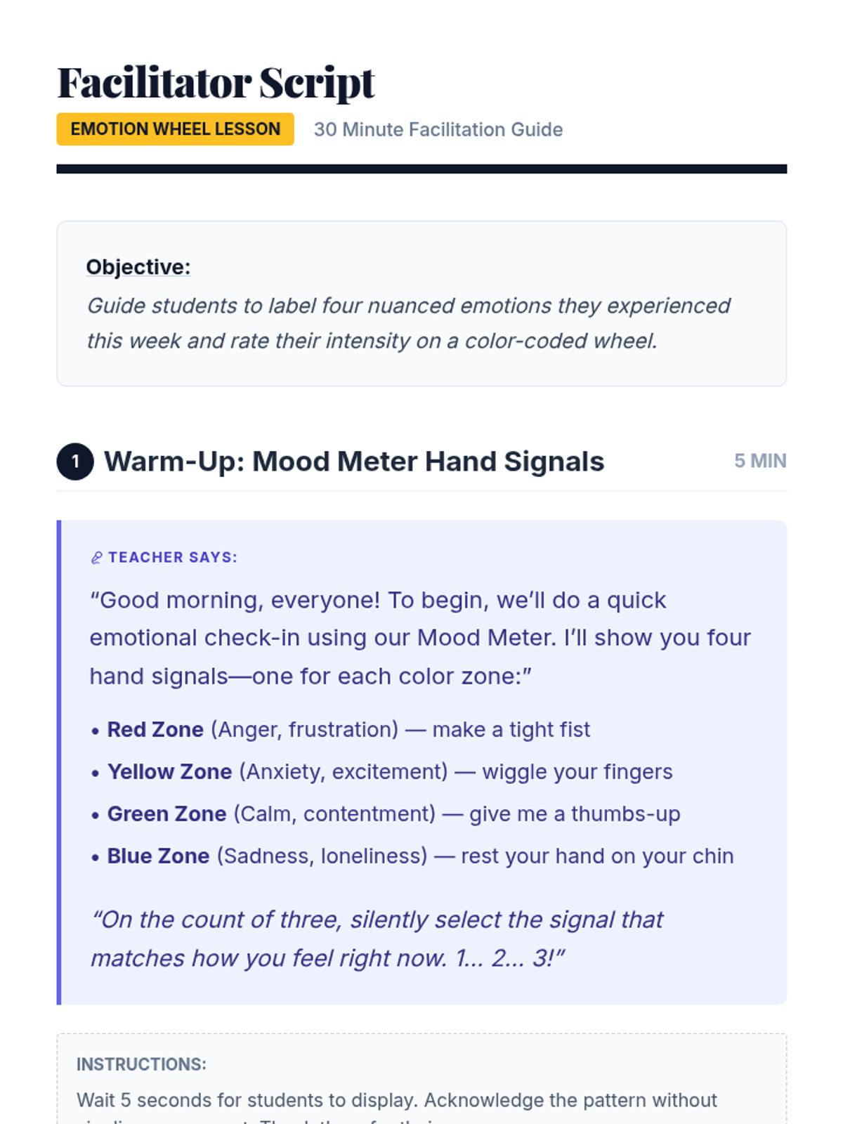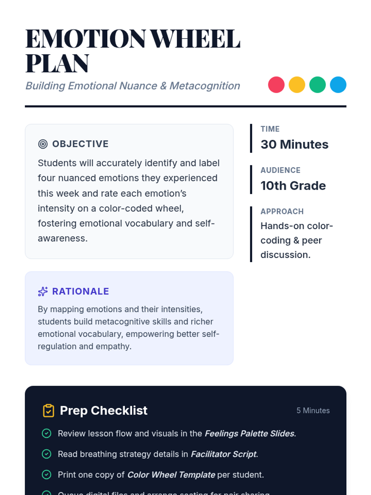 A 30-minute lesson for 10th graders to explore emotional awareness and vocabulary by mapping recent emotions and their intensities onto a color-coded wheel.