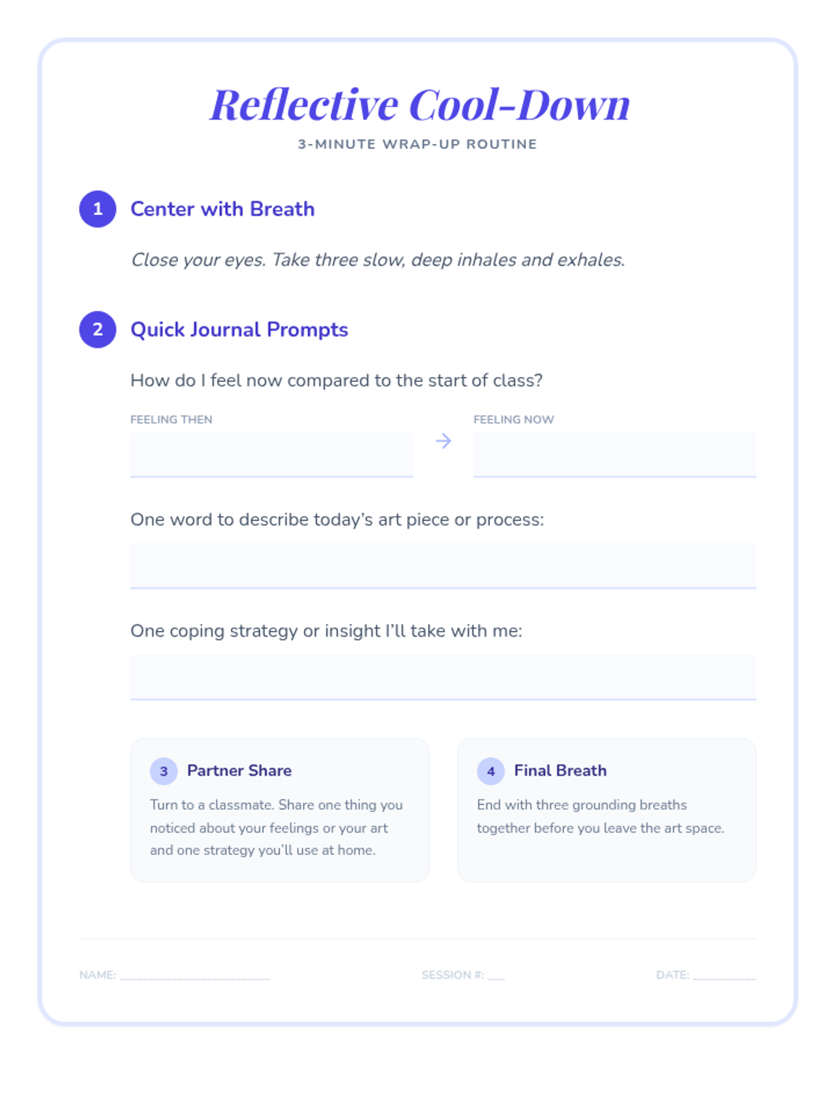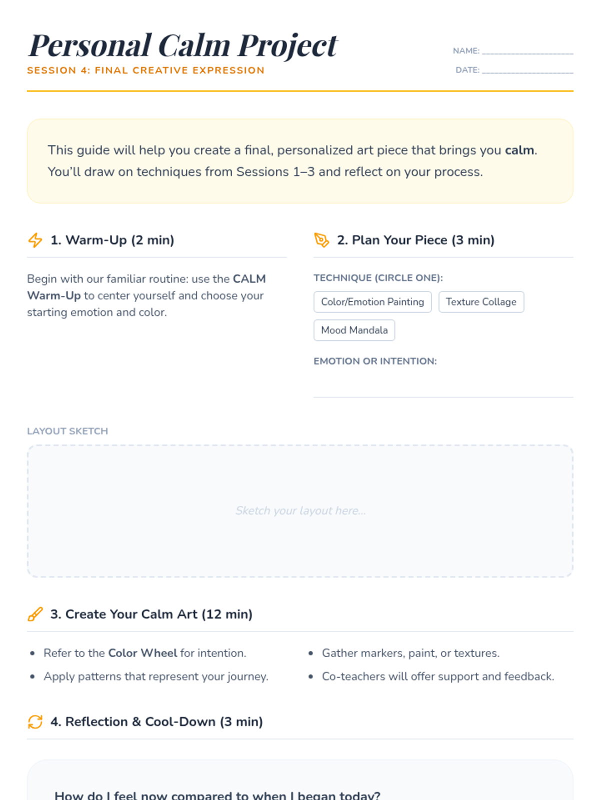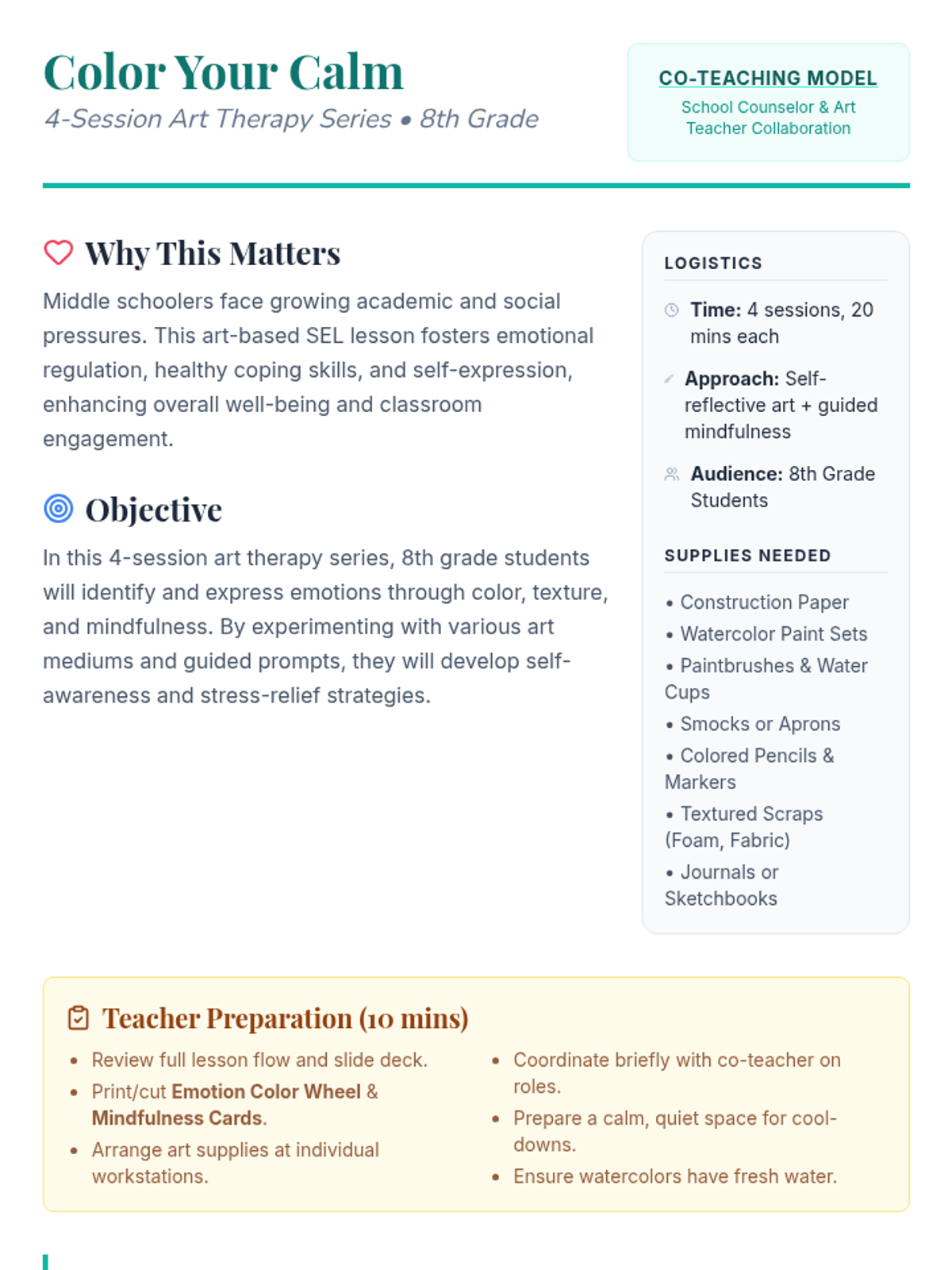 A 4-session art therapy series for 8th graders to explore emotions and stress relief through creative expression and mindfulness, co-taught with the art teacher.