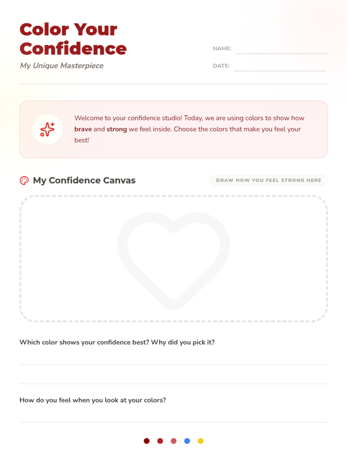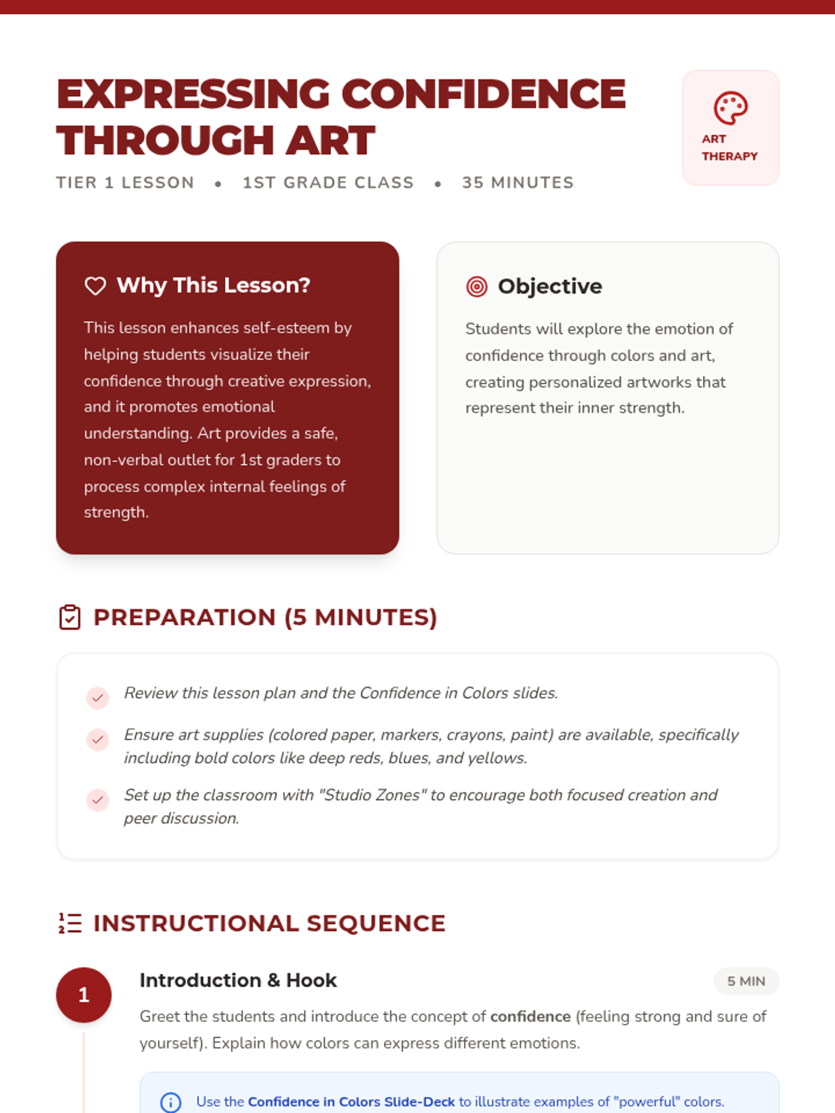 A 35-minute Tier 1 classroom lesson for 1st graders focused on visualizing self-esteem through art and color exploration. Students learn to associate colors with strength and create personal masterpieces that celebrate their inner confidence.