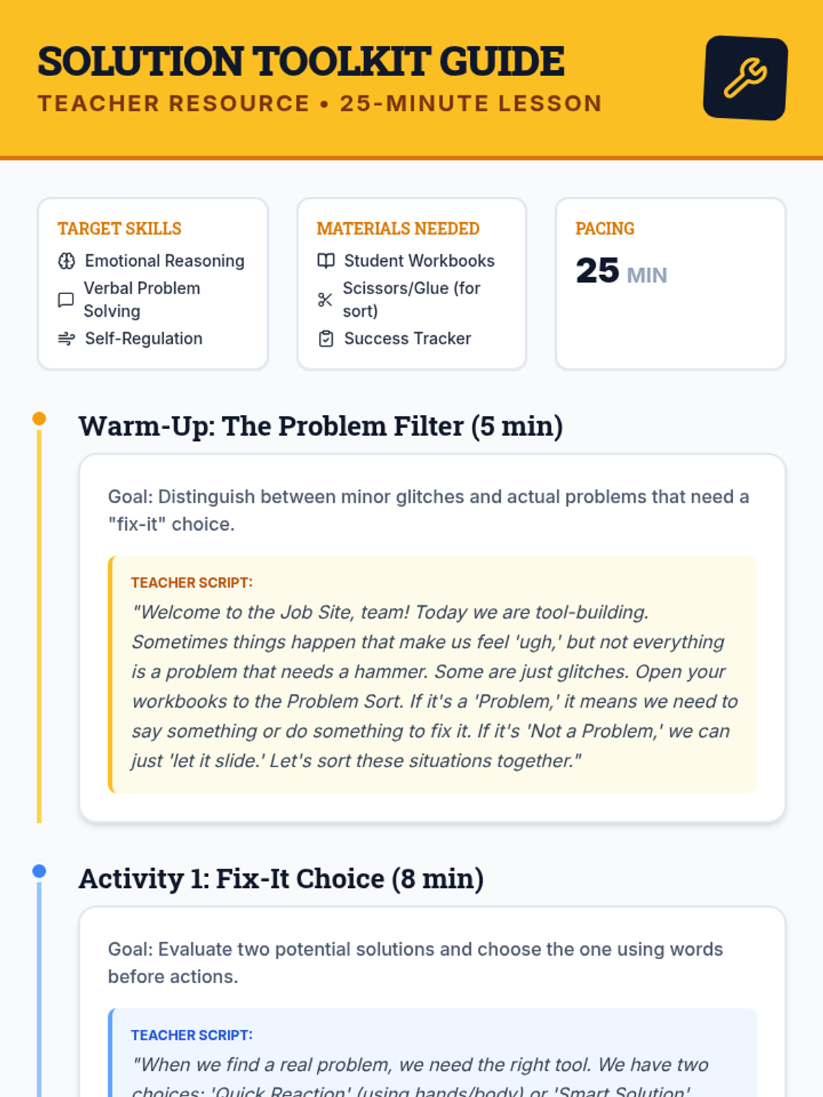 A collaborative problem-solving lesson for first graders where they learn to identify problems, brainstorm solutions, and work together through hands-on challenges. Students will practice communication and compromise as they join the 'Problem Solvers Club' to tackle group-based scenarios.