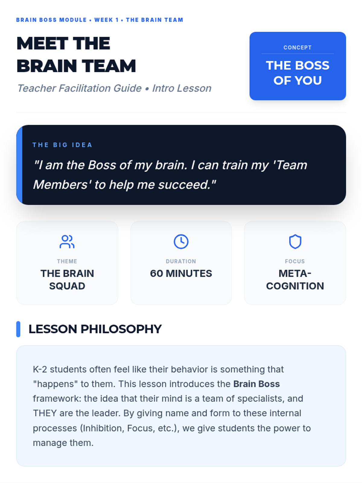 A social-emotional learning lesson for grades 1-3 that teaches students self-regulation through 'The Cool Down Crew,' a team of actionable brain break strategies. Students learn to identify when they need a reset and how to choose the right strategy to refocus.