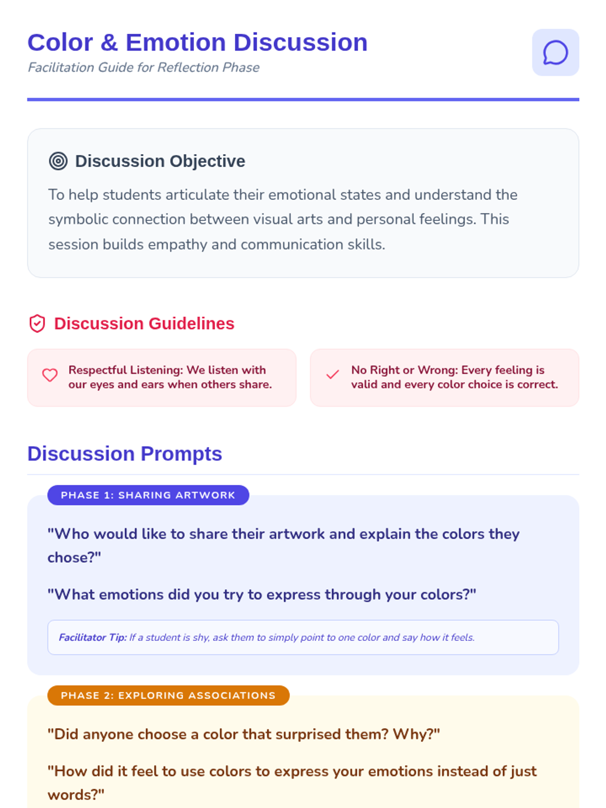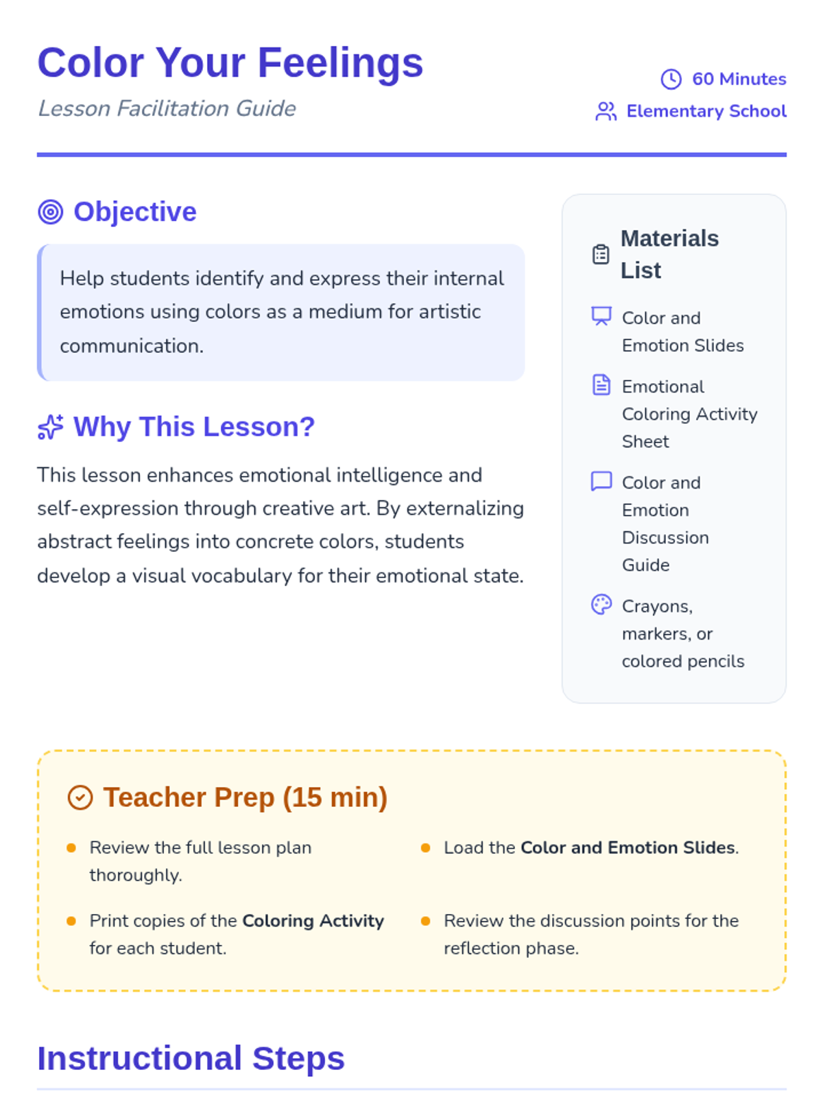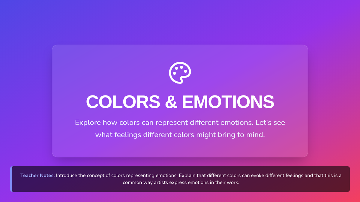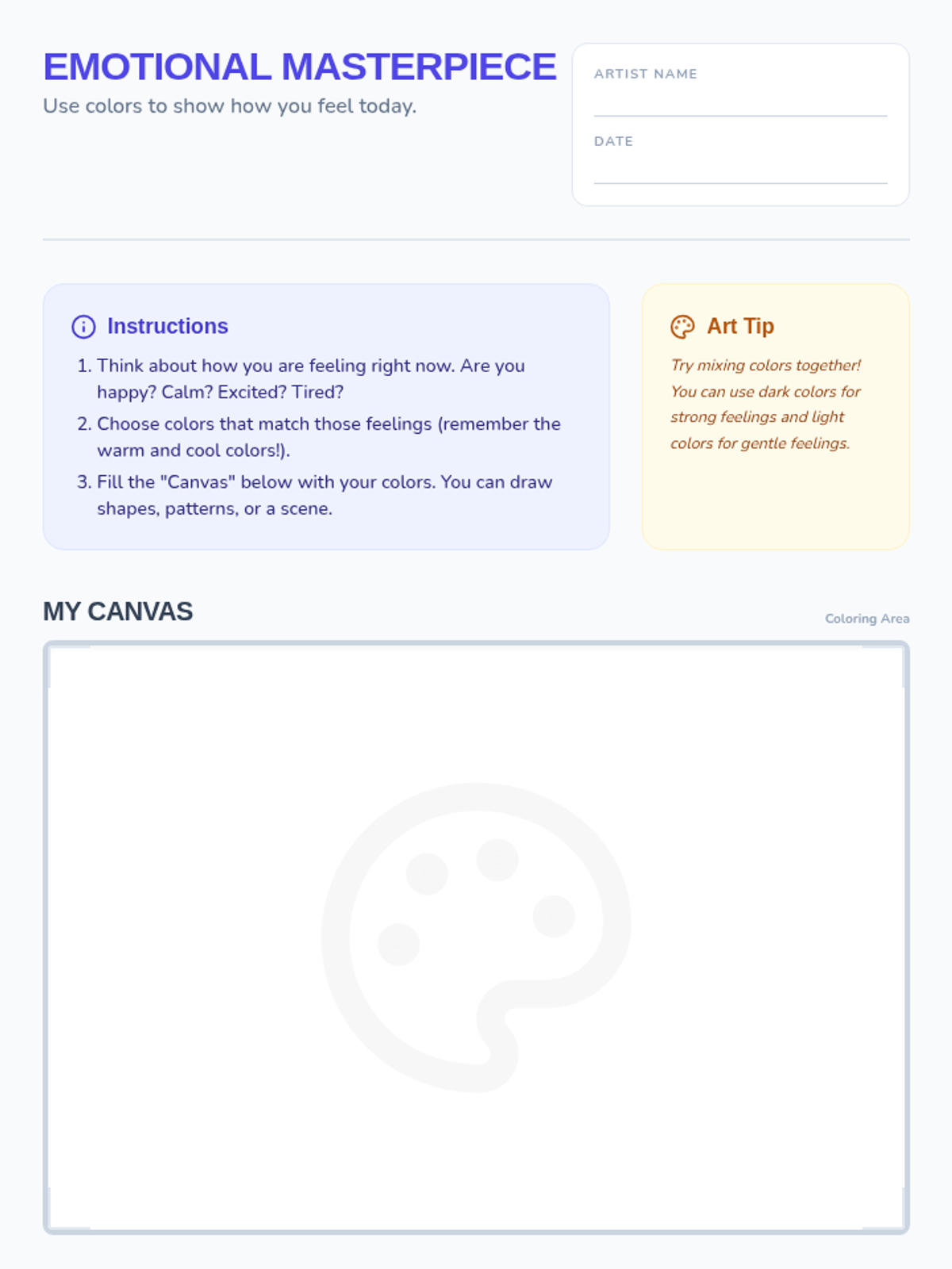 A creative 60-minute lesson for elementary students focused on identifying and expressing emotions through colors and art. Students will explore color associations and create their own emotional masterpieces.