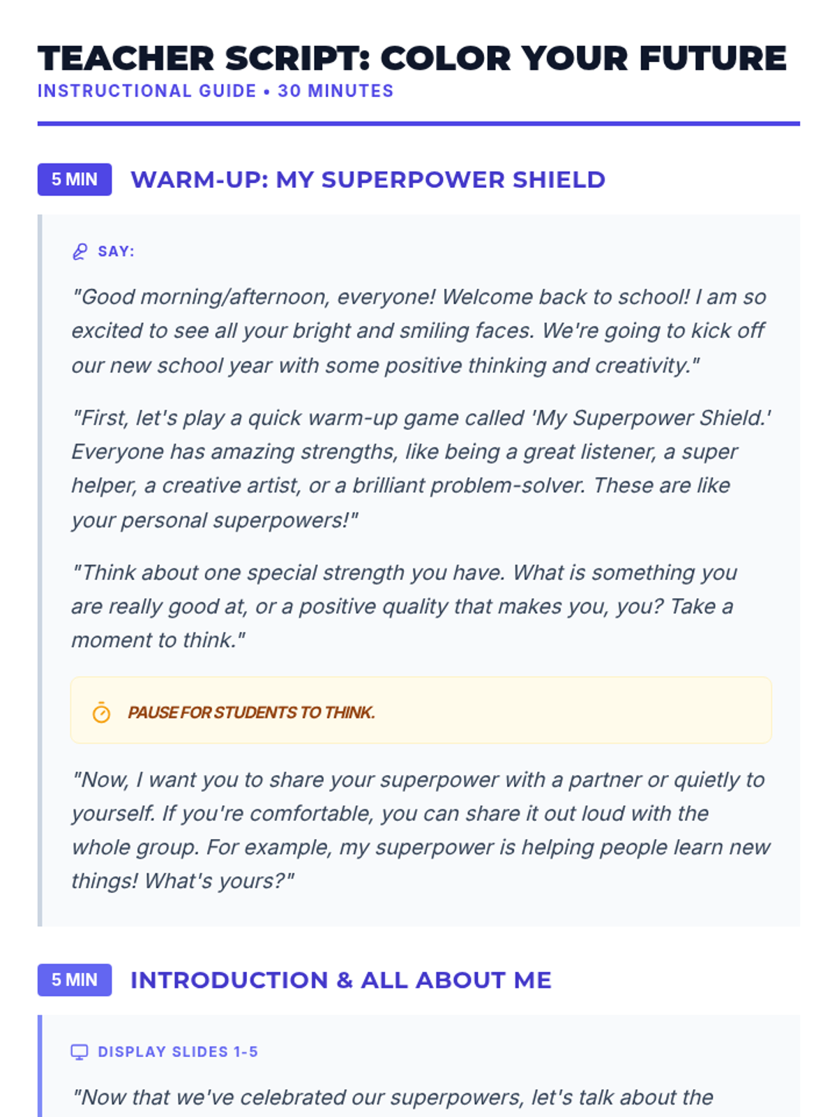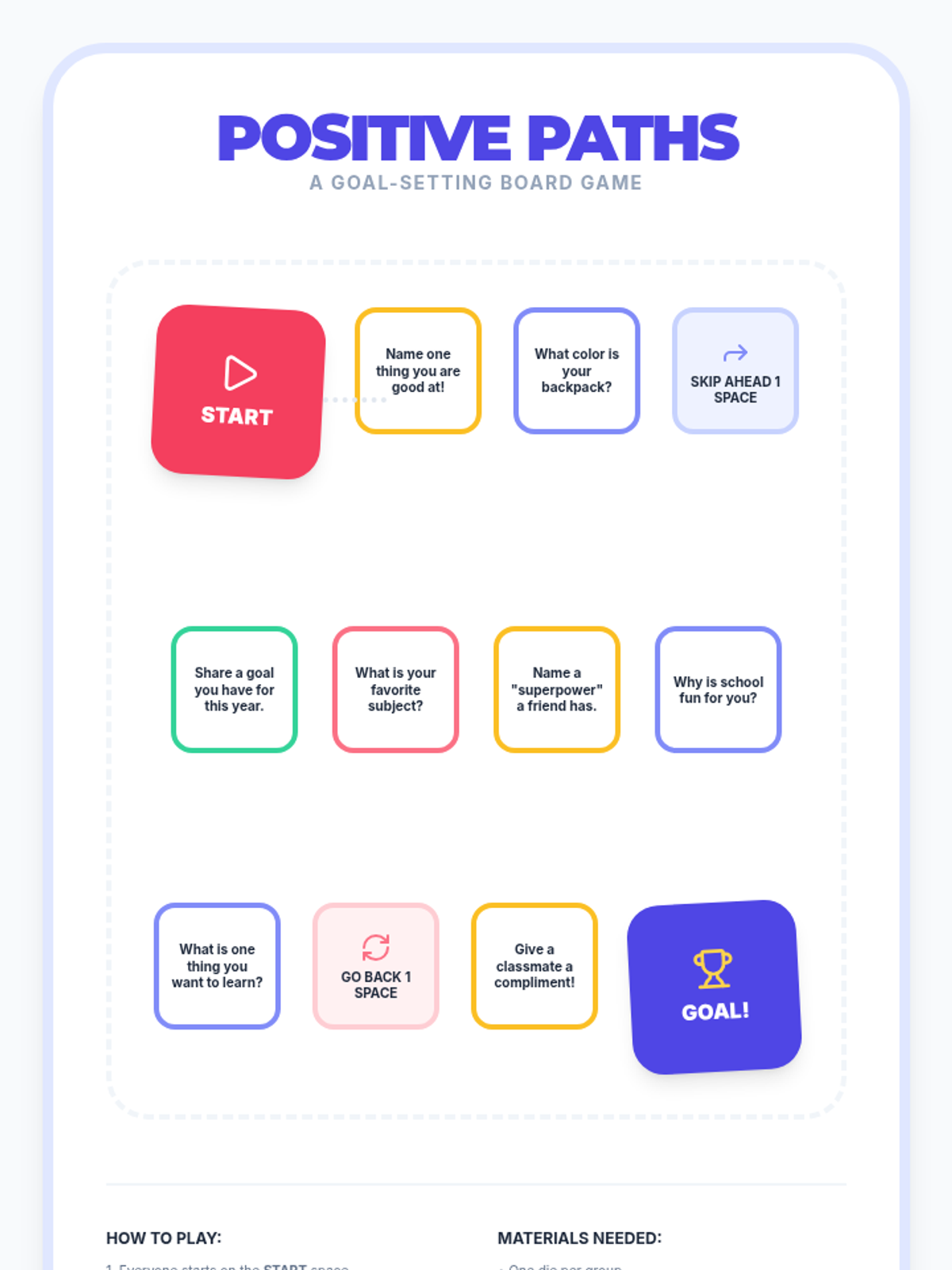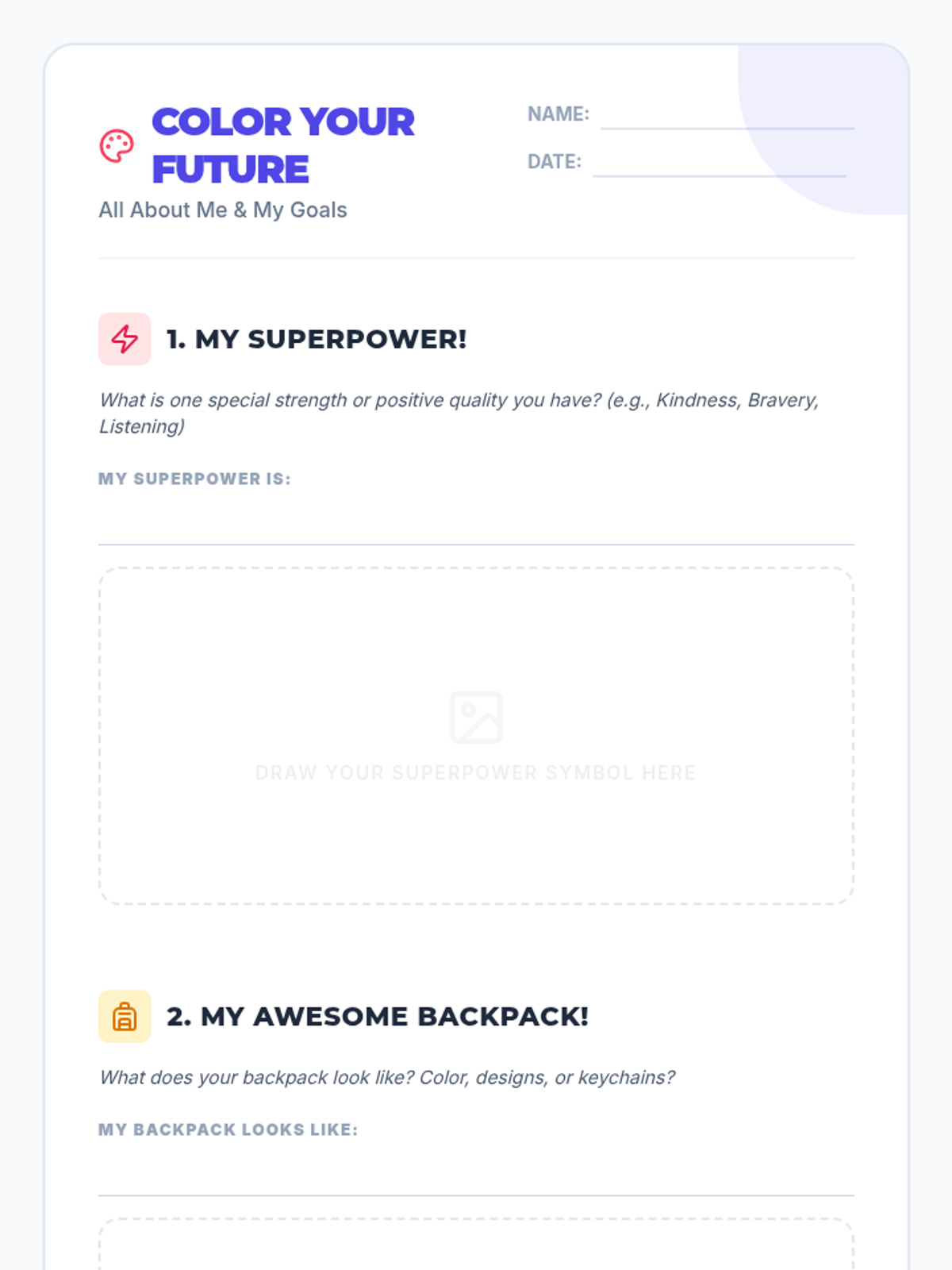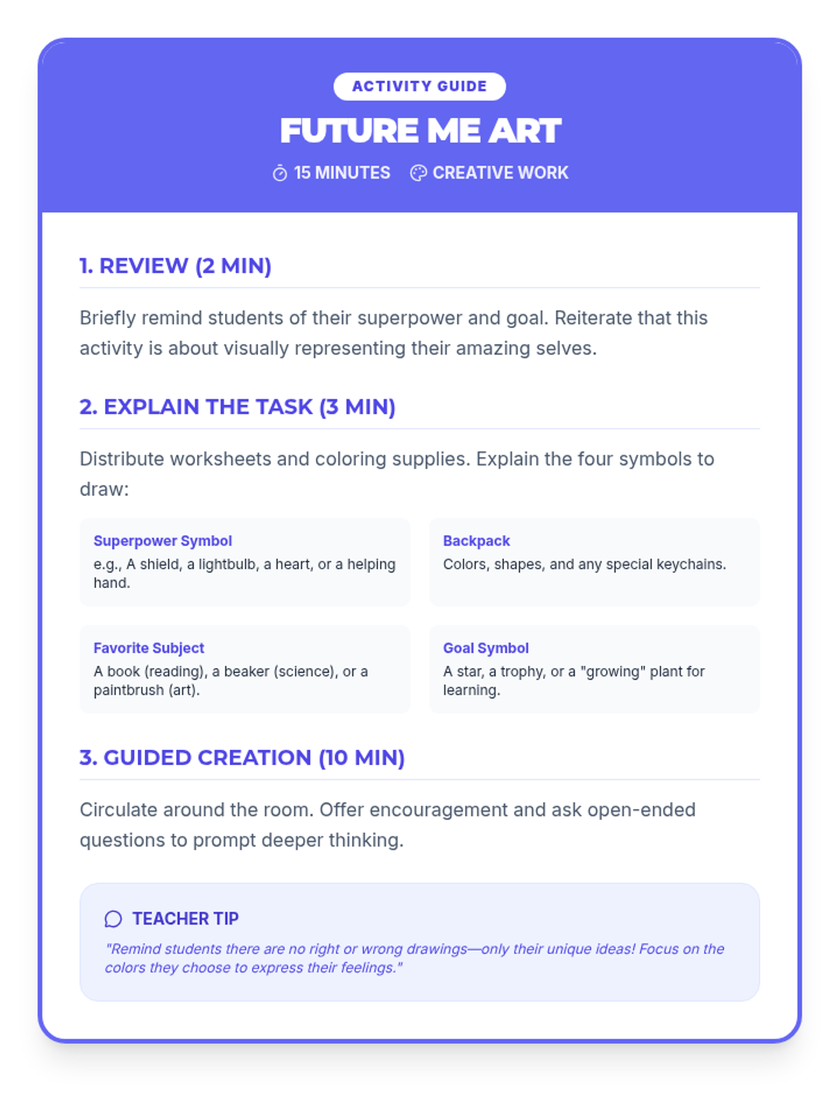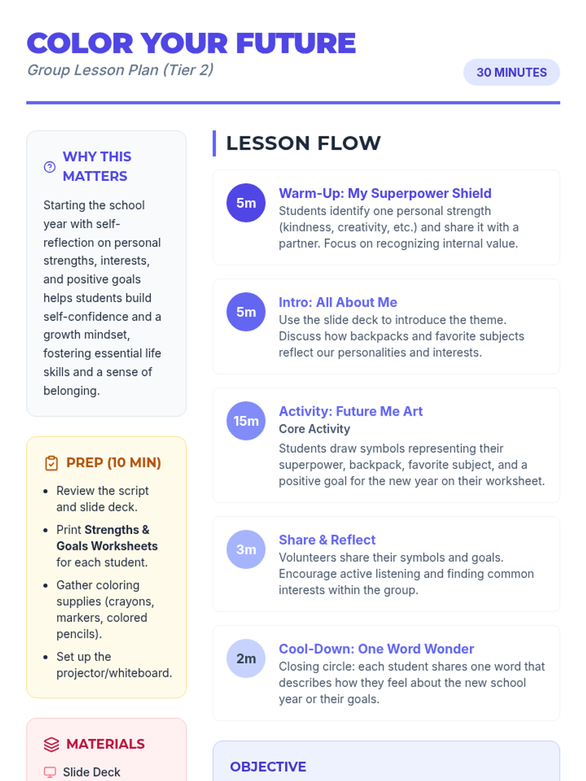 A 30-minute creative Tier 2 group lesson helping students reflect on their strengths, share their interests, and set positive goals for the new school year through art and reflection.