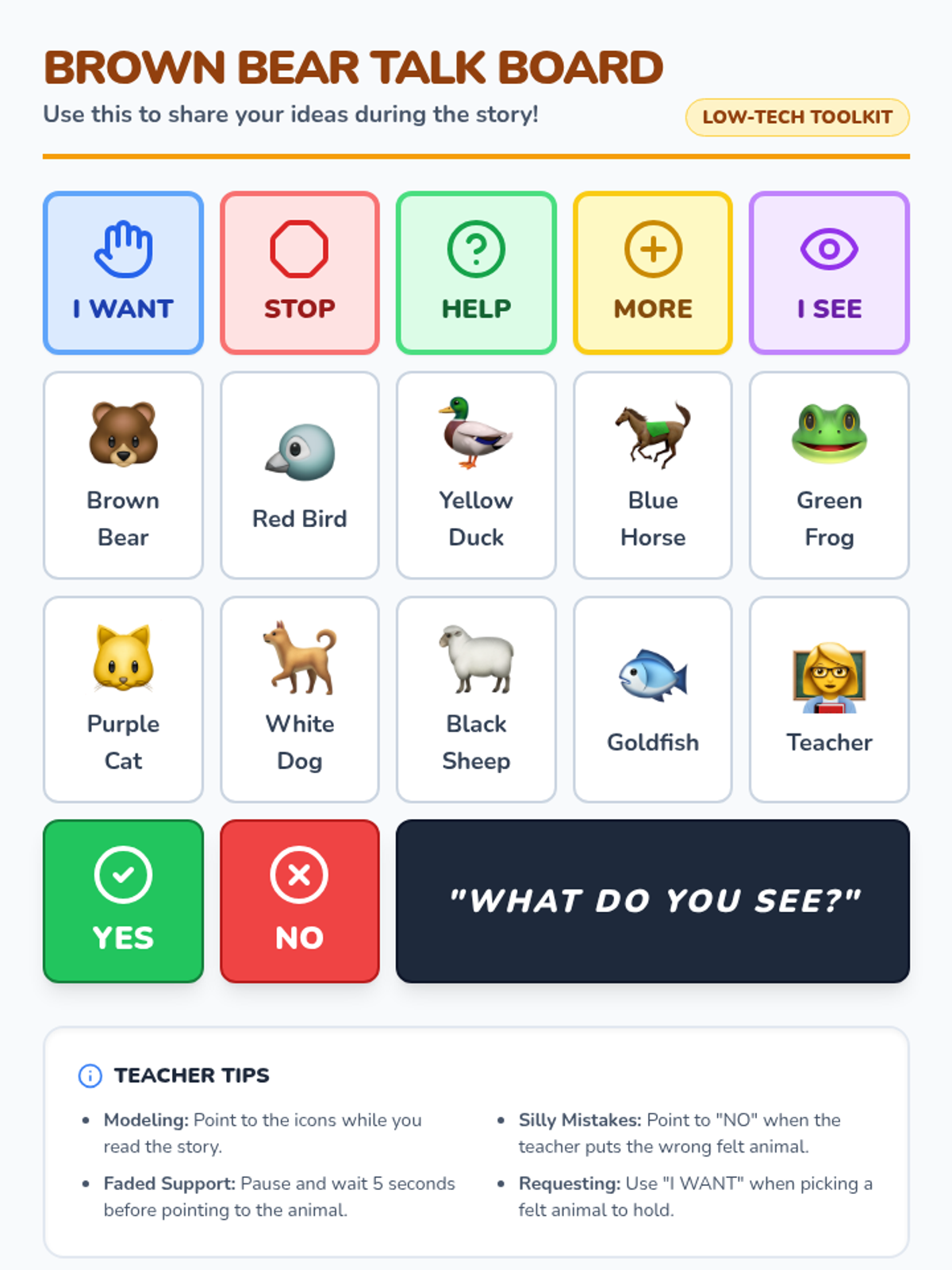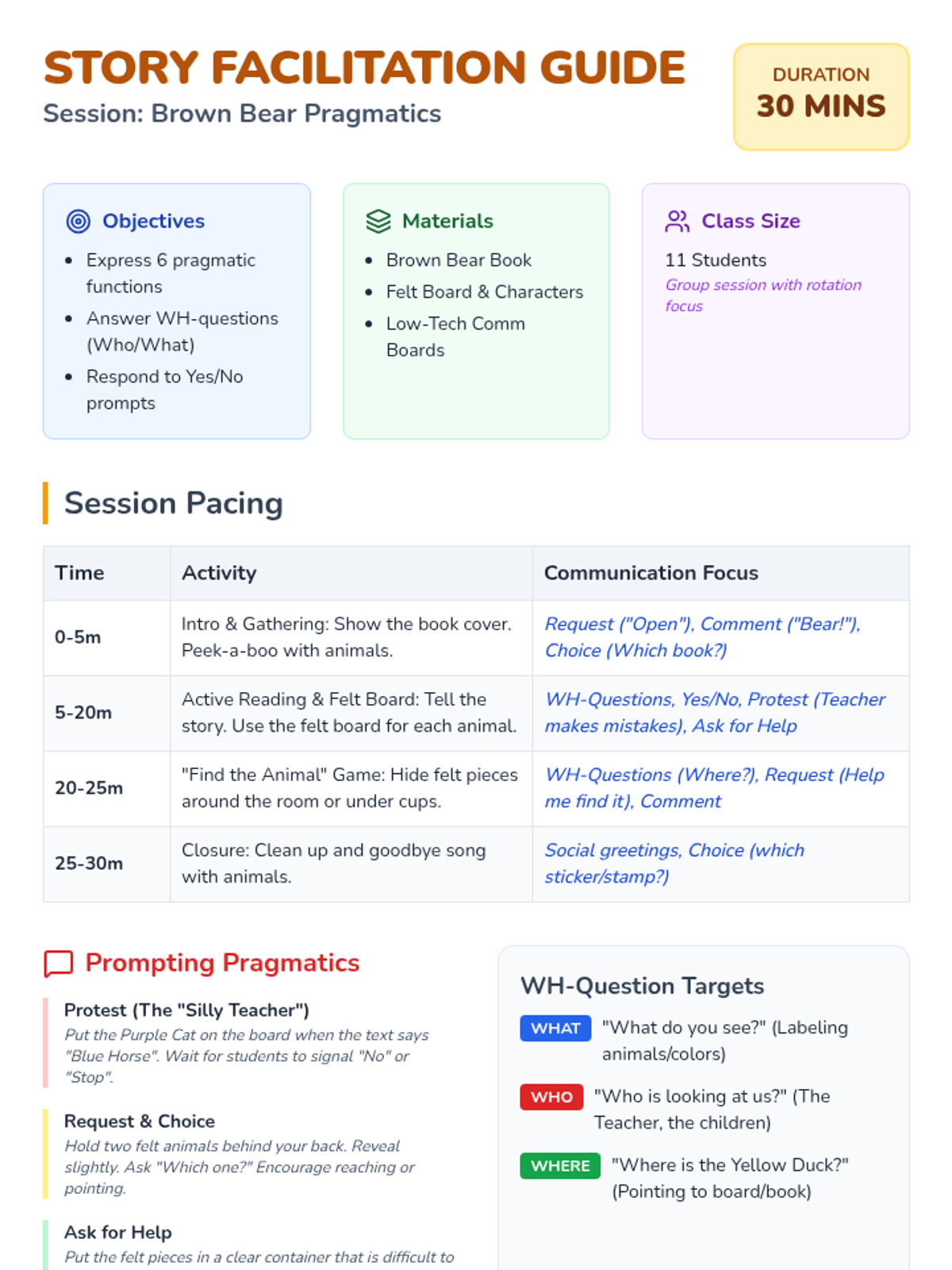 A 30-minute interactive communication lesson based on 'Brown Bear, Brown Bear, What Do You See?' focusing on pragmatic functions and WH-questions using low-tech visuals and felt board activities.