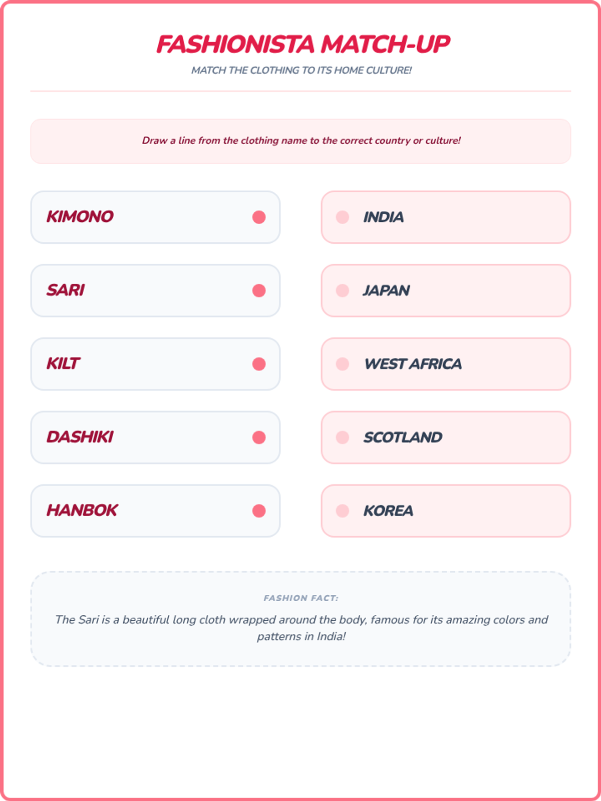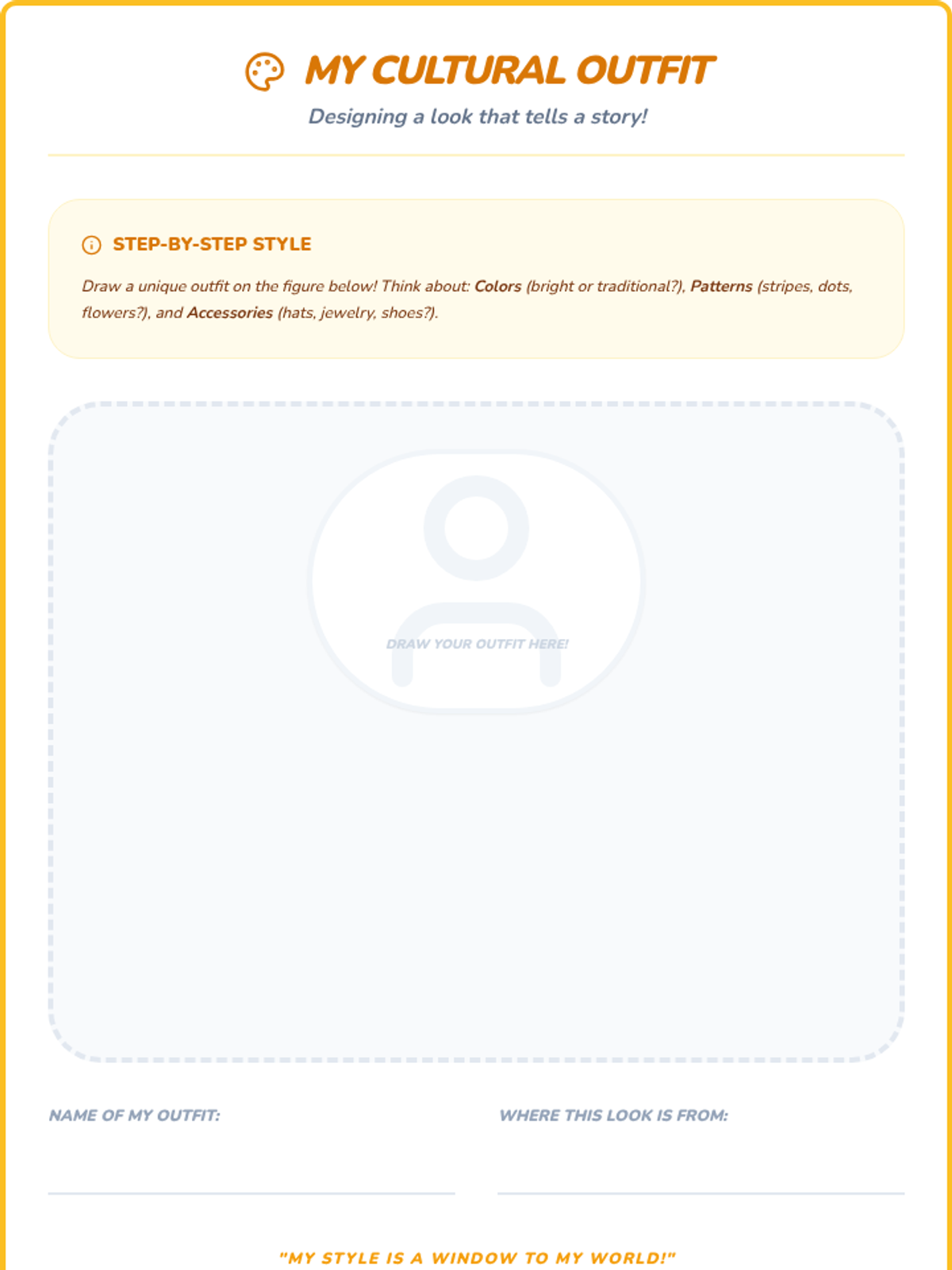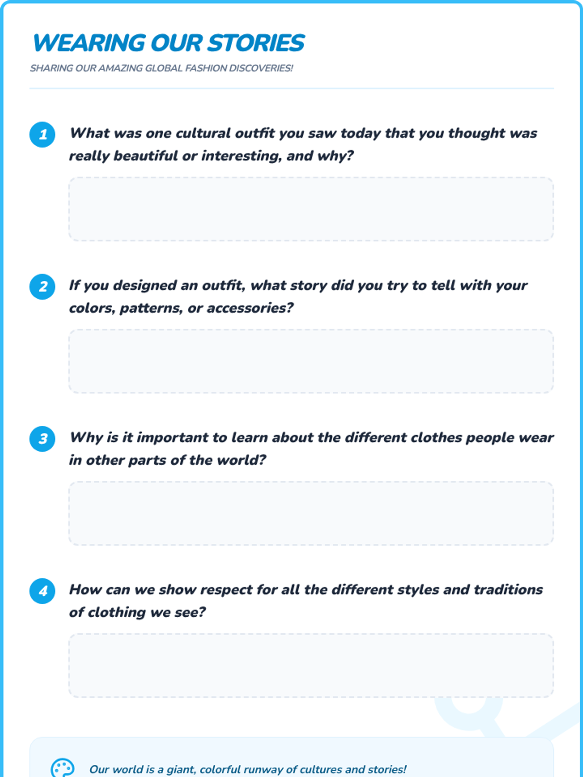 Students explore diverse cultural clothing, recognizing how clothing reflects heritage, traditions, and values, and fostering appreciation for global styles.