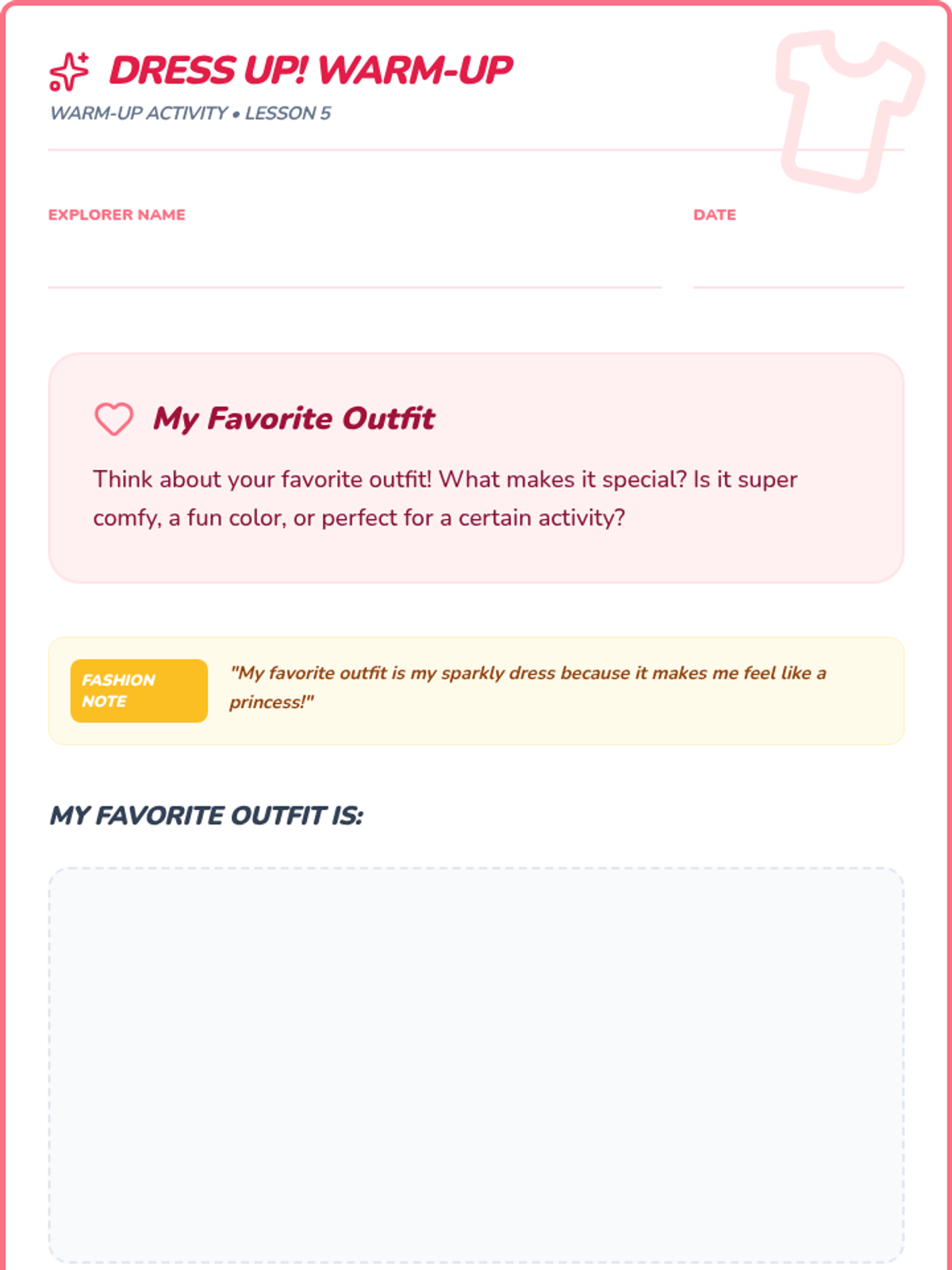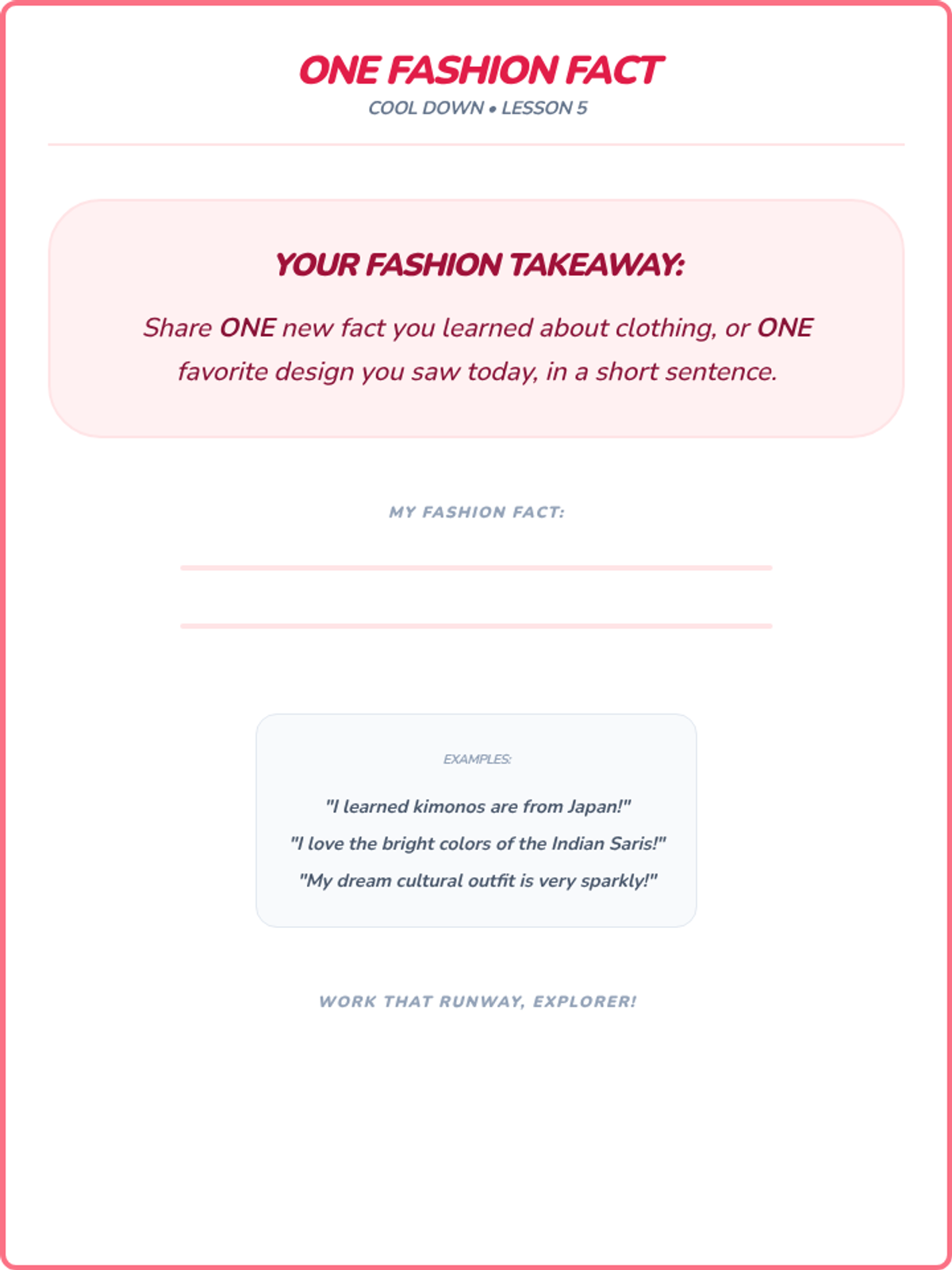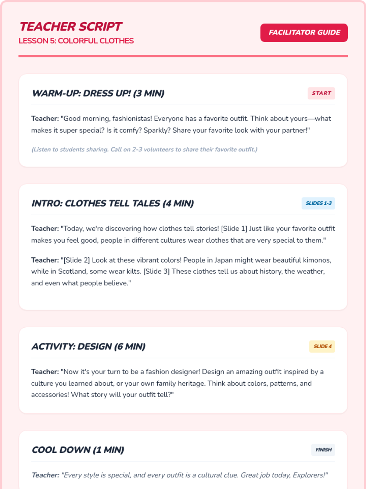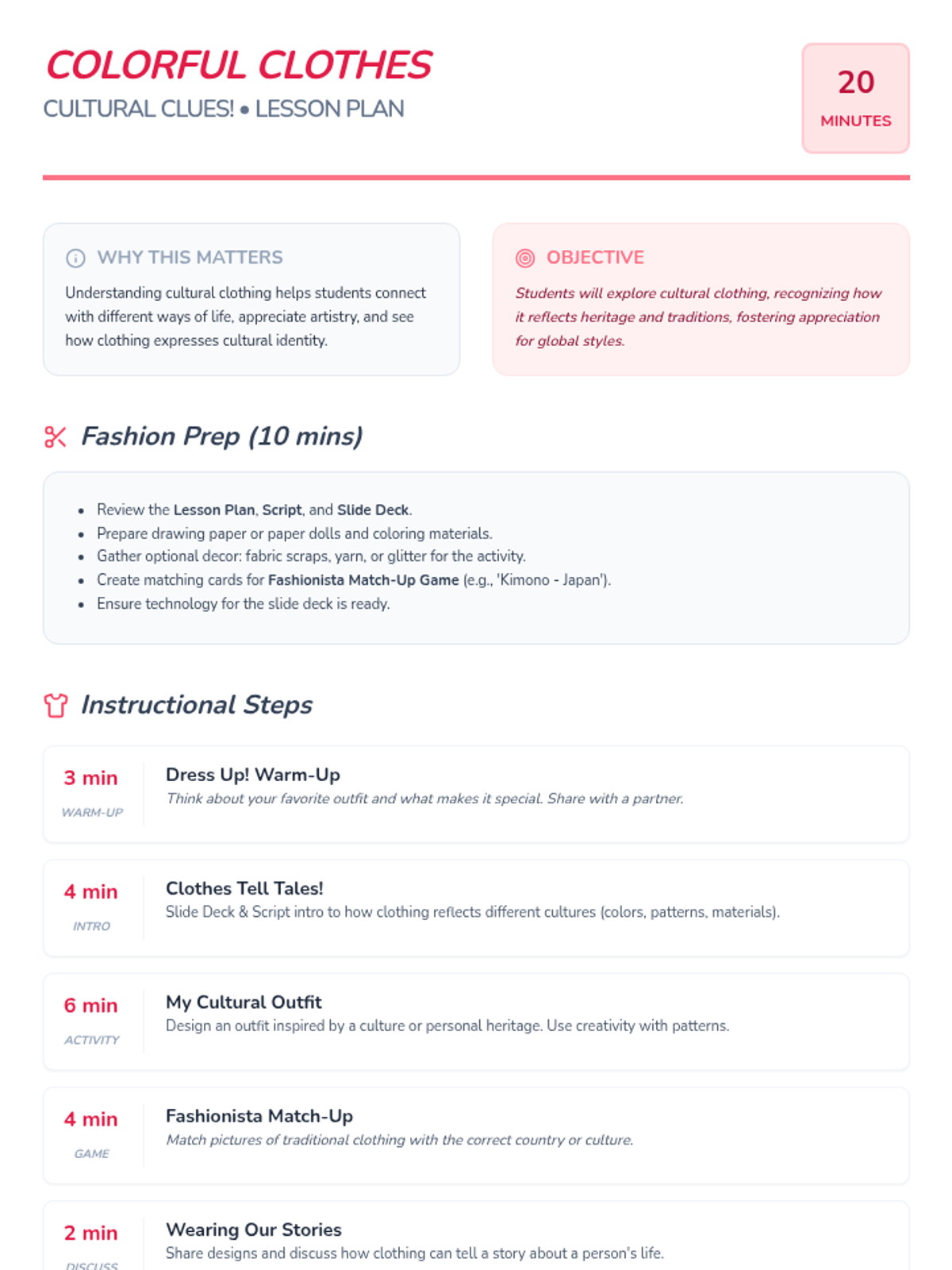 Students explore diverse cultural clothing, recognizing how clothing reflects heritage, traditions, and values, and fostering appreciation for global styles.