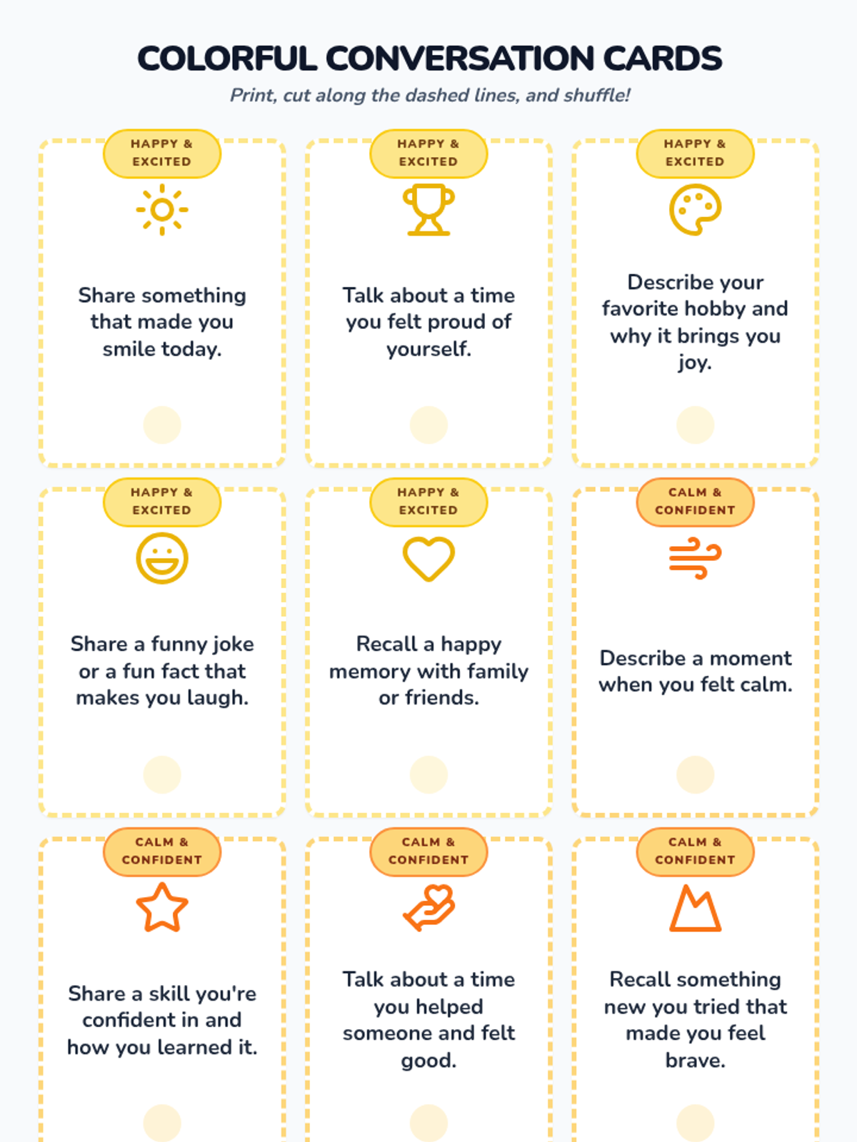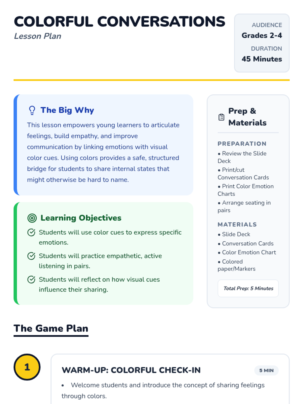 A 45-minute lesson for grades 2-4 where students use color-coded conversation cards to express emotions and practice empathetic listening skills.