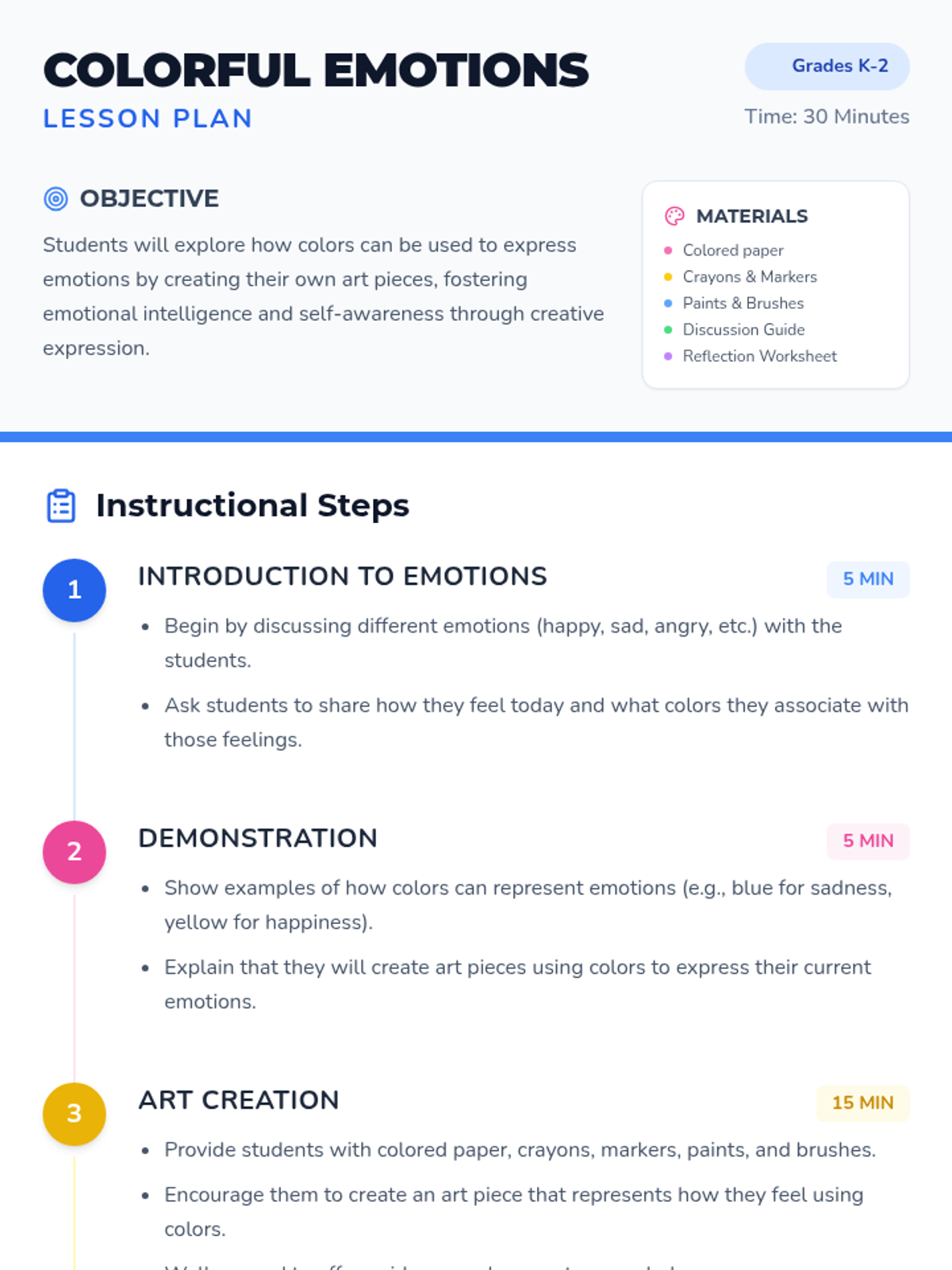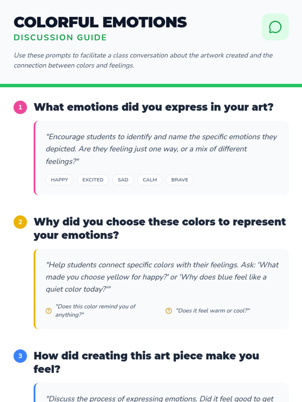 Students explore the connection between colors and feelings by creating expressive art pieces, fostering emotional intelligence and self-awareness in early learners.