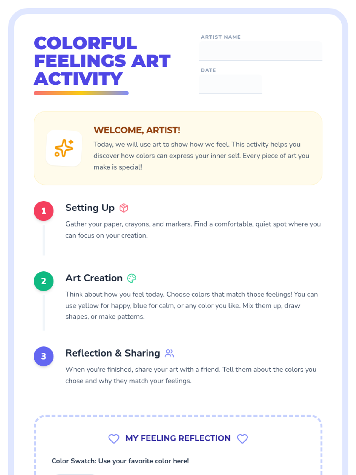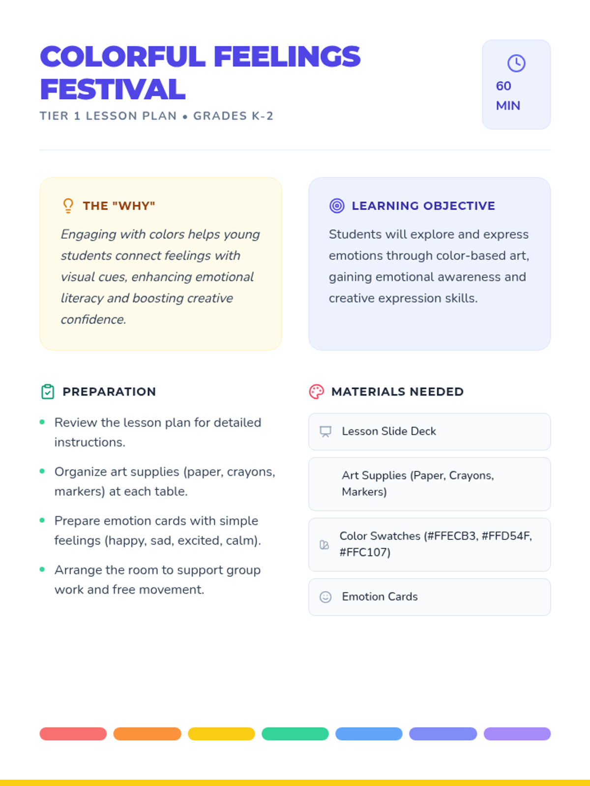 A creative K-2 lesson that helps students explore and express their emotions through the medium of color and art, building emotional literacy and creative confidence.