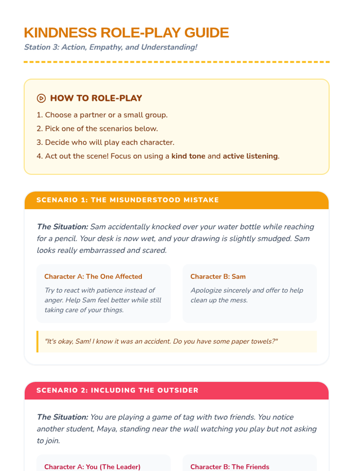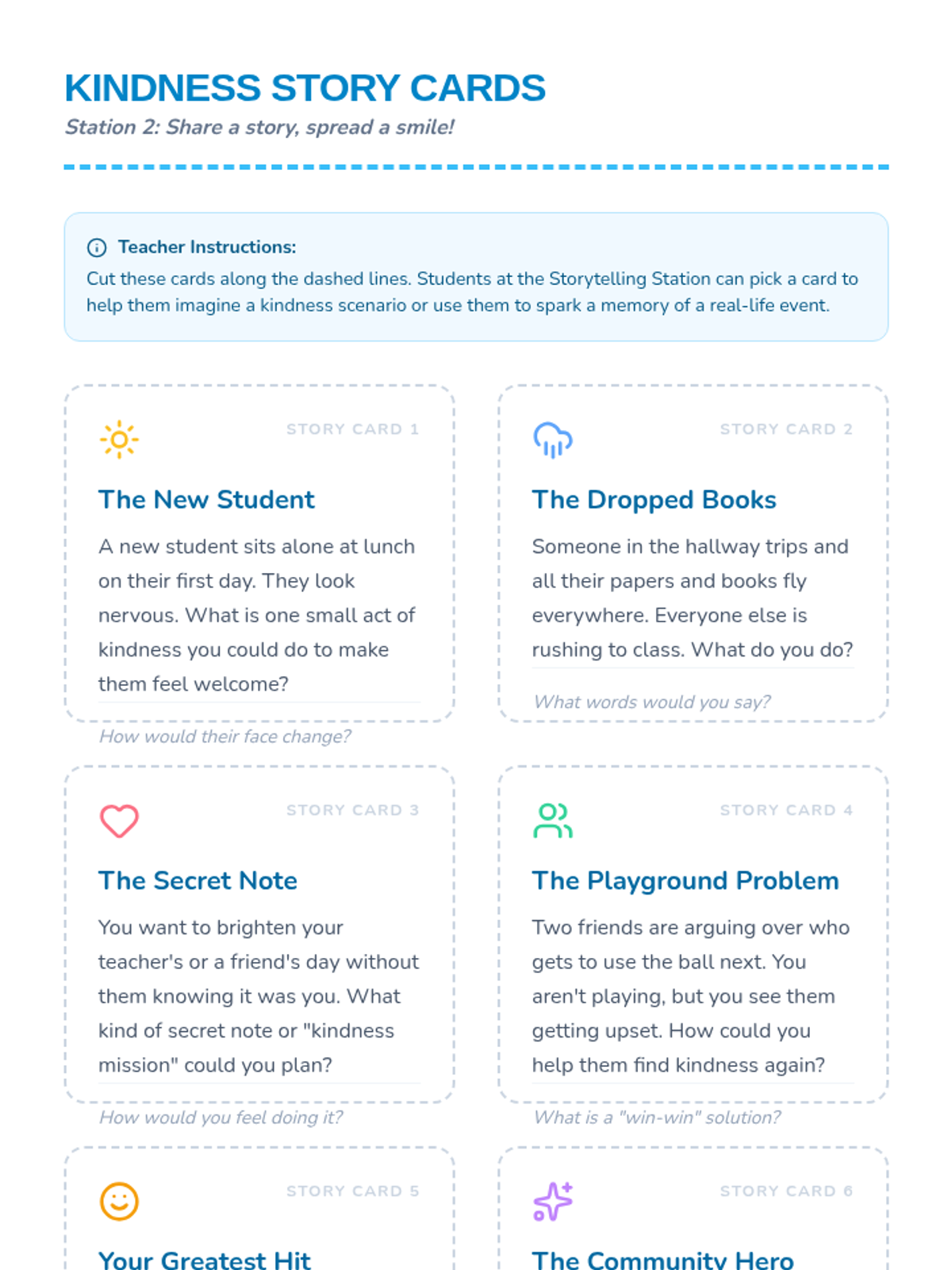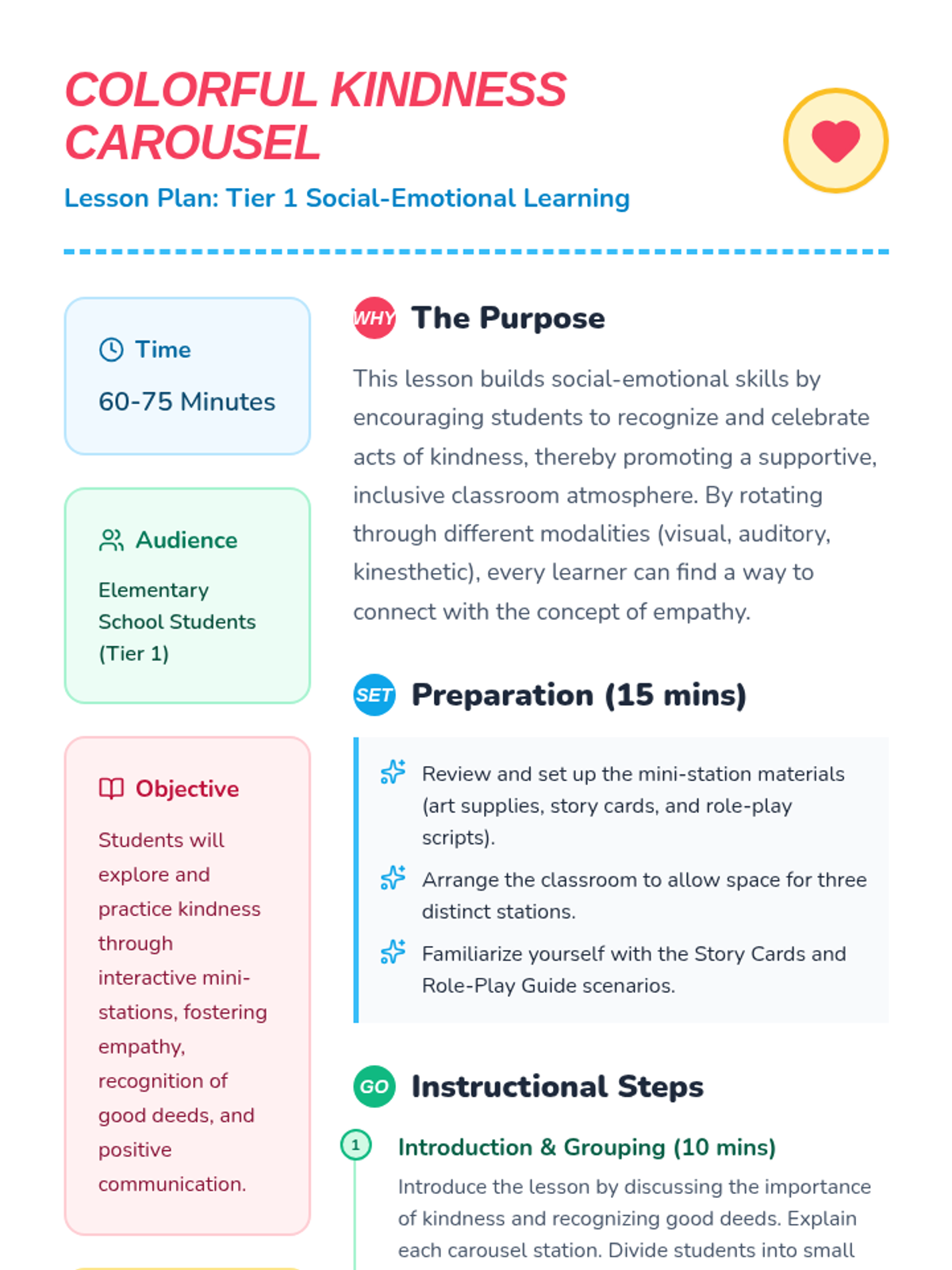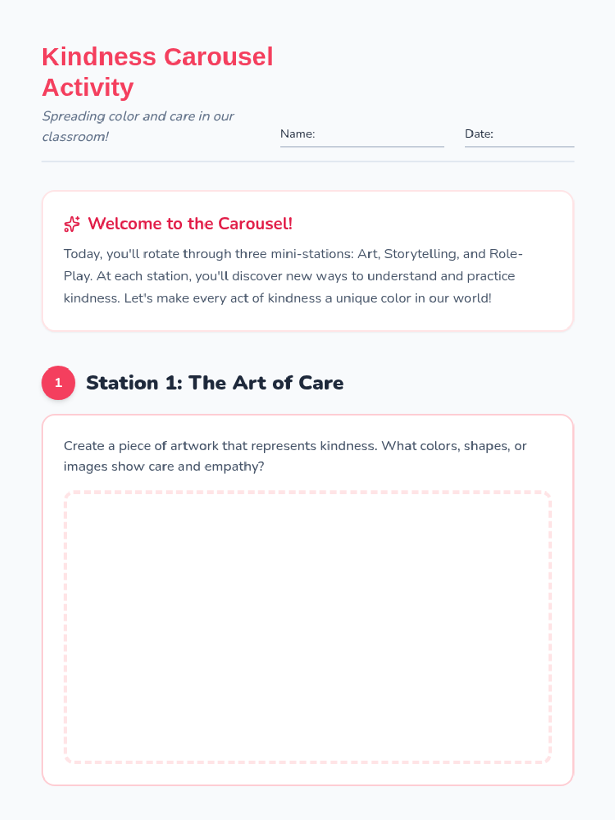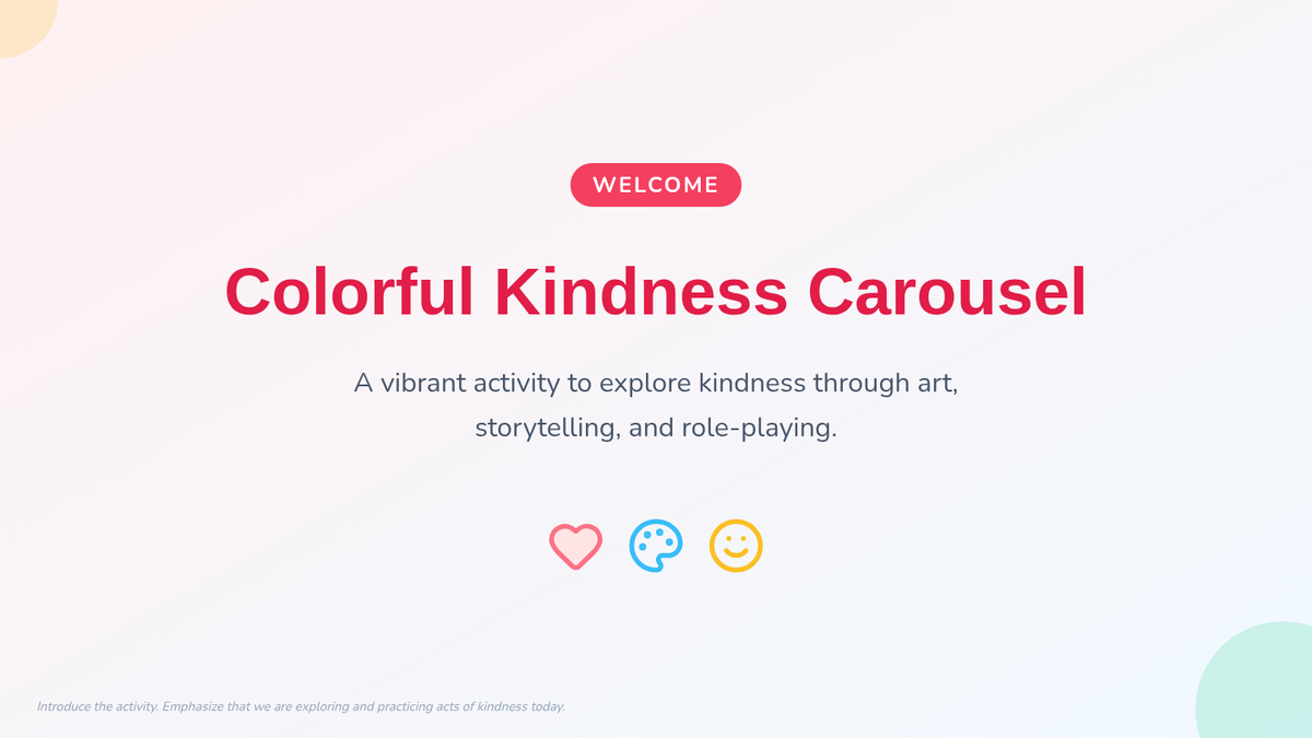 A vibrant, interactive lesson where students explore kindness through art, storytelling, and role-playing at carousel-style mini-stations.