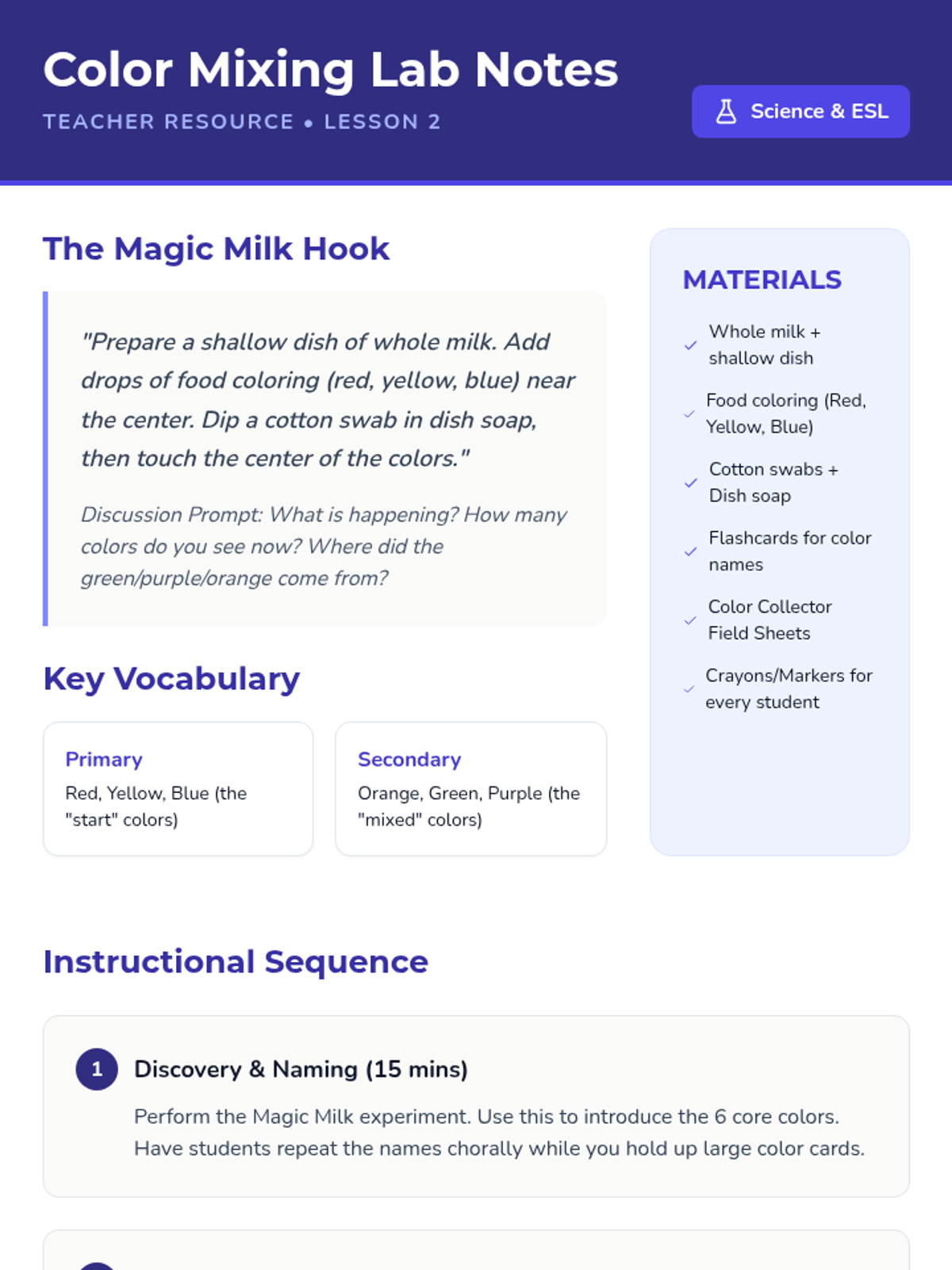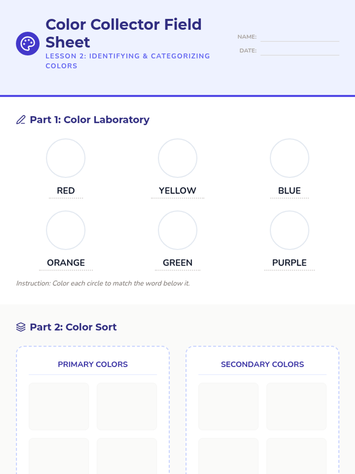 Students identify primary and secondary colors, learn color mixing, and categorize objects by hue.