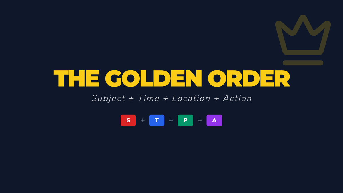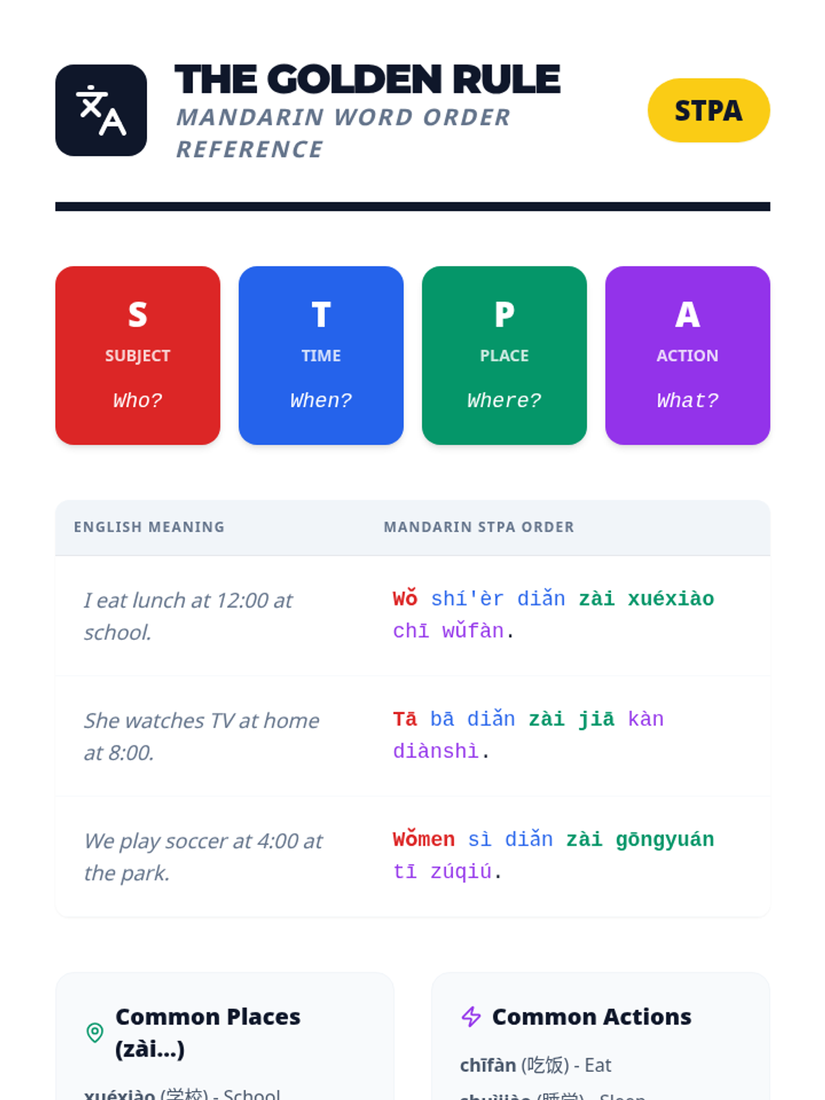 Integration of time and location into the STPA (Subject-Time-Place-Action) hierarchy. Students solve sentence puzzles and practice the 'Golden Rule' of Mandarin syntax.