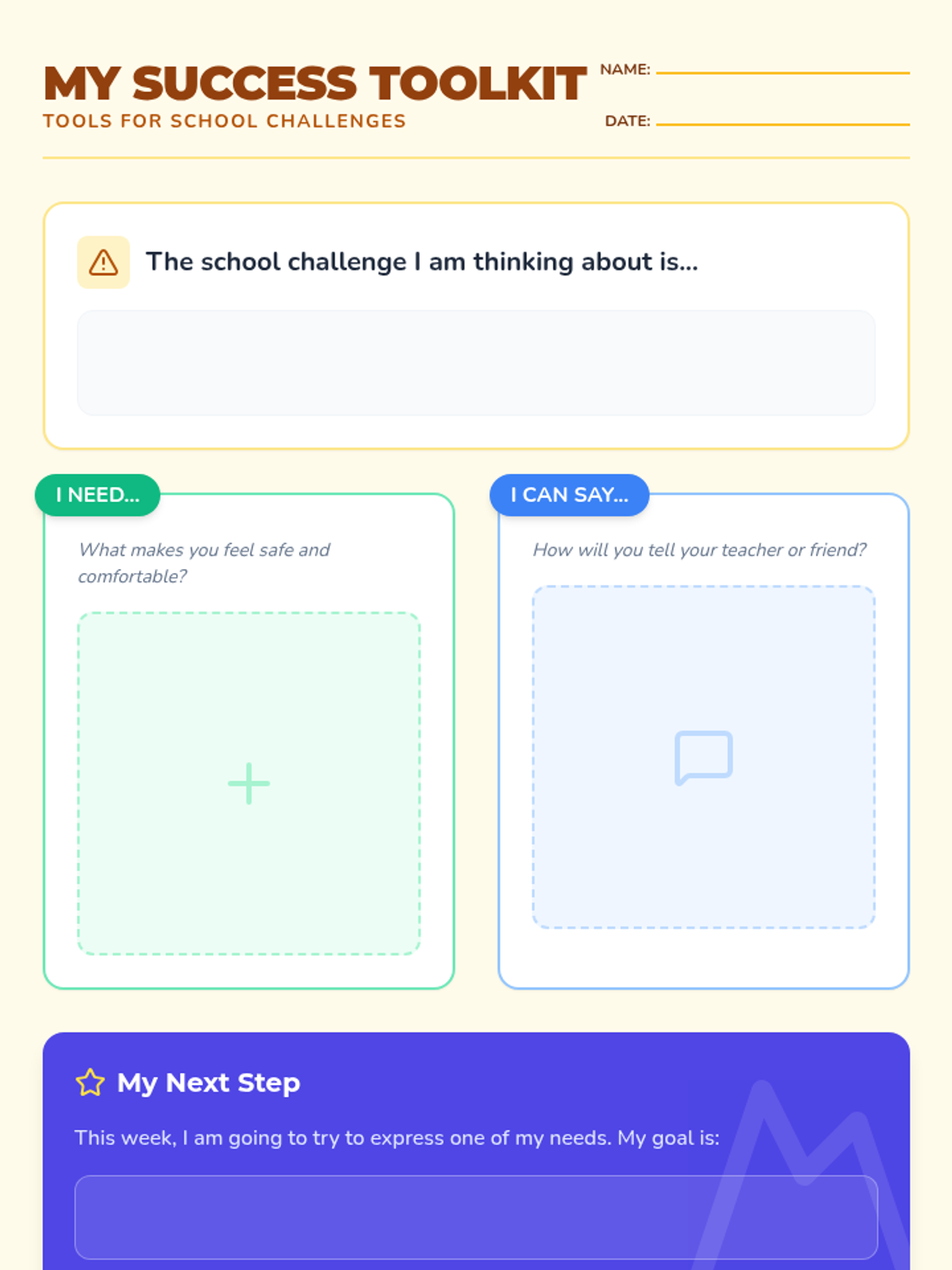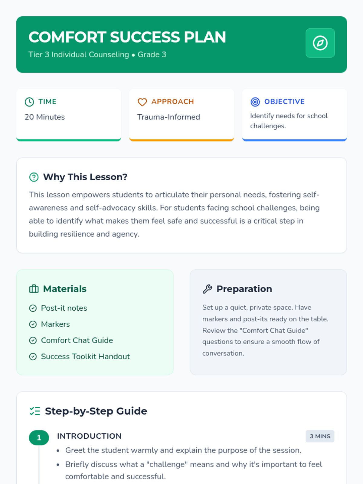 A Tier 3 individual counseling lesson for 3rd graders focused on identifying and articulating personal needs for comfort and success when facing school challenges.