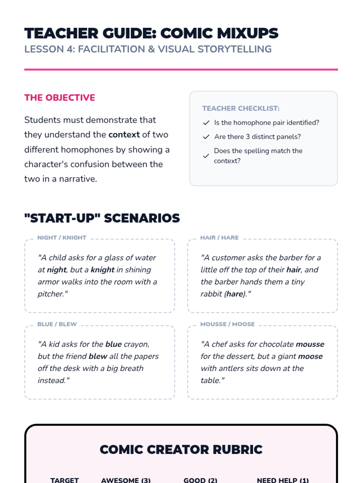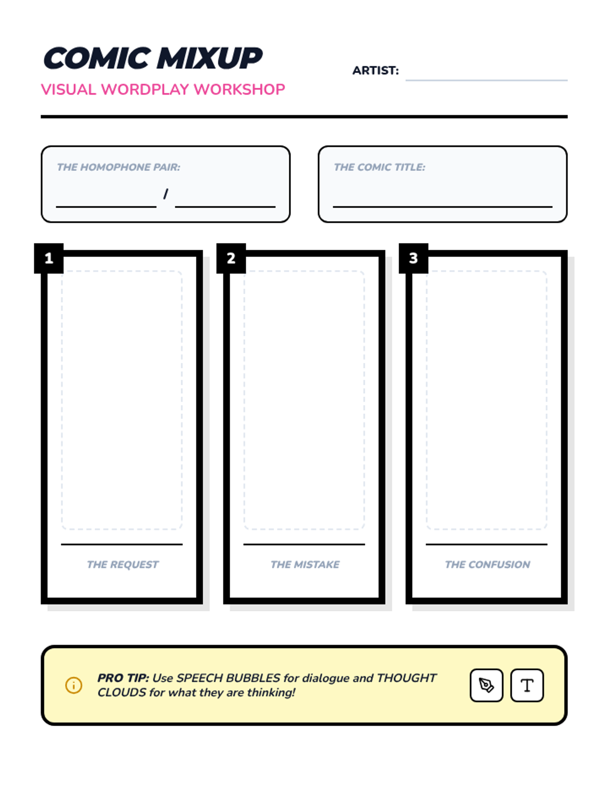 Students create 3-panel comic strips based on homophone mix-ups to demonstrate contextual understanding.