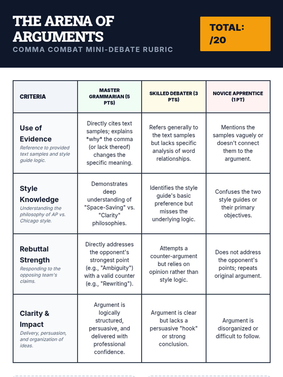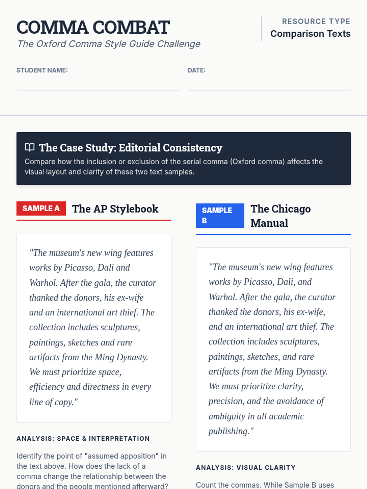 A high-stakes exploration of the Oxford comma debate, challenging students to evaluate style guides and defend linguistic choices through the lens of clarity versus efficiency.